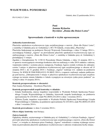 WOJEWODA POMORSKI Gdańsk, dnia 22 października 2014 r. PS-VI.9423.17.2014 Pani Joanna Rybacka Dyrektor „Domu dla Dzieci Lotos” Sprawozdanie z kontroli w trybie uproszczonym Jednostka kontrolowana: Placówka opiekuńczo-wychowawcza typu socjalizacyjnego o nazwie „Dom dla Dzieci Lotos”, z siedzibą w Gdańsku przy ul. Gołuńskiej 3, 80-178 Gdańsk, zwana dalej „Placówką”. Placówka funkcjonuje na podstawie Decyzji Wojewody Pomorskiego, z dnia 13 lutego 2014 r., zezwalającej Fundacji „Agawa” na prowadzenie placówki opiekuńczo-wychowawczej typu socjalizacyjnego o nazwie „Dom dla Dzieci Lotos”, z siedzibą w Gdańsku przy ul. Gołuńskiej 3, posiadającej 11 miejsc. Zgodnie z Zarządzeniem Nr 1158/14 Prezydenta Miasta Gdańska, z dnia 14 sierpnia 2013 r., w sprawie rozstrzygnięcia otwartego konkursu ofert na realizację w roku 2014 zadania z zakresu, wspierania rodziny i systemu pieczy zastępczej, Fundacja Agawa została wybrana do zabezpieczenia 3 miejsc w placówce opiekuńczo-wychowawczej typu socjalizacyjnego w okresie od 15 sierpnia 2014 r. do 31 grudnia 2014 r. Fundacja „Agawa” realizuje ww. zadanie na podstawie Umowy Nr RWB-W/3948/WRS/435/U-W.BIEŻ./2014 o wsparcie realizacji zadania publicznego pod nazwą: „Zabezpieczenie 3 miejsc w placówce opiekuńczo-wychowawczej typu socjalizacyjnego na terenie miasta Gdańska w lokalu wynajętym na otwartym rynku przez podmiot” zawartej w dniu 14 sierpnia 2014 r. Kontrolę przeprowadzono w obecności: Pani Joanny Rybackiej – Dyrektora Placówki. Kontrolę przeprowadził zespół kontrolny w składzie: Jolanta Szubstarska, starszy inspektor wojewódzki w Wydziale Polityki Społecznej Pomorskiego Urzędu Wojewódzkiego w Gdańsku, kierownik zespołu kontrolnego, na podstawie upoważnienia Nr 234/2014, znak PS.I.0030.234.2014 z dnia 1 września 2014 r. Elżbieta Żynda, inspektor wojewódzki w Wydziale Polityki Społecznej Pomorskiego Urzędu Wojewódzkiego w Gdańsku, na podstawie upoważnienia Nr 235/2014, znak PS.I.0030.235.2014 z dnia 1 września 2014 r. Kontrolę prowadzono: w dniu 2 września 2014 r. Okres objęty kontrolą: stan bieżący. Zakres kontroli: Oględziny obiektu, usytuowanego w Gdańsku przy ul. Gołuńskiej 3, w którym Fundacja „Agawa” prowadzi placówkę opiekuńczo-wychowawczej typu socjalizacyjnego o nazwie „Dom dla Dzieci Lotos”, w związku ze złożonym przez Fundację „Agawa” wnioskiem o zmianę wydanego zezwolenia na prowadzenie placówki opiekuńczo-wychowawczej w zakresie zwiększenia liczby miejsc. Kontrolą objęto następujące zagadnienia: Zbadanie warunków do zapewnienia opieki 14 wychowankom, zgodnie z § 18 ust. 3 rozporządzenia Ministra Pracy i Polityki Społecznej z dnia 22 grudnia 2011 r. w sprawie instytucjonalnej pieczy zastępczej (Dz. U. Nr 292 poz. 1720), w obiekcie, w którym Fundacja „Agawa” prowadzi placówkę opiekuńczo-wychowawczą typu socjalizacyjnego o nazwie „Dom dla Dzieci Lotos”, tj. w Gdańsku przy ul. Gołuńskiej 3. Ustalenia kontroli: W dniu 2 września 2014 r., zgodnie z art. 106 ust. 6 ustawy z dnia 9 czerwca 2011 r. o wspieraniu rodziny i systemie pieczy zastępczej (Dz. U. z 2013 r. poz. 135, z późn. zm.) zespół kontrolny dokonał oględzin budynku w Gdańsku przy ul. Gołuńskiej 3, w którym mieści się prowadzona przez Fundację „Agawa” placówka opiekuńczo-wychowawcza typu socjalizacyjnego. W ewidencji Placówki w dniu kontroli umieszczonych było 14 dzieci, w tym jeden wychowanek w młodzieżowym ośrodku wychowawczym, jedna wychowanka w młodzieżowym ośrodku socjoterapii i jeden wychowanek w ośrodku leczenia uzależnień. Obiekt, w którym prowadzona jest ww. placówka to budynek wolnostojący, jednorodzinny z terenem zielonym wokół. Na parterze budynku znajdują się: pokój czteroosobowy wychowanków z dwoma łóżkami piętrowymi, wyposażony w szafę, szafki, biurka i krzesła, obok pokój trzyosobowy z łóżkiem piętrowym i tapczanem wyposażony w szafki, szafy, biurka i krzesła. Po prawej stronie od wejścia jest kuchnia, w której znajduje się sprzęt kuchenny, w tym dwie kuchnie: gazowa i elektryczna, lodówka, zamrażarka, zmywarka, kuchnia mikrofalowa i stanowisko komputerowe dla dzieci. W dniu oględzin, kuchenka elektryczna nie miała kurków, zgodnie z wyjaśnieniami Dyrektora Placówki, z uwagi na bezpieczeństwo dzieci. W trakcie oględzin, Dyrektor Placówki zobowiązał się do założenia ww. kurków. Z kuchni jest wejście do jadalni usytuowanej w jednej wspólnej przestrzeni z pokojem wypoczynku. Na parterze jest też łazienka i pralnia z suszarnią. Na półpiętrze mieści się pokój wychowawców, w którym w szafach znajduje się dokumentacja dzieci i przechowywane są leki. Na piętrze budynku znajdują się: pokój trzyosobowy wychowanków z jednym łóżkiem piętrowym i tapczanem, wyposażony w szafę, szafki, biurko, krzesło, obok pokój dwuosobowy wychowanków, wyposażony w dwa łóżka, komodę, szafę, półki, biurko i krzesło, oraz kolejny pokój dwuosobowy wychowanków, wyposażony w dwa tapczany, szafy, szafki, półki, biurko, krzesła. Na piętrze znajduje się również łazienka dla wychowanków. W piwnicy budynku jest kotłownia zamykana na klucz oraz pomieszczenia gospodarcze, w których przechowywane są w oddzielnych pomieszczeniach: środki czystości, paczkowane produkty spożywcze, nieużywana odzież. W piwnicy jest też pomieszczenie, w którym docelowo ma być biblioteka, a obecnie jest magazynek, w którym w szafach stoją książki i do którego nie mają dostępu dzieci. Na podstawie przeprowadzonych oględzin ustalono, że zgodnie z § 18 ust. 3 ww. rozporządzenia, w budynku, w którym jest prowadzona Placówka, spełnione są warunki do zapewnienia dzieciom: 1) pokoi mieszkalnych, nie większych niż pięcioosobowe, właściwie oświetlonych, o powierzchni zapewniającej przechowywanie rzeczy osobistych i swobodne korzystanie z wyposażeni