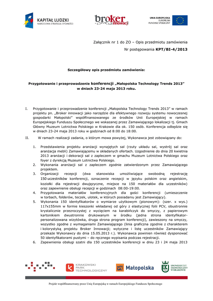 Załącznik nr 1 do ZO – Opis przedmiotu zamówienia Nr postępowania KPT/BI-4/2013 Szczegółowy opis przedmiotu zamówienia: Przygotowanie i przeprowadzenie konferencji „Małopolska Technology Trends 2013” w dniach 23-24 maja 2013 roku. I. Przygotowanie i przeprowadzenie konferencji „Małopolska Technology Trends 2013” w ramach projektu pn. „Broker innowacji jako narzędzie dla efektywnego rozwoju systemu nowoczesnej gospodarki Małopolski” współfinansowanego ze środków Unii Europejskiej w ramach Europejskiego Funduszu Społecznego we wskazanej przez Zamawiającego lokalizacji tj. Gmach Główny Muzeum Lotnictwa Polskiego w Krakowie dla ok. 150 osób. Konferencja odbędzie się w dniach 23-24 maja 2013 roku w godzinach od 8:00 do 18:00. II. W ramach realizacji zadania, o którym mowa powyżej, Wykonawca jest zobowiązany do: 1. 2. 3. Przedstawienia projektu aranżacji wynajętych sal (rzuty układu sal, wystrój sal oraz aranżacja mebli) Zamawiającemu w składanych ofertach. Uzgodnienie do dnia 20 kwietnia 2013 aranżacji i dekoracji sal z zapleczem w gmachu Muzeum Lotnictwa Polskiego oraz foyer z dyrekcją Muzeum Lotnictwa Polskiego. Wykonania aranżacji sal z zapleczem zgodnie zatwierdzonym przez Zamawiającego projektem. Organizacji recepcji (dwa stanowiska umożliwiające swobodną rejestrację 150 uczestników konferencji, oznaczenie recepcji w języku polskim oraz angielskim, 4. 5. 6. koziołki dla rejestracji dwujęzyczne, miejsce na 150 materiałów dla uczestników) oraz zapewnienie obsługi recepcji w godzinach 08:00-19:00. Przygotowania materiałów konferencyjnych dla gości konferencji (umieszczenie w torbach, folderów, teczek, ulotek, w których posiadaniu jest Zamawiający). Wykonania 150 identyfikatorów o wymiarze użytkowym (pionowym): (szer. x wys.) 117x155mm w formie kieszonki wkładanej od góry z elastycznej folii PCV, obustronnie krystalicznie przezroczystej z wycięciem na karabińczyk do smyczy, z papierowym kartonikiem dwustronnie drukowanym w środku (jedna strona identyfikatorpersonalizowana wizytówka, druga strona program konferencji), zawieszony na smyczy, wszystko zgodne z wymaganiami Zamawiającego (linia graficzna zgodnie z charakterem i kolorystyką projektu Broker Innowacji; wytyczne i listę uczestników Zamawiający przekaże Wykonawcy do dnia 15.05.2013 r.). Wykonawca powinien również dysponować 50 identyfikatorami pustymi – do ręcznego wypisania podczas rejestracji. Zapewnienia obsługi szatni dla 150 uczestników konferencji w dniu 23 i 24 maja 2013 Projekt współfinansowany przez Unię Europejską w ramach Europejskiego Funduszu Społecznego roku w godz. 800-1900. 7. Rozstawienia ścianki i trzech roll-upów wskazanych przez Zamawiającego. 8. Przygotowania w dniu 23 maja 2013 r. sali konferencyjnej wielofunkcyjnej z zapleczem w zakresie przedmiotu zamówienia, którego nie obejmuje umowa z Muzeum Lotnictwa, a której zakres został wskazany w pkt V, zgodnie z poniższymi punktami: a) Zapewnienie co najmniej 7 mikrofonów b) Zapewnienie co najmniej 5 przedłużaczy elektrycznych o długości nie mniejszej niż 1,5 m, które będzie w stanie udostępnić bez zbędnej zwłoki na życzenie Zamawiającego. c) Zapewnienie podestu wraz z miejscami do siedzenia, umożliwiającego przeprowadzenie paneli dyskusyjnych z udziałem siedmiu osób w odpowiedniej aranżacji sceny. d) Zapewnienie co najmniej 4 komputerów przenośnych (wraz z pakietem MS Office 2010), na których możliwe będzie puszczanie slajdów podczas głównych wystąpień oraz paneli dyskusyjnych 9. Przygotowania w dniu 24 maja 2013 r. trzech sal konferencyjnych: sali wielofunkcyjnej z zapleczem; sali edukacyjnej, sali kinowej z pełnym wyposażeniem technicznym dostępem do internetu wi-fi, rzutnikiem, nagłośnieniem, ekranem projekcyjnym, 3 mikrofonami bezprzewodowymi na daną salę oraz 3 flipchartami z kompletem pisaków i papierem), zgodnie z projektem Wykonawca zapewni wydzielone miejsce dla 6 panelistów oraz dla prowadzącego w każdej z sal. 10. Zapewnienia osoby do obsługi technicznej wydarzenia odpowiedzialnej za: a) sprawne funkcjonowanie całej infrastruktury technicznej dostarczanej przez Wykonawcę, b) dbałość o prawidłową organizację wydarzenia pod względem technicznym, w tym wykonywanie czynności związanych z przeprowadzeniem paneli dyskusyjnych oraz wystąpień podczas konferencji, takich jak instalowanie prezentacji poszczególnych prelegentów, przełączanie slajdów itp. 11. Przygotowania dogodnej przestrzeni wraz ze stosowną dekoracją stołów z wykorzystaniem stylistyki projektu do świadczenia usługi cateringowej (obrus, dekoracja z oryginalnych liści i świeżych kwiatów, porcelanowa zastawa). a. W dniu 23 maja 2013 roku na I piętrze obok sali wielofunkcyjnej: Organizacja dwóch przerw kawowych dla 150 osób – na powitanie gości i przerwę pomiędzy panelami, składających się co najmniej z: wody mineralnej z cząstkami limonek i cytryn, soków owocowych, kawy, herbaty w różnych smakach, kruchych ciasteczek, owoców sezonowych, rogalików z czekoladą, jabłkami, serem i konfiturami, tartinek (na białym i ciemnym pieczywie) oraz innych przekąsek – w tym zakresie, po podpisaniu umowy, Wykonawca zobowiązany jest przedstawić Zamawiającemu 3 propozycje menu do wyboru– o wartości 30 zł/osobę brutto Organizacji lunchu podczas konferencji dla 150 osób (przekąska, dwa dania główne do wyboru mięsne i wegetariańskie, trzy rodzaje soków, woda gazowana i niegazowana, deser, świeże owoce – w tym zakresie, po podpisaniu umowy, Wykonawca zobowiązany jest przedstawić Zamawiającemu 3 propozycje menu do wyboru o wartości 50zł/osobę brutto), b. W dniu 24 maja 2013 roku na I piętrze obok sali wielofunkcyjnej oraz barek kawowy w sali edukacyjnej na parterze. Projekt współfinansowany przez Unię Europejską w ramach Europejskiego Funduszu Społecznego Organizację dwóch przerw kawowych dla 150 osó