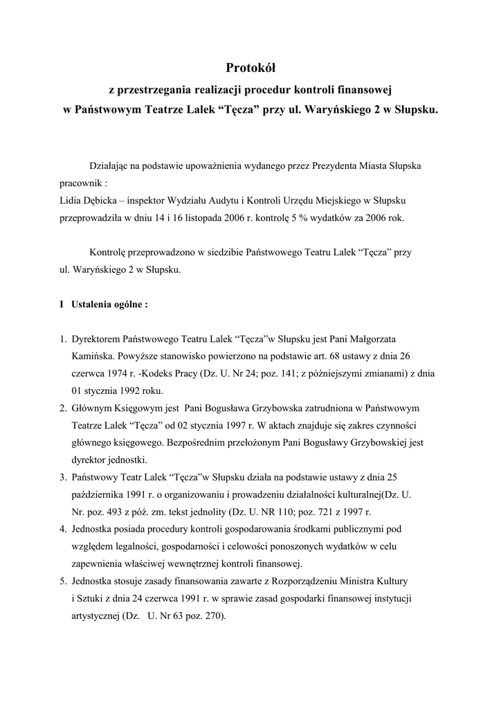 Protokół z przestrzegania realizacji procedur kontroli finansowej w Państwowym Teatrze Lalek “Tęcza” przy ul. Waryńskiego 2 w Słupsku. Działając na podstawie upoważnienia wydanego przez Prezydenta Miasta Słupska pracownik : Lidia Dębicka – inspektor Wydziału Audytu i Kontroli Urzędu Miejskiego w Słupsku przeprowadziła w dniu 14 i 16 listopada 2006 r. kontrolę 5 % wydatków za 2006 rok. Kontrolę przeprowadzono w siedzibie Państwowego Teatru Lalek “Tęcza” przy ul. Waryńskiego 2 w Słupsku. I Ustalenia ogólne : 1. Dyrektorem Państwowego Teatru Lalek “Tęcza”w Słupsku jest Pani Małgorzata Kamińska. Powyższe stanowisko powierzono na podstawie art. 68 ustawy z dnia 26 czerwca 1974 r. -Kodeks Pracy (Dz. U. Nr 24; poz. 141; z późniejszymi zmianami) z dnia 01 stycznia 1992 roku. 2. Głównym Księgowym jest Pani Bogusława Grzybowska zatrudniona w Państwowym Teatrze Lalek “Tęcza” od 02 stycznia 1997 r. W aktach znajduje się zakres czynności głównego księgowego. Bezpośrednim przełożonym Pani Bogusławy Grzybowskiej jest dyrektor jednostki. 3. Państwowy Teatr Lalek “Tęcza”w Słupsku działa na podstawie ustawy z dnia 25 października 1991 r. o organizowaniu i prowadzeniu działalności kulturalnej(Dz. U. Nr. poz. 493 z póź. zm. tekst jednolity (Dz. U. NR 110; poz. 721 z 1997 r. 4. Jednostka posiada procedury kontroli gospodarowania środkami publicznymi pod względem legalności, gospodarności i celowości ponoszonych wydatków w celu zapewnienia właściwej wewnętrznej kontroli finansowej. 5. Jednostka stosuje zasady finansowania zawarte z Rozporządzeniu Ministra Kultury i Sztuki z dnia 24 czerwca 1991 r. w sprawie zasad gospodarki finansowej instytucji artystycznej (Dz. U. Nr 63 poz. 270). 6. Kontrolę wewnętrzną w ramach uprawnień i kompetencji sprawują dyrektor, główny księgowy i kierownicy komórek organizacyjnych. II Ustalenia szczegółowe : Kontrolę wydatków jednostki w 2006 roku w zakresie gospodarowania środkami publicznymi przeprowadzono na podstawie art. 46 ust. 1 i 2 ustawy o finansach publicznych z dnia 30 czerwca 2005 roku. Kontrolę przeprowadzono sposobem wyrywkowym badając dowody księgowe za 2006 r. Badaniem objęto 5 % wydatków na rok 2006. Na podstawie planu przychodów i wydatków instytucji kultury na rok 2006, po zmianie wydatki wynoszą : rozdział 92106 1.517.061,00 1.517.061,00 x 5 % = 75.853,05 Kontroli poddano wynagrodzenia za miesiąc czerwiec 2006 roku : ●Lista zbiorcza -brutto 64.085,77 -netto 41.332,91 -zaliczka na podatek dochodowy 3.294,00 -ZUS pracownika 11.990,38 -zdrowotne 4.438,34 -potrącenia 3.197,50 ●Lista - nagroda jubileuszowa -brutto 3.574,60 -netto 2.895,60 -zaliczka na podatek 679,00 ●Lista dodatkowa – nagr. jubileuszowa i prowizje -brutto 3.457,09 -netto 2.531,49 -zaliczka na podatek 477,00 ●Lista – umowy zlecenie -brutto 67.030,80 -netto 44.857,30 -zaliczka na podatek 4.890,00 -ZUS pracownika 12.514,26 -zdrowotne 4.769,24 Sprawdzona kwota wydatków brutto wynosi 138.148,26 Wynagrodzenia za miesiąc czerwiec 2006 roku przekazano w następujących kwotach: -WB nr 0092/2006 za okres 10-12.06.2006 r., za umowy zlecenie, poz. fin. BK/92/06/06 w wysokości 23.607,87 -WB nr 0093/2006 za okres 13-13.06.2006 r., za umowy zlecenie, poz. fin. BK/93/06/06 w wysokości 11.672,74 -WB nr 0094/2006 za okres 14-14.06.2006 r. za umowy zlecenie, poz. fin. BK/94/06/06 w wysokości 6.243,83 -WB nr 0101/2006 za okres 28-28.06.2006 r. za umowy zlecenie, poz. fin. BK/101/06/06 w wysokości 326,68 -WB nr WB nr 0099/2006 za okres 23-26.06.2006 r. za umowy o pracę, poz. fin. BK/99/06/06 w wysokości 39.364,72 -WB nr 0102/2006 za okres 29-30.06.2006 r. za umowy o pracę, poz. fin. BK/102/06/06 w wysokości 2.895,00 -RK nr 19 za okres 01-09.06.2006 r. za umowy zlecenie, w wysokości 2.434,82 -RK nr 20 za okres 13-14.06.2006 r. za umowy o pracę w wysokości 454,95 za u mowy zlecenie w wysokości 477,23 -RK nr 22 za okres 26-30.06.2006 r. za umowy zlecenie, w wysokości 94,85 za umowy o pracę, w wysokości 4.044,70 Listy wypłat wynagrodzeń są sporządzone prawidłowo, zawierają datę sporządzenia i wypłaty, są opieczętowane i podpisane. Podczas przeprowadzonych czynności kontrolnych i po dokonaniu szczegółowej analizy dokumentacji źródłowej – nieprawidłowości nie stwierdzono. Wynagrodzenia w Państwowym Teatrze Lalek „Tęcza” przy ul. Waryńskiego 2 w Słupsku wypłacane są zgodnie z obowiązującymi przepisami prawa i aktami wewnętrznymi jednostki. Wyrywkowej kontroli poddano naliczenie wynagrodzeń w miesiącu czerwcu 2006 roku następujących pracowników: Dyrektor – nr akt - 1 kategoria zaszeregowania- XIX wynagrodzenia zasadnicze 2. 690,00 dodatek stażowy- 538,002 dodatek funkcyjny- 1.345,00 Główny księgowy – Nr akt - 2 wynagrodzenie zasadnicze- 2.800,00 kategoria zaszeregowania- XVIII dodatek stażowy- 560,00 dodatek funkcyjny- 1.120,00 Aktor wynagrodzenie zasadnicze- 1.760,00 dodatek stażowy- 228,80 Aktor wynagrodzenie- 2.150,00 dodatek stażowy- 430,00 W trakcie kontroli stwierdzono, że naliczone na listach płac kwoty w/w pracowników są zgodne z angażami znajdującymi się w aktach osobowych – nieprawidłowości nie stwierdzono. Stawki wynagrodzeń zgodne są z kategorią zaszeregowania, tabel wynagrodzeń zasadniczych. W toku przeprowadzonych czynności kontrolnych - nieprawidłowości nie stwierdzono. Na tym protokół zakończono. Kontrolę odnotowano w książce kontroli. Protokół sporządzono w dwóch jednobrzmiących egzemplarzach po jednym dla każdej ze stron. Kierownika jednostki poinformowano o możliwości odmowy podpisania protokołu i złożenia na tę okoliczność stosownego pisemnego wyjaśnienia. Pouczono o prawie zgłoszenia w ciągu 7 dni od daty podpisania zastrzeżeń, co do zawartych treści w protokole. Protokół pozostawiono bez zaleceń pokontrolnych. Jednostka kontrolowana : Dyrektor- mgr Małgorzata Kamińska-So