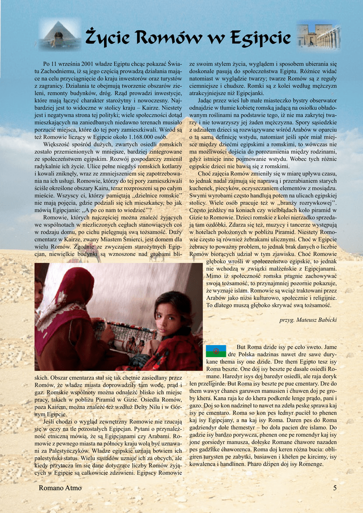 . Zycie Romów w Egipcie Po 11 września 2001 władze Egiptu chcąc pokazać Światu Zachodniemu, iż są jego częścią prowadzą działania mające na celu przyciągnięcie do kraju inwestorów oraz turystów z zagranicy. Działania te obejmują tworzenie obszarów zieleni, remonty budynków, dróg. Rząd prowadzi inwestycje, które mają łączyć charakter starożytny i nowoczesny. Najbardziej jest to widoczne w stolicy kraju – Kairze. Niestety jest i negatywna strona tej polityki; wiele społeczności dotąd mieszkających na zaniedbanych niedawno terenach musiało porzucić miejsca, które do tej pory zamieszkiwali. Wśród są też Romowie liczący w Egipcie około 1.168.000 osób. Większość spośród dużych, zwartych osiedli romskich zostało przemienionych w mniejsze, bardziej zintegrowane ze społeczeństwem egipskim. Rozwój gospodarczy zmienił radykalnie ich życie. Ulice pełne niegdyś romskich kotlarzy i kowali zniknęły, wraz ze zmniejszeniem się zapotrzebowania na ich usługi. Romowie, którzy do tej pory zamieszkiwali ściśle określone obszary Kairu, teraz rozproszeni są po całym mieście. Wszyscy ci, którzy pamiętają ,,dzielnice romskie’’ nie mają pojęcia, gdzie podziali się ich mieszkańcy, bo jak mówią Egipcjanie: ,,A po co nam to wiedzieć’’? Romowie, których najczęściej można znaleźć żyjących we wspólnotach w niezliczonych cegłach stanowiących coś w rodzaju domu, po cichu pielęgnują swą tożsamość. Duży cmentarz w Kairze, zwany Miastem Śmierci, jest domem dla wielu Romów. Zgodnie ze zwyczajem starożytnych Egipcjan, niewielkie budynki są wznoszone nad grobami bli- ze swoim stylem życia, wyglądem i sposobem ubierania się doskonale pasują do społeczeństwa Egiptu. Różnice widać natomiast w wyglądzie twarzy; twarze Romów są z reguły ciemniejsze i chudsze. Romki są z kolei według mężczyzn atrakcyjniejsze niż Egipcjanki. Jadąc przez wieś lub małe miasteczko bystry obserwator odnajdzie w tłumie kobietę romską jadącą na osiołku obładowanym roślinami na podstawie tego, iż nie ma zakrytej twarzy i nie towarzyszy jej żaden mężczyzna. Spory sąsiedzkie z udziałem dzieci są rozwiązywane wśród Arabów w oparciu o tą samą definicję wstydu, natomiast jeśli spór miał miejsce między dziećmi egipskimi a romskimi, to wówczas nie ma możliwości dojścia do porozumienia między rodzinami, gdyż istnieje inne pojmowanie wstydu. Wobec tych różnic egipskie dzieci nie bawią się z romskimi. Choć zajęcia Romów zmieniły się w miarę upływu czasu, to jednak nadal zajmują się naprawą i przerabianiem starych kuchenek, piecyków, oczyszczaniem elementów z mosiądzu. Swymi wyrobami często handlują potem na ulicach egipskiej stolicy. Wiele osób pracuje też w ,,branży rozrywkowej’’. Często jeźdźcy na koniach czy wielbłądach koło piramid w Gizie to Romowie. Dzieci romskie z kolei nierzadko sprzedają tam ozdóbki. Zdarza się też, muzycy i tancerze występują w hotelach położonych w pobliżu Piramid. Niestety Romowie często są również żebrakami ulicznymi. Choć w Egipcie żebracy to poważny problem, to jednak brak danych o liczbie Romów biorących udział w tym zjawisku. Choć Romowie głęboko wrośli w społeczeństwo egipskie, to jednak nie wchodzą w związki małżeńskie z Egipcjanami. Mimo iż społeczność romska pragnie zachowywać swoją tożsamość, to przynajmniej pozornie pokazuje, że wyznaje islam. Romowie są wciąż traktowani przez Arabów jako niżsi kulturowo, społecznie i religijnie. To dlatego muszą głęboko skrywać swą tożsamość. przyg. Mateusz Babicki skich. Obszar cmentarza stał się tak chętnie zasiedlany przez Romów, że władze miasta doprowadziły tam wodę, prąd i gaz. Romskie wspólnoty można odnaleźć blisko ich miejsc pracy, takich w pobliżu Piramid w Gizie. Osiedla Romów, poza Kairem, można znaleźć też wzdłuż Delty Nilu i w Górnym Egipcie. Jeśli chodzi o wygląd zewnętrzny Romowie nie rzucają się w oczy na tle pozostałych Egipcjan. Pytani o przynależność etniczną mówią, że są Egipcjanami czy Arabami. Romowie z pewnego miasta na północy kraju wolą być uznawani za Palestyńczyków. Władze egipskie uznają bowiem ich palestyński status. Wielu sąsiadów uznaje ich za obcych, ale kiedy przytacza im się dane dotyczące liczby Romów żyjących w Egipcie są całkowicie zdziwieni. Egipscy Romowie Romano Atmo But Roma dzide isy pe ceło sweto. Jame dre Polska nadzinas nawet dre sawe durykane thema isy one dzide. Dre them Egipto tesz isy Roma beszte. One doj isy beszte pe dasałe osiedli Romane. Haredyr isys doj baredyr osiedli, ale raja doryk łen przeligirde. But Roma isy beszte pe pue cmentary. Dre do them wawyr ćhanes garuwen manusien i ćhuwen doj pe groby khera. Kana raja ke do khera podkerde łenge prądo, pani i gazo. Doj so kon nadzineł to nawet na zdeła peske sprawa kaj isy pe cmentaro. Roma so kon pes łednyr pucieł to phenen kaj isy Egipcjany, a na kaj isy Roma. Daren pes do Roma gadziendyr dołe themestyr – bo doła pacien dre islamo. Do gadzie isy bardzo porywcza, phenen one pe romendyr kaj isy jone gorsiedyr manusza, dołeske Romane ćhawore nazaden pes gadzitke ćhaworenca. Roma doj keren różna bucia: obligiren turysten pe zabytki, basiawen i khełen pe kircimy, isy kowalenca i handlinen. Pharo dźipen doj isy Romenge.