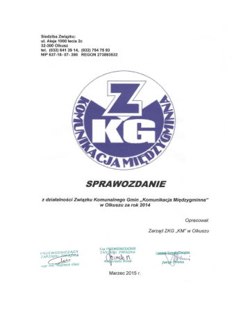 SPIS TREŚCI 1. Wprowadzenie. 2. Plan zrównoważonego rozwoju publicznego transportu zbiorowego na obszarze Związku Komunalnego Gmin „Komunikacja Międzygminna” w Olkuszu na lata 20132023. 3. Organizacja komunikacji miejskiej. 4. Wykonawcy usług przewozowych. 5. Kontrola realizacji usług przewozowych. 6. Gospodarka biletowa. 7. Analiza kontroli biletów. 8. Udział gmin w kosztach organizowanej komunikacji. 9. Analiza realizacji przewozów w systemie „netto". 10. Ocena jakości świadczonych usług w komunikacji miejskiej. 11. Kontrola działalności Związku. 12. Sprawozdanie finansowe. 13. Podsumowanie. 2 Sprawozdanie z działalności Związku Komunalnego Gmin „Komunikacja Międzygminna” w Olkuszu za rok 2014 1. WPROWADZENIE Związek Komunalny Gmin „Komunikacja Międzygminna” w Olkuszu, został utworzony w 1998 roku w celu realizacji zadania publicznego: lokalny transport zbiorowy. Publicznym transportem zbiorowym jest powszechnie dostępny regularny przewóz osób wykonywany w określonych odstępach czasu i po określonych liniach komunikacyjnych lub sieci komunikacyjnej. Związek działa na podstawie przepisów ustawy z dnia 8 marca 1990 r. o samorządzie gminnym w zakresie dotyczącym związków międzygminnych. Prawa i obowiązki Gmin uczestniczących w Związku związane z wykonywaniem zadania własnego przeszły na Związek z dniem ogłoszenia statutu Związku (Dziennik Urzędowy Województwa Katowickiego nr 6/98). Związek został wpisany do rejestru Związków Międzygminnych pod poz. 174 z datą 28.01.1998 r. przez Ministerstwo Spraw Wewnętrznych i Administracji - Departament Administracji Publicznej. Związek nabył osobowość prawną po zarejestrowaniu z datą ogłoszenia statutu w trybie i na zasadach ustalonych na wniosek Ministra Spraw Wewnętrznych i Administracji przez Prezesa Rady Ministrów. Działalność statutową Związek rozpoczął w kwietniu 1998 roku. Na mocy uchwał podjętych przez Rady Gmin – Członków Związku dokonano zmian w statucie Związku, które zostały wprowadzone 01.08.2002r. i ogłoszone w Dzienniku Urzędowym Województwa Małopolskiego nr 163 z dnia 22 sierpnia 2002 roku (określono zadania Związku) oraz 13.04.2005 r. ogłoszone w Dzienniku Urzędowym Województwa Małopolskiego nr 212 z dnia 19 kwietnia 2005 r. (określono organy nadzoru Związku, dodano nowe zadania Związku). Zgodnie z § 6 Statutu Związku, zadaniem Związku jest wykonywanie zadań publicznych w zakresie lokalnego transportu zbiorowego na obszarze Gmin – członków Związku: Olkusz, Bolesław, Bukowno i Klucze. Zadania Związku obejmują w szczególności: a) organizację lokalnego transportu zbiorowego, b) wykonywanie czynności koordynacji (na dzień dzisiejszy niezgodne z ustawą) i uzgadniania rozkładów jazdy, c) badanie natężenia ruchu pasażerów, d) opracowywanie rozkładów jazdy, e) emisję i dystrybucję biletów, f) zawieranie umów na wykonywanie usług przewozowych w trybie odrębnych przepisów, g) marketing usług przewozowych, h) opracowywanie taryfy biletowej, i) ustalanie cen urzędowych, j) kontrolę realizacji usług przewozowych, k) kontrola biletowa, l) administrowanie przystankami i dworcami autobusowymi, 3 ł) przeprowadzanie analiz sytuacji rynkowej w zakresie regularnego przewozu osób i innych czynności o podobnym charakterze wynikających z odrębnych przepisów prawa dotyczących lokalnego transportu zbiorowego, m) dokonywanie uzgodnień zezwoleń i innych decyzji na wykonywanie przewozu osób, dla których właściwe są organy gmin – członków związku, po uprzedniej konsultacji z tymi organami. W związku z wejściem w życie Ustawy z dnia 16 grudnia 2010 r. o publicznym transporcie zbiorowym opracowano nowy Statut uwzględniający przepisy prawa wynikające z cyt. wyżej Ustawy, jak również dostosowano go do innych obowiązujących norm prawnych. Znowelizowany Statut przyjęty został przez Gminy Bolesław, Bukowno i Olkusz. Brakuje uchwały Rady Gminy Klucze. Uchwały zebrane ze wszystkich gmin są podstawą do ogłoszenia w Dzienniku Urzędowym Województwa Małopolskiego znowelizowanego Statutu zgodnie z obowiązującymi ustawami. 2. PLAN ZRÓWNOWAŻONEGO ROZWOJU PUBLICZNEGO TRANSPORTU ZBIOROWEGO NA OBSZARZE ZWIĄZKU KOMUNALNEGO GMIN „KOMUNIKACJA MIĘDZYGMINNA” W OLKUSZU NA LATA 2013-2023 Organizowanie, a w szczególności finansowanie komunikacji miejskiej wymaga opracowania planu zrównoważonego rozwoju transportu zbiorowego. Plan zrównoważonego rozwoju publicznego transportu zbiorowego na obszarze Związku Komunalnego Gmin „Komunikacja Międzygminna” w Olkuszu na lata 2013 – 2023 został uchwalony w dniu 22 listopada 2012r. przez Zgromadzenie Związku Uchwałą NR LXXXVIII/318/2012 i opublikowany w Dzienniku Urzędowym Województwa Małopolskiego pod poz. 391 w dniu 10 stycznia 2013 r. Plan ten stanowi prawo miejscowe na terenie gmin: Olkusz, Klucze, Bolesław, Bukowno. Celem głównym tegoż planu jest zapewnienie racjonalnego podziału zadań przewozowych pomiędzy transport zbiorowy i transport indywidualny. Celami uzupełniającymi są: Zapewnienie mobilności komunikacyjnej mieszkańców z równoczesnym ograniczeniem jej negatywnych następstw w postaci kongestii, wypadków komunikacyjnych i szkód środowiskowych. Preferowanie komunikacji miejskiej w centrum Olkusza. Zwiększenie efektywności ekonomicznej komunikacji miejskiej. Oczekiwane rezultaty to: - wzrost udziału podróży odbywanych komunikacją miejską, - dostosowanie komunikacji miejskiej do obecnych i przyszłych potrzeb mieszkańców, - poprawa jakości i efektywności usług w publicznym transporcie zbiorowym ze szczególnym uwzględnieniem potrzeb osób niepełnosprawnych, - zwiększenie roli transportu publicznego. Wyciąg z Planu: Plan „Zrównoważonego rozwoju publicznego transportu zbiorowego” (dalej zwany „planem transportowym”) jest aktem prawa miejscowego. Z chwilą jego uchwalenia jest źródłem z