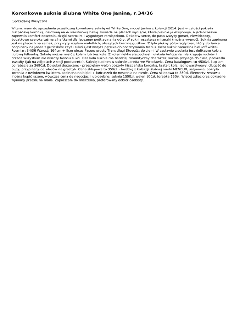 Koronkowa suknia ślubna White One Janina, r.34/36 [Sprzedam] Klasyczna Witam, mam do sprzedania prześliczną koronkową suknię od White One, model Janina z kolekcji 2014. Jest w całości pokryta hiszpańską koronką, nałożoną na 4- warstwową halkę. Posiada na plecach wycięcie, które pięknie je eksponuje, a jednocześnie zapewnia komfort noszenia, dzięki szerokim i wygodnym ramiączkom. Dekolt w serce, do pasa wszyty gorset, niewidoczny, dodatkowo szeroka taśma z haftkami dla lepszego podtrzymania góry. W sukni wszyte są miseczki (można wypruć). Suknia zapinana jest na plecach na zamek, przykryty rzędem malutkich, obszytych tkaniną guzików. Z tyłu piękny półokragły tren, który do tańca podpinany na jeden z guziczków z tyłu sukni (jest wszyta pętelka do podtrzymania trenu). Kolor sukni: naturalna biel (off white) Rozmiar: 34/36 Wzrost: 164cm + 8cm obcas Fason: prosty Tren: długi Długość: do ziemi W zestawie z suknią jest delikatne koło z tiulową falbanką. Suknię można nosić z kołem lub bez koła. Z kołem lekko sie podnosi i ułatwia tańczenie, nie krępuje ruchów i przede wszystkim nie niszczy fasonu sukni. Bez koła suknia ma bardziej romantyczny charakter, suknia przylega do ciała, podkreśla kształty (jak na zdjęciach z sesji producenta). Suknię kupiłam w salonie Loretta we Wrocławiu. Cena katalogowa to 4500zl, kupilam po rabacie za 3690zł. Do sukni dorzucam: - przepiękny welon obszyty hiszpańską koronką, kształt koła, jednowarstwowy, długość do pupy, przypinany do włosów na grzebyk. Cena sklepowa to 350zł. - torebkę z kolekcji ślubnej marki MENBUR, satynowa, pokryta koronką z ozdobnym kwiatem, zapinana na bigiel + łańcuszek do noszenia na ramie. Cena sklepowa to 369zl. Elementy zestawu można kupić razem, wówczas cena do negocjacji lub osobno: suknia 1500zł, welon 100zł, torebka 150zł. Więcej zdjęć oraz dokładne wymiary prześlę na maila. Zapraszam do mierzenia, preferowany odbiór osobisty. Informacje dodatkowe Ilość 1 Stan Używany Adres ogłoszenia http://todoslubu.pl/koronkowa-suknia-slubna-white-one-janina-r34-36,o432 Kontakt Mail: [email protected] Telefon: Lokalizacja , Wrocław Dolnośląskie (pl) Ogłoszenie dodano: 2016-11-27 17:58:08 Ogłoszenie wygasa: 2026-08-27 17:58:08 Powered by TCPDF (www.tcpdf.org)