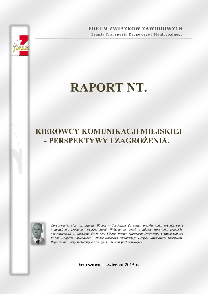 FORUM ZWIĄZKÓW ZAWODOWYCH B r a nż a T r an sp o r tu D r o go w e go i Mu ni cyp al ne g o RAPORT NT. KIEROWCY KOMUNIKACJI MIEJSKIEJ - PERSPEKTYWY I ZAGROŻENIA. Opracowanie: Mgr inż. Marcin Wróbel – Specjalista do spraw projektowania, organizowania i zarządzania procesami transportowymi. Wykładowca, coach z zakresu stosowania przepisów obowiązujących w przewozie drogowym. Ekspert branży Transportu Drogowego i Municypalnego Forum Związków Zawodowych. Członek Honorowy Niezależnego Związku Zawodowego Kierowców. Reprezentant strony społecznej w Komisjach i Podkomisjach Sejmowych. Warszawa – kwiecień 2015 r. SPIS TREŚCI WSTĘP…………………………………………………………………...……………….…3 ROZDZIAŁ I. PLAN BADANIA…………………………………………..………………………….…..4 CELE BADANIA………………………………………………………………………….…..4 METODOLOGIA PRACY BADAWCZEJ ……………………………………………….…..4 ROZDZIAŁ II. WYNIKI BADANIA……………………………………………………………………...6 CZĘŚĆ I. KIEROWCY KOMUNIKACJI MIEJSKIEJ - DOSTĘP DO ZAWODU .................................6 Kierowca – definicja …………………………………………………………………………..6 Prawo jazdy - szkolenie i uprawnienia ………………………………………………………..7 Kurs kwalifikacyjny i szkolenia okresowe…………………………………………………...14 Wymagania zdrowotne……………………………………………………………………….16 CZĘŚĆ II. KIEROWCY KOMUNIKACJI MIEJSKIEJ - CZAS PRACY ……………………………...17 Czas pracy, czas jazdy, dyżur………………………………………………………………...17 Przerwy i odpoczynek………………………………………………………………………...19 Systemy i rozkłady czasu pracy………………………………………………………………21 CZĘŚĆ III. KIEROWCY KOMUNIKACJI MIEJSKIEJ - PERSPEKTYWY I ZAGROŻENIA ……….24 Wynagrodzenie za pracę……………………………………………………………………...25 Praca o szczególnym charakterze ……………………………………………………………27 Prawa emerytalne……………………………………………………………………………..28 ROZDZIAŁ III. WNIOSKI I REKOMENDACJE………………………………………………….....30 ZAKOŃCZENIE………………………………………………………………………....34 ZAŁĄCZNIK - Materiały źródłowe…………………………………………………...35 WSTĘP. Raport przedstawia analizę wyników badań dotyczących szans i zagrożeń występujących w zawodzie kierowcy komunikacji miejskiej. Dodatkowo obrazuje problematykę dojścia do zawodu. Ponadto przedstawia w jakich warunkach bytowo - socjalnych respondenci wykonują pracę w zawodzie kierowcy komunikacji miejskiej na trasach do 50 km. Jednocześnie jest próbą odpowiedzi na pytanie czy dzisiaj praca w charakterze kierowcy komunikacji miejskiej może stanowić źródło utrzymania i satysfakcji z racji wykonywania zawodu. Na potrzeby raportu przyjęto definicję kierowcy komunikacji miejskiej wynikającą z posiadanych uprawnień oraz ze względu na rodzaj wykonywanego przewozu. Założono, iż respondenci posiadają prawo jazdy kat. „D”, odpowiednie kwalifikacje i predyspozycje oraz nie posiadają przeciwwskazań zdrowotnych do wykonywania zawodu. Przyjęto, że ich podstawowym zajęciem zarobkowym jest wykonywanie przewozów regularnych w krajowym transporcie osób na trasach nieprzekraczających 50 km. Częste zmiany prawa obserwowane w Polsce oraz Unii Europejskiej doprowadziły do spadku zainteresowania problematyką pracy kierowcy. Z jednej strony organizacje skupiające w swoich strukturach pracodawców sektora usług transportu publicznego, związki zawodowe kierowców występujące o ustalenie norm prawnych odpowiednich dla realizacji swoich celów statutowych zaś z drugiej strony sami zainteresowani zawodem poszukujący w ogólnym systemie swoich perspektyw. Nie sposób wspomnieć o akcesji Polski do Unii Europejskiej która to otworzyła drzwi polskim kierowcą do poszukiwania pracy na rynkach zachodnich. Związane jest ono przede wszystkim z różnicą wynagrodzeń w stosunku do wynagrodzenia otrzymywanego w Polsce. Niewątpliwie zjawisko to wywarło duży wpływ na rosnące zapotrzebowanie na zawodowych kierowców w kraju. Niniejszy raport odpowiada na pytania: dlaczego pogłębia się deficyt kierowców posiadających praw jazdy kat. „D”, jakie są przyczyny i skutki. Czy kierowcy uzyskali dostateczną pomoc i gwarancję stabilności zatrudnienia od Państwa. Zawiera prezentację wyników, które miały stanowić przede wszystkim diagnozę stanu sytuacji społecznoekonomicznej osób wykonujących zawód kierowcy publicznej komunikacji miejskiej. Raport zbudowany jest z trzech rozdziałów. Rozdział pierwszy zawiera opis i metody przeprowadzonych badań oraz sposób analizy materiału. Rozdział drugi składa się z trzech części. Pierwsza ogólnie charakteryzuje zawód kierowcy autobusu. Obrazuje drogę do uzyskania uprawnień. Oparta jest na analizie przepisów i regulacji prawnych. Wykorzystuje dane statystyczne pochodzące z ogólnodostępnych źródeł. Druga część rozdziału mówi o warunkach pracy na stanowisku kierowcy w publicznym przewozie osób. Analizuje wyniki przeprowadzonych wywiadów oraz dane z ankiet. Część trzecia oparta jest w znacznym stopniu na analizie pozyskanych z ankiet danych popartych również o wywiady. Obejmuje ona kwestie związane z ryzykiem wykonywania zawodu kierowcy komunikacji miejskiej z równoległym obrazem szans dla zawodu. Trzeci rozdział z