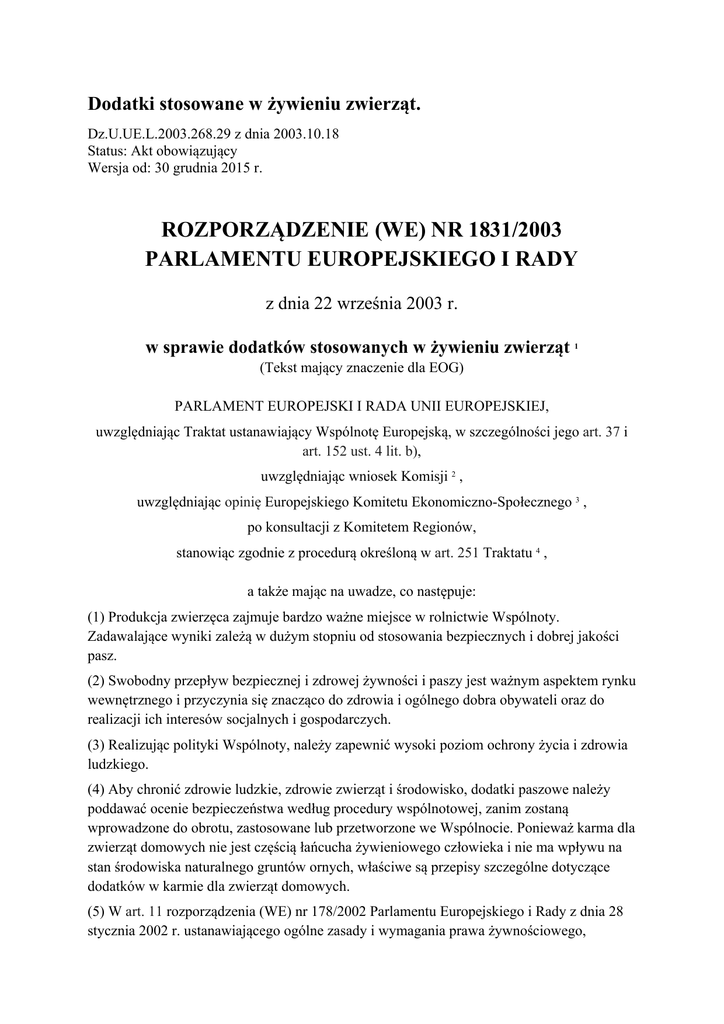 Dodatki stosowane w żywieniu zwierząt. Dz.U.UE.L.2003.268.29 z dnia 2003.10.18 Status: Akt obowiązujący Wersja od: 30 grudnia 2015 r. ROZPORZĄDZENIE (WE) NR 1831/2003 PARLAMENTU EUROPEJSKIEGO I RADY z dnia 22 września 2003 r. w sprawie dodatków stosowanych w żywieniu zwierząt 1 (Tekst mający znaczenie dla EOG) PARLAMENT EUROPEJSKI I RADA UNII EUROPEJSKIEJ, uwzględniając Traktat ustanawiający Wspólnotę Europejską, w szczególności jego art. 37 i art. 152 ust. 4 lit. b), uwzględniając wniosek Komisji 2 , uwzględniając opinię Europejskiego Komitetu Ekonomiczno-Społecznego 3 , po konsultacji z Komitetem Regionów, stanowiąc zgodnie z procedurą określoną w art. 251 Traktatu 4 , a także mając na uwadze, co następuje: (1) Produkcja zwierzęca zajmuje bardzo ważne miejsce w rolnictwie Wspólnoty. Zadawalające wyniki zależą w dużym stopniu od stosowania bezpiecznych i dobrej jakości pasz. (2) Swobodny przepływ bezpiecznej i zdrowej żywności i paszy jest ważnym aspektem rynku wewnętrznego i przyczynia się znacząco do zdrowia i ogólnego dobra obywateli oraz do realizacji ich interesów socjalnych i gospodarczych. (3) Realizując polityki Wspólnoty, należy zapewnić wysoki poziom ochrony życia i zdrowia ludzkiego. (4) Aby chronić zdrowie ludzkie, zdrowie zwierząt i środowisko, dodatki paszowe należy poddawać ocenie bezpieczeństwa według procedury wspólnotowej, zanim zostaną wprowadzone do obrotu, zastosowane lub przetworzone we Wspólnocie. Ponieważ karma dla zwierząt domowych nie jest częścią łańcucha żywieniowego człowieka i nie ma wpływu na stan środowiska naturalnego gruntów ornych, właściwe są przepisy szczególne dotyczące dodatków w karmie dla zwierząt domowych. (5) W art. 11 rozporządzenia (WE) nr 178/2002 Parlamentu Europejskiego i Rady z dnia 28 stycznia 2002 r. ustanawiającego ogólne zasady i wymagania prawa żywnościowego, powołującego Europejski Urząd ds. bezpieczeństwa żywności i ustanawiającego procedury w zakresie bezpieczeństwa żywności 5 zawarta jest zasada wspólnotowego prawa żywnościowego, według której żywność i pasza przywożone w celu wprowadzenia do obrotu we Wspólnocie muszą odpowiadać odpowiednim wymaganiom prawodawstwa wspólnotowego lub warunkom, które Wspólnota uznaje przynajmniej za równoważne. Konieczne jest dlatego, aby przywóz z państw trzecich dodatków stosowanych w żywieniu zwierząt podlegał wymaganiom równoważnym z tymi, które mają zastosowanie do dodatków produkowanych we Wspólnocie. (6) Działalność Wspólnoty odnosząca się do zdrowia ludzkiego, zdrowia zwierząt i środowiska naturalnego powinna opierać się na zasadzie ostrożności. (7) Zgodnie z art. 153 Traktatu, Wspólnota ma przyczyniać się do wspierania prawa konsumentów do informacji. (8) Doświadczenie nabyte w trakcie stosowania dyrektywy Rady 70/524/EWG z dnia 23 listopada 1970 r. dotyczącej dodatków paszowych 6 wykazało, że konieczna jest rewizja wszystkich zasad dotyczących dodatków, aby uwzględnić konieczność zapewnienia większej ochrony zdrowia ludzkiego, zdrowia zwierząt i środowiska naturalnego. Konieczne jest również uwzględnienie faktu, iż postęp technologiczny i naukowy udostępnił nowe rodzaje dodatków, takie jak te stosowane w kiszonce lub w wodzie. (9) Niniejsze rozporządzenie powinno również obejmować mieszanki dodatków sprzedawane użytkownikowi końcowemu, a obrót i stosowanie tych mieszanek powinno być zgodne z warunkami ustanowionymi w zezwoleniu na każdy poszczególny dodatek. (10) Premiksów nie należy uważać za preparaty objęte definicją dodatków. (11) Podstawową zasadą w tej dziedzinie powinna polegać na tym, że tylko dodatki zatwierdzone w ramach procedury przewidzianej w niniejszym rozporządzeniu mogą być wprowadzone do obrotu, stosowane i przetwarzane w żywieniu zwierząt na warunkach określonych w zezwoleniu. (12) Należy określić kategorie dodatków paszowych w celu ułatwienia procedury oceny w związku z zezwoleniem. Aminokwasy, ich sole i podobne produkty, mocznik i jego pochodne, które są obecnie objęte dyrektywą Rady 82/471/EWG z dnia 30 czerwca 1982 r. dotyczącą niektórych produktów stosowanych w żywieniu zwierząt 7 , powinny być zawarte w kategorii dodatków paszowych i dlatego zakres wspomnianej dyrektywy należy przenieść do niniejszego rozporządzenia. (13) Przepisy wykonawcze dotyczące wniosków o zezwolenie na dodatki paszowe powinny uwzględniać różne wymagania odnośnie do dokumentacji dotyczące zwierząt hodowlanych i innych zwierząt. (14) W celu zapewnienia zharmonizowanej oceny naukowej dodatków paszowych, oceny takiej powinien dokonać Europejski Urząd ds. Bezpieczeństwa Żywności, powołany rozporządzeniem (WE) nr 178/2002. Do wniosków należy dołączyć badania pozostałości w celu oceny określenia maksymalnych limitów pozostałości (MRL). (15) Komisja powinna opracować wytyczne dotyczące zezwoleń na dodatki paszowe we współpracy z Europejskim Urzędem ds. Bezpieczeństwa Żywności. Ustanawiając te wytyczne, należy zwrócić uwagę na możliwość zastosowania do podrzędnych gatunków na zasadzie ekstrapolacji wyników badań przeprowadzonych na głównych gatunkach. (16) Należy również przewidzieć uproszczoną procedurę zezwolenia w odniesieniu do dodatków, które pomyślnie przeszły procedurę zezwolenia w odniesieniu do zastosowania w żywności przewidzianą w dyrektywie Rady 89/107/EWG z dnia 21 grudnia 1988 r. w sprawie zbliżenia ustawodawstw Państw Członkowskich dotyczących dodatków do żywności dopuszczonych do użytku w środkach spożywczych przeznaczonych do spożycia przez ludzi 8 . (17) Uważa się, że naukowa ocena ryzyka nie może, w pewnych przypadkach, samodzielnie dostarczyć wszystkich informacji, na których należy opierać decyzję w zakresie zarządzania ryzykiem, oraz że inne czynniki związane z rozpatrywaną spr