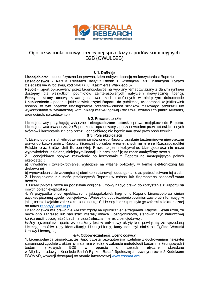 Ogólne warunki umowy licencyjnej sprzedaży raportów komercyjnych B2B (OWULB2B) & 1. Definicje Licencjobiorca – osoba fizyczna lub prawna, która nabywa licencję na korzystanie z Raportu Licencjodawca – Keralla Research Instytut Badań i Rozwiązań B2B, Katarzyna Pydych z siedzibą we Wrocławiu, kod 50-077, ul. Kazimierza Wielkiego 67 Raport – raport opracowany przez Licencjodawcę na wybrany temat związany z danym rynkiem dostępny dla wszystkich podmiotów zainteresowanych nabyciem niewyłącznej licencji. Strony - strony umowy zawartej na warunkach określonych w niniejszym dokumencie Upublicznienie – podanie jakiejkolwiek części Raportu do publicznej wiadomości w jakikolwiek sposób, w tym poprzez udostępnienie przedstawicielom środków masowego przekazu lub wykorzystanie w zewnętrznej komunikacji marketingowej (reklamie, działaniach public relations, promocjach, sprzedaży itp.) & 2. Prawa autorskie Licencjodawcy przysługują wyłączne i nieograniczone autorskie prawa majątkowe do Raportu. Licencjodawca oświadcza, że Raport został opracowany z poszanowaniem praw autorskich innych twórców i korzystanie z niego przez Licencjobiorcę nie będzie naruszać praw osób trzecich. & 3. Pola eksploatacji 1. Licencjobiorca z chwilą otrzymania zamówionego Raportu uzyskuje bezterminowe niewyłączne prawo do korzystania z Raportu (licencja) do celów wewnętrznych na terenie Rzeczypospolitej Polskiej oraz krajów Unii Europejskiej. Prawo to jest niezbywalne. Licencjodawca nie może wypowiedzieć udzielonej niniejszym licencji lub przekazać ją na rzecz osoby/firmy trzeciej. 2. Licencjobiorca nabywa zezwolenie na korzystanie z Raportu na następujących polach eksploatacji: a) utrwalanie i zwielokrotnianie, wyłącznie na własne potrzeby, w formie elektronicznej lub drukowanej b) wprowadzanie do wewnętrznej sieci komputerowej i udostępnianie za pośrednictwem tej sieci. 2. Licencjobiorca nie może przekazywać Raportu w całości lub fragmentach osobom/firmom trzecim. 3. Licencjobiorca może na podstawie odrębnej umowy nabyć prawo do korzystania z Raportu na innych polach eksploatacji. 4. W przypadku chęci upublicznienia jakiegokolwiek fragmentu Raportu Licencjobiorca winien uzyskać pisemną zgodę licencjodawcy. Wniosek o upublicznienie powinien zawierać informację, w jakiej formie i w jakim zakresie ma ono nastąpić. Licencjobiorca przesyła go w formie elektronicznej na adres [email protected] Licencjodawca ma prawo nie wyrazić zgody na upublicznienie fragmentu Raportu, jeżeli uzna, że może ono zagrażać lub naruszać interesy innych Licencjobiorców, stanowić czyn nieuczciwej konkurencji lub zagrażać bądź naruszać słuszny interes Licencjodawcy. Każdy egzemplarz raportu wyposażony jest w unikatowy ukryty kod powiązany ze sprzedaną Licencją umożliwiający identyfikację Licencjobiorcy, który naruszył niniejsze Ogólne Warunki Umowy Licencyjnej & 4. Odpowiedzialność Licencjodawcy 1. Licencjodawca oświadcza, że Raport został przygotowany rzetelnie z dochowaniem należytej staranności zgodnie z aktualnym stanem wiedzy w zakresie metodologii badań marketingowych i badań rynkowych B2B w oparciu o zasady etyczne określone w Międzynarodowym Kodeksie Badań Rynku i Badań Społecznych, zwanym również Kodeksem ESOMAR, w wersji dostępnej na stronie internetowej www.esomar.org 2. Licencjodawca nie ponosi wobec Licencjobiorcy odpowiedzialności kontraktowej, deliktowej bądź innego rodzaju, z tytułu pośrednich strat lub szkód wynikających z wykorzystania, interpretacji lub podjętych decyzji w oparciu o informacje zawarte w Raporcie lub pozostających w jakimkolwiek związku z Raportem. & 5. Składanie i anulowanie Zamówienia 1. Złożenie Zamówienia odbywa się w formie pisemnej poprzez wypełnienie i odesłanie formularza Zamówienia. 2. Licencjobiorca oświadcza, że osoba, która złożyła podpis na formularzu Zamówienia, jest upoważniona do reprezentowania Licencjobiorcy. 3. Złożenie Zamówienia jest równoznaczne z zawarciem umowy licencyjnej na warunkach określonych w niniejszym dokumencie. Na jego podstawie przesyłany jest Raport pod wskazany w zamówieniu adres pocztowy wraz z fakturą z tytułu nabycia Licencji. 4. Anulowanie Zamówienia jest możliwe tylko przed wysłaniem do Licencjobiorcy raportu w formie elektronicznej. Po przekazaniu Raportu nie ma możliwości anulowania Zamówienia. 5. Termin dostarczenia Raportu, jeżeli nie jest inaczej określony w Zamówieniu, wynosi do 2 dni roboczych. & 6. Terminy płatności Płatność za uzyskanie Licencji powinna być dokonana w terminie 7 lub 14 dni po otrzymaniu Raportu w formie elektronicznej, do której będzie dołączona faktura. Licencjobiorca wyraża zgodę na wystawienie faktury VAT bez podpisu Zamawiającego. Licencjodawca ma prawo odstąpić od umowy licencyjnej w przypadku nieuregulowania w terminie należności z tytułu zakupu Licencji. Odstąpienie od umowy nie zwalnia Licencjobiorcy z obowiązku zapłaty należności wynikającej z Zamówienia. & 7 Kary umowne 1. W przypadku naruszenia niniejszych Ogólnych Warunków Umowy Licencyjnej polegającego na upublicznieniu bez pisemnej zgody licencjodawcy jakiegokolwiek fragmentu Raportu z zastrzeżeniem postanowienia w pkt. 2 poniżej – Licencjobiorca zapłaci Licencjodawcy karę umowną w wysokości stanowiącej dziesięciokrotność wynagrodzenia z tytułu licencji na korzystanie z zamówionego Raportu określonego w Zamówieniu. 2. W przypadku naruszenia niniejszych Ogólnych Warunków Umowy Licencyjnej polegającego na upublicznieniu całości lub fragmentu zakupionego Raportu Licencjobiorca zapłaci Licencjodawcy karę umowną w wysokości stanowiącej piętnastokrotność wynagrodzenia z tytułu licencji na korzystanie z zamówionego Raportu określonego w Zamówieniu. 3. W przypadku naruszenia niniejszych Ogólnych Warunków Umowy Licencyjnej polegającego na udostępnieniu osobom/firmom t