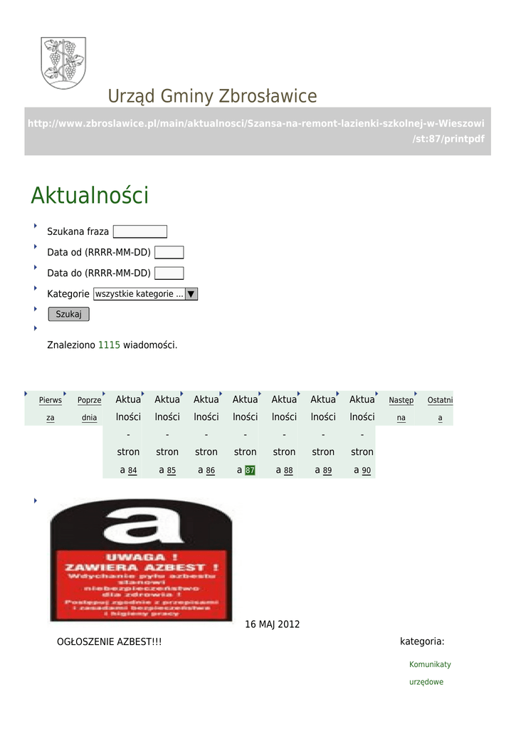 Urząd Gminy Zbrosławice http://www.zbroslawice.pl/main/aktualnosci/Szansa-na-remont-lazienki-szkolnej-w-Wieszowi /st:87/printpdf Aktualności Szukana fraza Data od (RRRR-MM-DD) Data do (RRRR-MM-DD) Kategorie wszystkie kategorie ... ▼ Szukaj Znaleziono 1115 wiadomości. Pierws Poprze Aktua Aktua Aktua Aktua Aktua Aktua Aktua Następ Ostatni za dnia lności lności lności lności lności lności lności na a - - - - - - - stron stron stron stron stron stron stron a 84 a 85 a 86 a a 88 a 89 a 90 87 16 MAJ 2012 OGŁOSZENIE AZBEST!!! kategoria: Komunikaty urzędowe Osoby fizyczne, zainteresowane otrzymaniem dotacji na usunięcie wyrobów, zawierających azbest, które wg „Oceny stanu i możliwości bezpiecznego użytkowania wyrobów zawierających azbest" uzyskały I stopień pilności (powyżej 120 pkt) proszone są o wypełnienie Wniosku o przyznanie dofinansowania na demontaż, odebranie oraz utylizację azbestu. Program dotyczy osób fizycznych oraz wspólnot mieszkaniowych (gospodarstwa rolne oraz 15 MAJ 2012 kategoria: Konsultacje społeczne Konsultacje społeczne Konsultacje społeczne dotyczące Regulaminu przyznawania i pozbawiania nagród i wyróżnień Wójta Gminy Zbrosławice za wysokie wyniki sportowe we współzawodnictwie międzynarodowym lub krajowym. Konsultacje społeczne przeprowadzane w formie internetowej, w okresie od 15 do 20 maja 2012r. Uprawnionymi do udziału w konsultacjach są pełnoletni mieszkańcy Gminy Zbrosławice, którzy posiadają czynne prawo wyborcze do Rady Gminy 11 MAJ 2012 I Gminny Festiwal Piosenki Ekologicznej 02 MAJ 2012 Informacja o zamiarze udostepnienia kanału technologicznego 30 KWI 2012 kategoria: Zmiana lokalizacji GOPSu Inne Gminny Ośrodek Pomocy Społecznej w Zbrosławicach z/s w Kamieńcu od 02.04.12 mieści się przy ul. Tarnogórskiej 4a tel. 32 233 78 92 27 KWI 2012 Interwencja Straży Gminnej na placu zabaw w Kamieńcu kategoria: Inne W dniu 13 kwietnia br. Straż Gminna została wezwana na interwencję na teren przedszkola w Kamieńcu. Na placu zabaw zauważono sarnę, która została zaatakowana przez sforę bezpańskich psów. Zwierze jeszcze żyło, ale było już strasznie poranione. Sarna została uśpiona. Sytacja pokazuje jakim zagrożeniem mogą być psy pozostawione bez opieki, aż strach pomyśleć co by się mogło stać, jeśli w tamtej chwili na placu zabaw 26 KWI 2012 kategoria: Konkurs KSIĄŻKA JEST SZTUKĄ Edukacja i Kultura Urząd Miejski w Tarnowskich GórachMiejska Biblioteka Publiczna im. Bolesława Lubosza w Tarnowskich Górach Gminna Biblioteka Publiczna w Zbrosławicach zapraszają do wzięcia udziału w VI edycji konkursu KSIĄŻKA JEST SZTUKĄ W konkursie mogą brać udział wszyscy chętni – bez ograniczeń wiekowych. Celem konkursu jest wykonanie książki, która jest przestrzennym obiektem plastyczno-literackim. Najważniejszym elementem powinien 26 KWI 2012 Zaproszenie na mecz do ZSO Kamieniec 25 KWI 2012 Zapraszamy na mecz 24 KWI 2012 kategoria: PROGRAM STYPENDIÓW POMOSTOWYCH 2012/2013 Inne Maturzysto! Jeśli jesteś zdolny, ambitny, chcesz podjąć naukę na dziennych studiach magisterskich i pochodzisz z rodziny byłego pracownika Państwowych Gospodarstw Rolnych, powinieneś odwiedzić stronę internetową www.stypendia-pomostowe.pl Niezbędnych informacji udzielą również pracownicy socjalni Gminnego Ośrodka Pomocy Społecznej w Zbrosławicach (tel.32 233 78 92 wew. 22 i 24). Pierws Poprze Aktua Aktua Aktua Aktua Aktua Aktua Aktua Następ Ostatni za dnia lności lności lności lności lności lności lności na a - - - - - - - stron stron stron stron stron stron stron a 84 a 85 a 86 a 87 a 88 a 89 a 90