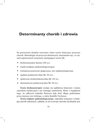 Determinanty chorób i zdrowia Na przestrzeni dziejów tworzono różne teorie dotyczące przyczyn chorób. Abstrahując od przyczyn duchowych, miazmatów itp., w czasach najnowszych uznawano następujące teorie [8]: • • • • • • drobnoustrojów (koniec XIX w.), triady (trójkąta epidemiologicznego), wieloprzyczynowości (pajęczyna, sieć epidemiologiczna), ogólnej podatności (lata 80. XX w.), społeczno-środowiskową (lata 80. XX w.), ekonomiczno-polityczną (lata 90. XX w.). Teoria drobnoustrojów wydaje się najbliższa lekarzom i innym zawodom medycznym i nie wymaga omówienia. Może z wyjątkiem tego, że odkrycia Ludwika Pasteura były dość długo podważane przez Justusa von Liebiega, a także Rudolfa Virchowa. Teoria trójkąta epidemiologicznego, najściślej związana z etiologią chorób zakaźnych, zakłada, że do rozwoju choroby niezbędne jest 23 współwystępowanie trzech czynników: czynnika chorobotwórczego, podatnego gospodarza oraz odpowiedniego środowiska (rycina 1). Rycina 1. Trójkąt epidemiologiczny. Zgodnie z tą teorią, ekspozycja na czynnik chorobotwórczy (w tym zakaźny) nie musi prowadzić do choroby. Zapobieganie chorobie polega przede wszystkim na modyfikacji czynników dotyczących ekspozycji i podatności. Teoria sieci (pajęczyny) epidemiologicznej jest rozszerzeniem poprzedniej i zakłada, że choroba powstaje jako wynik złożonych interakcji wielu czynników. W podejściu tym dany czynnik chorobotwórczy (czynnik ryzyka) może wywoływać więcej niż jedną chorobę. Zapobieganie polega na modyfikacji czynników ryzyka. Na marginesie — echem dwóch ostatnich teorii są tzw. pola zdrowia Marca Lalonde’a. Koncepcja ta powstała na użytek polityki zdrowotnej i ogłoszono ją w 1974 r. w raporcie nt. nowego spojrzenia na stan zdrowia Kanadyjczyków [9]. Głównym, choć anonimowym, autorem raportu był Hubert Laframboise, który powtórzył w nim swoje wcześniejsze zapatrywania [10]. Jednak to Lalonde, liberał, minister 24 zdrowia bogatego kraju — Kanady, pozyskał uwagę wielu specjalistów. Raport wskazywał, że działania stricte medyczne są zaledwie jednym z czterech tzw. pól zdrowia, obok czynników dziedzicznych, warunków środowiskowych i stylu życia. Kontynuatorzy dowodzili, że poczynania medyczne mogą odpowiadać za około 10% całkowitego stanu zdrowia zbiorowości, podczas gdy styl życia warunkuje mniej więcej połowę tej kondycji i dlatego decyduje o zdrowiu. Raport ten uchodzi za pierwszy rzeczowy dokument, który zwrócił uwagę, że interwencje biomedyczne (lekarze, szpitale, leki itd.) nie są całkowicie odpowiedzialne za stan zdrowia jednostek i populacji. Był zaczynem nowego sposobu myślenia — planowania dla zdrowia. Chociaż dla wielu polityków i przedstawicieli medycyny naprawczej był całkowitą nowością i zaskoczeniem, to jednak niczym nowym dla środowiska oświaty zdrowotnej, medycyny społecznej i zdrowia publicznego. Grupy te krytykowały nawet raport za powierzchowne, nadmiernie uproszczone ujęcie problematyki stylu życia. Dwanaście lat później kolejny minister zdrowia w Kanadzie, konserwatysta Jake Epp, podkreślał już znaczenie otoczenia i warunków życia ludzi. Teoria ogólnej podatności opiera się na powtarzalnej obserwacji, że umieralność i chorobowość z powodu ogółu oraz specyficznych przyczyn jest wyższa w niektórych grupach społecznych. Wskazywałoby to na zjawisko wrażliwości, podatności niektórych osób i grup na problemy zdrowotne. Przykładem tego podejścia są dane dotyczące występowania niektórych chorób i zjawisk w społeczeństwie USA (tabela 1) [11]. W późnych latach 80. XX w. teoria ogólnej podatności rozwinęła się i przeobraziła w podejście społeczno-środowiskowe (rycina 2). Wprawdzie opisuje ono mechanizmy, które prowadzą do rozwoju chorób, jednak pozwala także na zrozumienie czynników, które budują zdrowie, w tym zdrowie populacji. W świetle tego podejścia choroba i zdrowie są silnie uwarunkowane takimi czynnikami, jak stan środowiska przyrodniczego, społecznego i ekonomicznego. Środowisko sensu lato może powodować utratę zdrowia w sposób 25 Tabela 1. Podatność na niektóre choroby i problemy zdrowotne (wg: Balaban, 1992). Choroba/problem Rozpowszechnienie/podatność Choroba dwubiegunowa Częściej w wyższej klasie społecznej Schizofrenia Większa szansa na powrót do zdrowia w krajach nierozwiniętych Rzadziej u kobiet ze społeczności żydowskiej Rak szyjki macicy Rak jelita grubego Cukrzyca typu II Częściej u osób z wyższym statusem społeczno-ekonomicznym, u rasy białej Częściej u osób z awansu społecznego POChP Częściej w niższych klasach społecznych Zabójstwo (napastnik i ofiara) Częściej u osób, które nie radzą sobie z bezrobociem, dyskryminacją, warunkami mieszkaniowymi Częściej w środowiskach niedostarczających stymulacji, jeśli matki są nastolatkami Problemy zdrowotne wieku dziecięcego Rycina 2. Podejście społeczno-środowiskowe (wg: Labonte, 1993, w: Locker, 2008). 26 bezpośredni (np. zatrucia i urazy) oraz pośredni — przez czynniki ryzyka fizjologicznego, behawioralnego oraz psychologiczne. Z czasem zaczęto podkreślać, że środowisko przyrodnicze, społeczne i ekonomiczne ma ścisły związek z kontekstem politycznym. Dlatego zapobieganie chorobom wymaga działania politycznego, które odpowiednio ukształtuje środowisko naturalne i otoczenie ludzi. Podejście społeczno-środowiskowe stanowi podwaliny promocji zdrowia. Jeśli przyjąć, że zdrowie jest antynomią choroby, wymienione przyczyny chorób mogą być jednocześnie uznane za uwarunkowania zdrowia. Jeśli jednak rozpatrywać je jako kategorię samoistną i szerszą, można określać inne determinanty, a przynajmniej inaczej je definiować. Dla przykładu Karta Ottawska nt. promocji zdrowia z 1986 r. wymienia warunki konieczne dla zdrowia (prerequisites), takie jak [6]: • • • 
