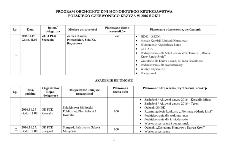 PROGRAM OBCHODÓW DNI HONOROWEGO KRWIODAWSTWA POLSKIEGO CZERWONEGO KRZYŻA W 2016 ROKU Lp. Data 2016.11.19. Godz. 11.00 Rejon/ delegatura ZOO PCK Szczecin Miejsce uroczystości Zamek Książąt Pomorskich, Sala Ks. Bogusława Planowana liczba uczestników 250 1. Planowane odznaczenia, wyróżnienia HDK – ZdZN, Medale Komisji Edukacji Narodowej, Wyróżnienie Kryształowe Serce OH PCK Podziękowania dla Szkół – laureatów Turnieju „Młoda Krew Ratuje Życie” Gratulacje dla Klubu z okazji 50-lecia działalności Podziękowania dla wolontariuszy Występ artystyczny, Poczęstunek. AKADEMIE REJONOWE Lp. Data, godzina Organizator Rejon/ delegatura Miejscowość i miejsce uroczystości Planowane odznaczenia, wyróżnienia, atrakcje Planowana liczba osób 1. 2016.11.25 Godz. 11.00 OR PCK Koszalin Sala kinowa Biblioteki Publicznej, Plac Polonii 1 Koszalin 100 2. 2016.11.25. Godz. 17.00 OR PCK Stargard Stargard, Państwowa Szkoła Muzyczna 100 1 Zasłużeni / Aktywni dawcy 2016 – Koszalin Miast Zasłużeni / Aktywni dawcy 2016 – Teren Odznaki ZHDK Rozstrzygnięcie konkursu „ Pierwsze oddanie krwi” Podziękowania dla wolontariuszy Podziękowania dla krwiodawców Występ artystyczny i poczęstunek Odznaki „Zasłużony Honorowy Dawca Krwi” Występ artystyczny PROGRAM OBCHODÓW DNI HONOROWEGO KRWIODAWSTWA POLSKIEGO CZERWONEGO KRZYŻA W 2016 ROKU 3. 2016.12.01. Godz. 17.00 OR PCK Kołobrzeg Kołobrzeg, Hotel „Centrum” 80 Odznaka Honorowa PCK Odznaki ZHDK Podziękowania dla nauczycieli Występ artystyczny UROCZYSTE SPOTKANIA CZŁONKÓW KLUBÓW HDK PCK Lp. 1. 2. 3. Data, godzina 2016.11.16. godz. 14.00 2016.11.19 Godz. 16.00 grudzień 2016r. godz. 12.00 Miejscowość i miejsce uroczystości Szczecin, siedziba Klubu HDK PCK MZK Koszalin Gnieźnieńska 9 Szczecin, siedziba Klubu HDK PCK Szczecin, Zachodniopomorska Chorągiew ZHP 4. 2016.11.24. godz. 17.00 5. 2016.11.25. godz. 12.00 Szczecin, siedziba Klubu HDK PCK 2016.11.25. godz. 12.00 2016.11.25. godz. 12.00 2016.11.25. godz. 17.00 Gryfino, siedziba Klubu HDK PCK Szczecin, siedziba Klubu HDK PCK Goleniów, siedziba Straży Pożarnej 6. 7. 8. Organizator/Nazwa Klubu Planowana liczba osób Klub HDK PCK przy Straży Granicznej w Szczecinie 15 Klub HDK PCK przy MZK 15 Klub HDK PCK przy OPP 40 Klub HDK PCK „Krwilijka” w Szczecinie 15 Klub HDK PCK przy Areszcie Śledczym w Szczecinie Klub HDK PCK „Kropelka” przy Elektrowni Dolna Odra Klub HDK PCK przy PKP Energetyka w Szczecinie Klub HDK PCK „Strażak” w Goleniowie 2 15 Planowane odznaczenia, wyróżnienia Odznaki ZHDK Podziękowania dla krwiodawców Poczęstunek Odznaki ZHDK Odznaki ZHDK Odznaki ZHDK 35 - 15 - 20 Odznaki ZHDK PROGRAM OBCHODÓW DNI HONOROWEGO KRWIODAWSTWA POLSKIEGO CZERWONEGO KRZYŻA W 2016 ROKU 9. 10. 11. 12. 13. 14. 2016.11.26. godz. 11.00 2016.11.26. godz. 16.00 2016.11.26. godz. 18.00 2016.12. (5lub a. 15) 2016.12.03. godz. 11.00 2016.12.03. godz. 11.00 2016.12.03. godz. 11.00 Nowogard, sala konferencyjna Urzędu Miasta i Gminy Banie, siedziba Klubu HDK PCK Szczecin, siedziba Klubu HDK PCK Stargard Łobez, Dom Kultury w Łobzie Gryfice, sala konferencyjna PKS Gryfice Szczecin, Klub Garnizonowy 35 Klub HDK PCK w Baniach 20 - Klub HDK PCK „Skolwin” w Szczecinie 25 - Klub HDK PCK SAPER 60 Klub HDK PCK w Łobzie 60 Klub HDK PCK przy PKS w Gryficach Wojskowy Klub HDK PCK w Szczecinie 45 2016.12.09 Godz. 16.00 Dom Weselny „Korsarz” Klub HDK PCK w Białogardzie 20 16. 2016.12.12. godz. 12.00 Szczecin, siedziba Klubu HDK PCK Klub HDK PCK przy KW PSP 30 2016.12.15 Godz. 13.00 Straż Miejska Koszalin Klub HDK PCK przy SM w Koszalinie 3 Odznaki Honorowe PCK Odznaki ZHDK Spotkanie i wspólna akcja poboru krwi Odznaki ZHDK 20 15. 17. Klub HDK PCK w Nowogardzie 20 Odznaki ZHDK Odznaki ZHDK Podziękowania dli krwiodawców Podziękowania dla sponsorów Poczęstunek Odznaki ZHDK Odznaki ZHDK Podziękowania dli krwiodawców Podziękowania dla sponsorów Poczęstunek PROGRAM OBCHODÓW DNI HONOROWEGO KRWIODAWSTWA POLSKIEGO CZERWONEGO KRZYŻA W 2016 ROKU Inne imprezy/akcje (np. konkursy, spotkania z młodzieżą, akcje poboru) Data, godzina Organizator – Rejon/ delegatura Rodzaj akcji/imprezy Miejsce akcji 1. 2016.11.08. Rejonowa Rada HDK w Stargardzie Pobór krwi I LO Stargard 2. 2016.11.17. Rejonowa Rada HDK w Stargardzie Pobór krwi II LO Stargard Klub HDK PCK przy ZOO PCK w Szczecinie Pobór krwi Wydział Humanistyczny Uniwersytetu Szczecińskiego Klub HDK PCK przy Straż Granicznej w Szczecinie Pobór krwi Straż Graniczna Lp. 3. 4. 2016.11.23. godz. 9.00 – 13.00 2016.11.16. godz. 9.00 – 13.00 4