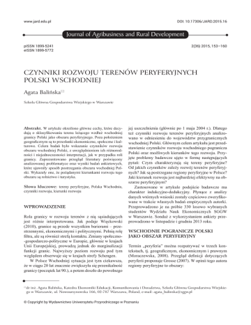 www.jard.edu.pl DOI: 10.17306/JARD.2015.16 Journal of Agribusiness and Rural Development pISSN 1899-5241 eISSN 1899-5772 2(36) 2015, 153–160 CZYNNIKI ROZWOJU TERENÓW PERYFERYJNYCH POLSKI WSCHODNIEJ Agata Balińska Szkoła Główna Gospodarstwa Wiejskiego w Warszawie Abstrakt. W artykule określono główne cechy, które decydują o sklasyfikowaniu terenu leżącego wzdłuż wschodniej granicy Polski jako obszaru peryferyjnego. Poza położeniem geograficznym są to przesłanki ekonomiczne, społeczne i kulturowe. Celem badań było wskazanie czynników rozwoju obszaru wschodniej Polski, z uwzględnieniem ich różnorodności i niejednoczesności interpretacji, jak w przypadku roli granicy. Zaprezentowano przegląd literatury poświęcony analizowanej problematyce oraz wyniki badań ankietowych, które ujawniły sposób postrzegania obszaru wschodniej Polski. Wykazały one, że pożądanymi kierunkami rozwoju tego obszaru są rolnictwo i turystyka. Słowa kluczowe: tereny peryferyjne, Polska Wschodnia, czynniki rozwoju, kierunki rozwoju WPROWADZENIE Rola granicy w rozwoju terenów z nią sąsiadujących jest różnie interpretowana. Jak podaje Więckowski (2010), granice są przede wszystkim barierami – przestrzennymi, ekonomicznymi i politycznymi. Pełnią rolę filtra, ale są również strefą kontaktu. Zmiany społeczno-gospodarczo-polityczne w Europie, głównie w krajach Unii Europejskiej, prowadzą jednak do marginalizacji funkcji granic. Najwyższy poziom rozwoju pod tym względem obserwuje się w krajach strefy Schengen. W Polsce Wschodniej sytuacja jest tym ciekawsza, że w ciągu 20 lat znacznie zwiększyła się przenikalność granicy (początek lat 90.), a potem doszło do powolnego jej uszczelnienia (głównie po 1 maja 2004 r.). Dlatego też czynniki rozwoju terenów peryferyjnych analizowano w odniesieniu do województw przygranicznych wschodniej Polski. Głównym celem artykułu jest przedstawienie czynników rozwoju wschodniego pogranicza Polski oraz możliwych kierunków tego rozwoju. Przyjęte problemy badawcze ujęto w formę następujących pytań: Czym charakteryzują się tereny peryferyjne? Od jakich czynników zależy rozwój terenów peryferyjnych? Jak są postrzegane regiony peryferyjne w Polsce? Jaki kierunek rozwoju jest najbardziej efektywny na obszarze peryferyjnym? Zastosowane w artykule podejście badawcze ma charakter indukcyjno-dedukcyjny. Płynące z analizy danych wtórnych wnioski zostały częściowo zweryfikowane w trakcie własnych badań empirycznych autorki. Przeprowadzono je na próbie 330 losowo wybranych studentów Wydziału Nauk Ekonomicznych SGGW w Warszawie. Sondaż z wykorzystaniem ankiety przeprowadzono w listopadzie i grudniu 2013 roku. WSCHODNIE POGRANICZE POLSKI JAKO OBSZAR PERYFERYJNY Termin „peryferia” można rozpatrywać w trzech kontekstach, tj. geograficznym, ekonomicznym i prawnym (Moraczewska, 2008). Przegląd definicji dotyczących peryferii proponuje Grosse (2007). W opinii tego autora regiony peryferyjne to obszary: dr inż. Agata Balińska, Katedra Ekonomiki Edukacji, Komunikowania i Doradztwa, Szkoła Główna Gospodarstwa Wiejskiego w Warszawie, ul. Nowoursynowska 166, 02-787 Warszawa, Poland, e-mail: [email protected] © Copyright by Wydawnictwo Uniwersytetu Przyrodniczego w Poznaniu Balińska, A. (2015). Czynniki rozwoju terenów peryferyjnych Polski Wschodniej. J. Agribus. Rural Dev., 2(36), 153–160. DOI: 10.17306/ JARD.2015.16 • oddalone od centrów gospodarczych z utrudnioną dostępnością komunikacyjną i niskim poziomem zaludnienia, • o niskim poziomie rozwoju gospodarczego (w UE mierzony jest poziomem PKB według parytetu siły nabywczej), • zdominowane przez pracochłonne gałęzi gospodarki w tym rolnictwa i leśnictwa, • o niskim poziomie rozwoju infrastruktury i niskim poziomie przedsiębiorczości i innowacyjności. Można też analizować zależność ekonomiczną peryferii od centrów ekonomicznych i politycznych oraz ich odrębność kulturowo-religijną i polityczną. Jak podają Bański i in. (2010), w powszechnym odbiorze przyjęło się, że „wschodnie obszary przygraniczne w naszym kraju wykazują typowe cechy peryferii geograficznych i gospodarczych”. Teren ten od dawna nazywany jest „ścianą wschodnią”, „Polską B”, a w opracowaniach IRWiR „obszarem problemowym” (Rosner, 2002; Kłodziński, 1999). Liczne opracowania dostarczają wiarygodnych dowodów na to, że teren wzdłuż wschodniej granicy kraju spełnia kryteria stawiane peryferiom (Dziemianowicz, 2008). Dla przykładu w PO RPW wymienione zostały cechy tego obszaru, które pozwalają uznać go za peryferyjny, tj.: • niski poziom zamożności (mierzony poziomem PKB na mieszkańca w poszczególnych województwach: podlaskim – 7160 euro, podkarpackim – 6760 euro, lubelskim – 6880 euro przy średniej krajowej 10 097 euro) (GUS, http://stat.gov.pl), • niski poziom spójności przestrzennej, społecznej i ekonomicznej, • mało efektywna struktura gospodarki z przewagą tradycyjnej produkcji rolniczej, niskim poziomem rozwoju przedsiębiorczości oraz relatywnie niskim poziomem konkurencyjności i innowacyjności przedsiębiorstw, • niewystarczający potencjał ośrodków wzrostu stymulujących rozwój, w tym wyraźnie wykształconych aglomeracji miejskich z rozwiniętymi funkcjami metropolitalnymi, • niewystarczający rozwój infrastruktury szkolnictwa wyższego i słabe powiązanie nauki z gospodarką, • niski poziom rozwoju infrastruktury technicznej (głównie teleinformatycznej i transportowej) oraz niewielka dostępność komunikacyjna tego terenu. 154 Istotnym problemem obszarów peryferyjnych są również migracje, szczególnie ludzi młodych, co widoczne jest również w badanych województwach (Leimgruber, 1999). CHARAKTERYSTYKA WYBRANYCH UWARUNKOWAŃ ROZWOJU TERENÓW PERYFERYJNYCH WSCHODNIEJ POLSKI „Można przyjąć, że czynnikami rozwoju są te elementy, struktury terytorium, 