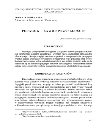 COLLOQUIUM WYDZIAŁU NAUK HUMANISTYCZNYCH I SPOŁECZNYCH ROCZNIK II/2010 Iwona Królikowska Akademia Marynarki Wojennej PEDAGOG – ZAWÓD PRZYSZŁOŚCI? „Przyszłość to dziś, tylko trochę dalej” STRESZCZENIE Artykuł jest próbą odpowiedzi na pytanie o przyszłość zawodu pedagoga w kontekście transformacji społeczno-gospodarczej i wymagań nowo powstającego społeczeństwa informacyjnego. Ukazuje przegląd zawodów przyszłości przewidywanych dla pedagogów. Analizuje zasady organizujące nowoczesne społeczeństwo, wizje przyszłości oraz procesy długiego trwania mający wpływ na kształt przyszłości a stan polskiej edukacji i braku jej dostosowania się do obecnych i przyszłych warunków cywilizacyjnych. Porusza także problem podłoża braku umiejętności myślenia o przyszłości zawodowej wśród studentów pedagogiki. KOORDYNATOR AWATARÓW Przeglądając prasę internetową uwagę moją zwrócił artykuł pt: „Kim zostanie twoje dziecko? Hodowcą narządów czy kosmicznym architektem”1. Brytyjski portal naukowy, sięgając w dalszą przyszłość, opublikował listę zawodów jutra2. Wielu z nich dziś nie znajdziemy ani w dziś wykonywanych zawodach, ani tym bardziej w ofercie kształcenia. Wśród zawodów takich jak: producent części ciała, kosmiczny przewodnik, specjalista do odwracania zmian klimatycznych czy policja pogodowa znalazło się także miejsce dla pedagogów: operator awatarów i wirtualny nauczyciel. Awatar, postać wirtualna będąca odpowiednikiem rzeczywistej lub wyimaginowanej postaci w rzeczywistości wirtualnej mający wesprzeć lub zastąpić nauczyciela w klasach nauczania początkowego w funkcji przewodnika po sieci. Koordy1 http://www.tvn24.pl / 12691,1638876,0,1, hodowca – narzadow – czy – kosmiczny – architekt, wiadomosc.html 2 http://sciencesowhat.direct.gov.uk/future-jobs 117 Iwona Królikowska nator czy też operator awatarów ma dbać by uczeń i jego awatar „byli odpowiednio dopasowani i połączeni”3. Wirtualny nauczyciel korzystając z szerokiej oferty nowoczesnych technologii edukuje poprzez wirtualne łącza komputera, telefonu komórkowego, przenośne tablety, smartphony czy inne odtwarzacze multimedialne w każdym miejscy na świecie. Znajdzie się wielu, którzy stwierdzą że jest to wizja przyszłości z książek science fiction. Analizując jednak światowe trendy związane z rozwojem i popularnością nowoczesnej technologii ta przyszłość może być znacznie bliżej niż sądzimy. Warto zadać pytanie czy studenci pedagogiki wybierając tenże kierunek studiów podążali za trendami w obecnym świecie i wybierając zawód myśleli kategoriami przyszłości rozpatrując możliwość bycia choćby operatorem awatarów? Czy elementy studiów nad przyszłością były i są obecne na ścieżce edukacyjnej przyszłego pedagoga by wykształcić w nim umiejętności analizy swojej sytuacji w przyszłości? Czy zastanowili się nad przyszłością zawodu pedagoga, nad zmianami organizacji pracy, które mogą nastąpić w związku z rozwojem technologicznym i dynamicznymi zmianami społecznymi? Czy sięgali po prognozy na nowe zawody w branży edukacyjnej? STUDIA NAD PRZYSZŁOŚCIĄ Czy myślimy o przyszłości? Nie, raczej o przeszłości. Andrzej Karpiński, od wielu lat aktywny w studiach nad przyszłością, zauważa, że „(…) pod wpływem naszych skomplikowanych losów, a może i charaktery narodowego, występuje w Polsce z wyjątkowym nasileniem i skali nienotowanej w innych krajach zjawisko fascynacji przeszłością historyczną”4. W polskiej debacie społecznej, w porównaniu z innymi krajami europejskimi, brak jest miejsca dla przyszłości. Brak jest jej także w edukacji. „Dzieci mają przygotować się do życia skierowanego ku przyszłości, choć nasz szkoła zamknięta jest w przeszłości”5. Programy i metody są przestarzałe i niedostosowane do dzisiejszych realiów. Dzieci i młodzież nudzą się w szkołach6, edukacja nie jest przygotowana do nauki nowego pokolenia, które wyrosło w nowej tech3 http://www.tvn24.pl / 12691,1638876,0,1, hodowca – narzadow – czy – kosmiczny – architekt, wiadomosc.html 4 A. Karpiński, Co trzeba wiedzieć o studiach nad przyszłością?, Polskie Towarzystwo Ekonomiczne, Warszawa 2009, s. 59. 5 R. Pachociński, Oświata i praca w erze globalizacji, Instytut Badań Edukacyjnych, Warszawa 2006, s. 83. 6 Badania prof. Czapińskiego… 118 COLLOQUIUM WNHiS Pedagog – zawód przyszłości? nologii nie uwzględnianej w systemach edukacyjnych7. Nikt nie uczy młode pokolenia myślenia o przyszłości. Ponadto, jak zauważa Bogusław Śliwerski, nauczyciele nie uaktualniają swojej wiedzy, zanika na uczelniach prowadzenie badań naukowych co sprawia, że brakuje badań prognostycznych, nie podejmowane są ekspertyzy, które miałyby istotne znaczenie do dalszego planowania8, zaś nauczyciele – nowatorzy, najbardziej zafascynowani możliwościami zmian autorskich w szkolnictwie publicznym „wypalają” się obserwując jak ich dotychczasowe projekty zostają „włożone między bajki” przez kolejne dochodzące do władzy ekipy resortu edukacyjnego9. Ciągle brak jest nam wizji szkoły przyszłości w okresie następnego ćwierćwiecza. „Dyskusje na temat sześciolatków, listy lektur obowiązkowych, mundurków czy religii w szkołach oraz kilku innych spraw szczegółowych debaty takiej nie zastąpią. Chodzi tu bowiem o same fundamenty systemu edukacji, które, położone przed dziesiątkami lat, wydają się dziś niebezpiecznie zapadać”10. Niektórzy badacze zadają pytanie: czy taka wizja jest w ogóle możliwa i potrzebna? Przecież przyszłości nie da się przewidzieć i jest wiele czynników na przykład tak zwany „czarny łabędź”, które potrafią w sposób przypadkowy i nieprzewidywalny zmienić wizję przyszłości. „25 lat to przyszłość, w którą jeszcze można próbować wejrzeć, chociaż wizja taka n
