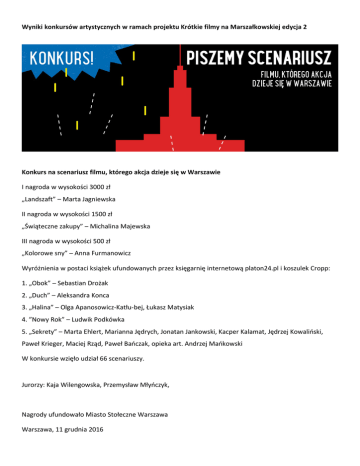 Wyniki konkursów artystycznych w ramach projektu Krótkie filmy na Marszałkowskiej edycja 2 Konkurs na scenariusz filmu, którego akcja dzieje się w Warszawie I nagroda w wysokości 3000 zł „Landszaft” – Marta Jagniewska II nagroda w wysokości 1500 zł „Świąteczne zakupy” – Michalina Majewska III nagroda w wysokości 500 zł „Kolorowe sny” – Anna Furmanowicz Wyróżnienia w postaci książek ufundowanych przez księgarnię internetową platon24.pl i koszulek Cropp: 1. „Obok” – Sebastian Drożak 2. „Duch” – Aleksandra Konca 3. „Halina” – Olga Apanosowicz-Katłu-bej, Łukasz Matysiak 4. ”Nowy Rok” – Ludwik Podkówka 5. „Sekrety” – Marta Ehlert, Marianna Jędrych, Jonatan Jankowski, Kacper Kalamat, Jędrzej Kowaliński, Paweł Krieger, Maciej Rząd, Paweł Bańczak, opieka art. Andrzej Mańkowski W konkursie wzięło udział 66 scenariuszy. Jurorzy: Kaja Wilengowska, Przemysław Młyńczyk, Nagrody ufundowało Miasto Stołeczne Warszawa Warszawa, 11 grudnia 2016 Filmujemy Warszawę! edycja 2. Konkurs 2-minutowych filmów o ulicach. Nagrodę główną 2000 zł (ufundowaną przez Miasto Stołeczne Warszawę), jury postanowiło podzielić na pół: 1000 zł „ul Renesansowa” – Maciej Kwiatkowski 1000 zł „ul. Brzozowa” – Radek Jurski Dwa tatuaże o wartości 600 zł każdy, ufundowane przez Studio Juniorink „ul. Wiolinowa” – Grzegorz Jasina „Chłopaki ze Szwedzkiej” (ul. Szwedzka) – Premium Project Wyróżnienia ufundowane przez Miasto Stołeczne Warszawę – po 500 zł każde: „ul. Waliców” – Zuzanna Maciejewska, Zofia Podraza „ul. Tamka” – Gabi Kiryluk Nagroda ufundowana przez Galerię Autorską Andrzeja Mleczki - koszulka z rysunkiem Andrzeja Mleczki „Lajkonik Warszawski” „ul. Gwiaździsta” – Natalia Korszeń Nagrody ufundowane przez księgarnię internetową Platon24 - książki o filmie: „ul. Świetojańska” - Dana Bińczak „ul. Wiolinowa” - Grzegorz Jasina Nagroda ufundowana przez restauracje Bobby Burger Żurawia – burgery wegetariańskie lub nie w restauracji Bobby Burger przy ul. Żurawiej, dla 3 osobowej ekipy „Street Justice” (ul. Inżynierska) - Daniel Czapczuk Nagroda ufundowana przez restauracje Krowarzywa – wegańskie burgery dla 3-osobowej ekipy: „ul. Ząbkowska” – Marcin Pieniążek Nagroda ufundowana przez firmę Maptu – designerska mapa ulicy Marszałkowskiej „Światła Karowej” (ul. Karowa) - Bartosz Stań Nagrody ufundowane przez firmę Cropp – koszulki z nowej kolekcji „Skoczmy na Kazurkę” (ul. Kazury) - Marcin Galiński „ul. Hoża” – Tomasz Motarski „ul. Jana Pawła II” - Szymon Mościcki Nagroda ufundowana przez restauracje Manekin Warszawa (obiad dla trzech osób) „ul. Zakroczymska” - Grupa Elmara Nagroda ufundowana przez TEATR POLONIA (dwa podwójne bilety na spektakl „Chłopcy” wg Stanisława Grochowiaka, 22 grudnia 2016 „ul. Na Uboczu”- Karolina Lewandowska „ul. Jagiellońska” – Martyna Dębska Jurorzy: Aleksandar Ćirlić i Marta Prus W konkursie brało udział 49 filmów. Można je zobaczyć na stronie www.filmujemy-miasta.pl/warszawa Warszawa, 11 grudnia 2016