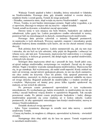 Wakacje Tomek spędzał u babci i dziadka, którzy mieszkali w Gdańsku na Niedźwiedniku. Pewnego dnia, gdy dziadek siedział w swoim dużym, miękkim fotelu i czytał gazetę, Tomek do niego podszedł. - Dziadku, zastanawia mnie, skąd wzięła się nazwa Niedźwiednik? - zapytał. - Wiesz, Tomku, to jest bardzo interesujące pytanie. Siądź sobie wygodnie, a ja ci opowiem, dlaczego to miejsce tak się nazywa – odparł dziadek. Tomek usiadł na dywanie, a dziadziuś zaczął opowiadać. Dawno temu w tym miejscu nie było bloków, budynków ani żadnych zabudowań, tylko gęsty las. Ludzie początkowo rzadko odwiedzali te tereny, ponieważ bali się mieszkających tu dużych, ciemnobrązowych niedźwiedzi. Pewnego dnia pewien człowiek o imieniu Bogumił postanowił, że zamieszka w tych okolicach, Wszyscy sąsiedzi, znajomi i mieszkańcy grodu odradzali budowę domu niedaleko tych lasów, ale on nie chciał zmienić swojej decyzji. Rok później dom był gotowy. Ludzie zastanawiali się, jak się tam żyje i mieszka, ale nie byli na tyle odważni, żeby pójść do Bogumiła i zobaczyć na własne oczy, jak tam jest. Tymczasem, mężczyzna był zadowolony z e swojego domu i miejsca, w którym go postawił, Jak dotąd nigdy nie spotkał niedźwiedzi, o których tyle słyszał. Któregoś dnia mężczyzna ubrał się i poszedł do lasu. Szedł jakiś czas, aż ujrzał małego niedźwiadka, uwięzionego we wnykach. Zaczął się do niego zbliżać. Nagle z krzaków wyjrzała zaniepokojona niedźwiedzica. Mężczyzna bał się, że go zaatakuje. Był wystraszony, ale nadal szedł naprzód. Kiedy znalazł się metr od zwierząt, zaczął mówić spokojnym głosem, że nie ma złych zamiarów, nie chce zrobić im krzywdy. Chce im pomóc. Gdy spojrzał ponownie na niedźwiedzicę, zauważył, że chyba go zrozumiała, ponieważ oddaliła się nieco od swego dziecka. Bogumił podszedł do niedźwiadka i z trudem uwolnił go z wnyków. Mężczyzna od tamtej pory przez kilka tygodni opiekował się malcem, aż ten wrócił do zdrowia. Po pewnym czasie postanowił opowiedzieć o tym wydarzeniu mieszkańcom. Po wysłuchaniu go, ludzie stwierdzili, że niedźwiedzie nic im nie zrobią i zaczęli budować więcej domów w sąsiedztwie Bogumiła. Tak zaczęła powstawać osada. Po jakimś czasie przybywało budynków i ludzi, dlatego niedźwiedzie pojawiały się coraz rzadziej, aż w końcu odeszły. Ludzie postanowili, że aby upamiętnić mieszkające tam kiedyś niedźwiedzie, nazwą to miejsce Niedźwiednikiem. Dziadek skończył swoją opowieść. - Jejku. Teraz rozumiem, dlaczego to osiedle nosi taka nazwę – zawołał uradowany Tomek. - Cieszę się bardzo, że mogłem ci, chłopcze, opowiedzieć tę historię – stwierdził dziadek. Następnego dnia obaj udali się do lasu na spacer. Tomek wypatrywał w zaroślach niedźwiedzi...
