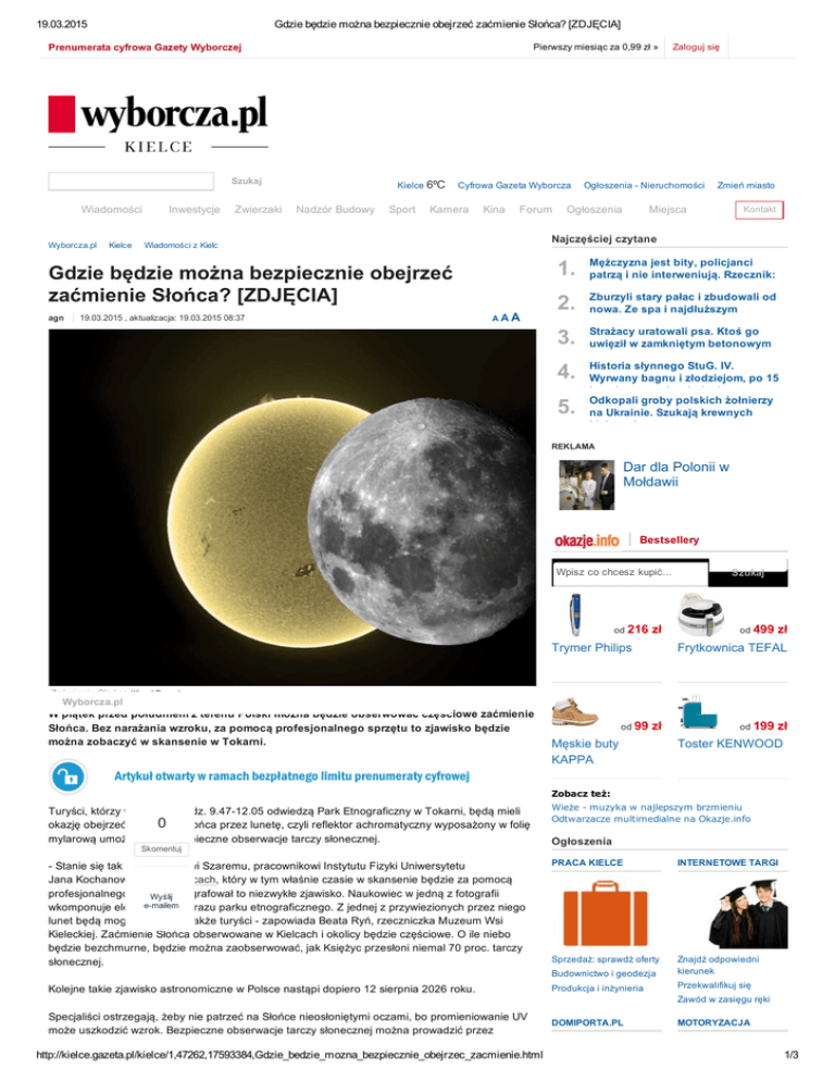 19.03.2015 Gdzie będzie można bezpiecznie obejrzeć zaćmienie Słońca? [ZDJĘCIA] Pierwszy miesiąc za 0,99 zł » Prenumerata cyfrowa Gazety Wyborczej Szukaj Wiadomości Wyborcza.pl Kielce Inwestycje Zwierzaki Kielce 6ºC Nadzór Budowy Sport Cyfrowa Gazeta Wyborcza Kamera Kina Forum 19.03.2015 , aktualizacja: 19.03.2015 08:37 Ogłoszenia Nieruchomości Ogłoszenia Zmień miasto Miejsca Kontakt Najczęściej czytane Wiadomości z Kielc 1. Gdzie będzie można bezpiecznie obejrzeć zaćmienie Słońca? [ZDJĘCIA] agn Zaloguj się A A A 2. 3. 4. 5. Mężczyzna jest bity, policjanci patrzą i nie interweniują. Rzecznik: To zachowanie nieprofesjonalne Zburzyli stary pałac i zbudowali od nowa. Ze spa i najdłuższym żyrandolem w Polsce [ZDJĘCIA] Strażacy uratowali psa. Ktoś go uwięził w zamkniętym betonowym zbiorniku [ZDJĘCIA] Historia słynnego StuG. IV. Wyrwany bagnu i złodziejom, po 15 latach prac, odzyskuje dawny Odkopali groby polskich żołnierzy na Ukrainie. Szukają krewnych kielczanina REKLAMA Dar dla Polonii w Mołdawii Bestsellery Wpisz co chcesz kupić... Szukaj od 216 zł Trymer Philips Zaćmienie Słońca (Karol Szary) Wyborcza.pl W piątek przed południem z terenu Polski można będzie obserwować częściowe zaćmienie Słońca. Bez narażania wzroku, za pomocą profesjonalnego sprzętu to zjawisko będzie można zobaczyć w skansenie w Tokarni. od 499 zł Frytkownica TEFAL od 99 zł Męskie buty KAPPA od 199 zł Toster KENWOOD Artykuł otwarty w ramach bezpłatnego limitu prenumeraty cyfrowej Zobacz też: Turyści, którzy w piątek w godz. 9.4712.05 odwiedzą Park Etnograficzny w Tokarni, będą mieli 0 okazję obejrzeć zaćmienie Słońca przez lunetę, czyli reflektor achromatyczny wyposażony w folię mylarową umożliwiającą bezpieczne obserwacje tarczy słonecznej. Skomentuj Stanie się tak dzięki Karolowi Szaremu, pracownikowi Instytutu Fizyki Uniwersytetu Jana Kochanowskiego w Kielcach, który w tym właśnie czasie w skansenie będzie za pomocą profesjonalnego sprzętu fotografował to niezwykłe zjawisko. Naukowiec w jedną z fotografii Wyślij emailem wkomponuje elementy krajobrazu parku etnograficznego. Z jednej z przywiezionych przez niego lunet będą mogli skorzystać także turyści zapowiada Beata Ryń, rzeczniczka Muzeum Wsi Kieleckiej. Zaćmienie Słońca obserwowane w Kielcach i okolicy będzie częściowe. O ile niebo będzie bezchmurne, będzie można zaobserwować, jak Księżyc przesłoni niemal 70 proc. tarczy słonecznej. Kolejne takie zjawisko astronomiczne w Polsce nastąpi dopiero 12 sierpnia 2026 roku. Wieże muzyka w najlepszym brzmieniu Odtwarzacze multimedialne na Okazje.info Ogłoszenia PRACA KIELCE INTERNETOWE TARGI Sprzedaż: sprawdź oferty Budownictwo i geodezja Znajdź odpowiedni kierunek Produkcja i inżynieria Przekwalifikuj się Zawód w zasięgu ręki Specjaliści ostrzegają, żeby nie patrzeć na Słońce nieosłoniętymi oczami, bo promieniowanie UV może uszkodzić wzrok. Bezpieczne obserwacje tarczy słonecznej można prowadzić przez http://kielce.gazeta.pl/kielce/1,47262,17593384,Gdzie_bedzie_mozna_bezpiecznie_obejrzec_zacmienie.html DOMIPORTA.PL MOTORYZACJA 1/3 19.03.2015 Gdzie będzie można bezpiecznie obejrzeć zaćmienie Słońca? [ZDJĘCIA] teleskopy słoneczne, okulary wyposażone w specjalne filtry lub przez folię mylarową, którą można kupić w sklepach fotograficznych. W ostateczności można użyć ciemnego szkła spawalniczego. Na uszkodzenie wzroku narażają się osoby, które będą patrzyły na Słońce przez okulary przeciwsłoneczne, zdjęcia rentgenowskie, klisze fotograficzne, płyty CD czy okopcone szkło. Absolutnie nie wolno tego robić przez lornetki, lunety czy teleskopy bez specjalnej folii. Artykuł otwarty w ramach bezpłatnego limitu Centrum, 63 m2 Luksusowe Audi Q7 Mieszkania na sprzedaż BMW najlepsze oferty Mieszkania do wynajęcia Najbezpieczniejszy fotelik samochodowy dla dziecka Wypróbuj prenumeratę cyfrową Wyborczej Nieograniczony dostęp do serwisów informacyjnych, biznesowych, lokalnych i wszystkich magazynów Wyborczej Wypróbuj teraz za 0,99 zł Zaloguj się / Informacje / Kontakt Zobacz także Odkopali groby polskich żołnierzy na Ukrainie. Szukają krewnych kielczanina Studenci nie mogą się doczekać. Zobacz nowoczesne Centrum Rehabilitacji i Sportu UJK [ZDJĘCIA] Neonami rozświetlone Kielce. Tylko dla sentymentalnych [ZDJĘCIA, SONDAŻ] Perła skansenu pięknieje. Najpierw odnowiono boczne ołtarze [ZDJĘCIA] Zobacz więcej na temat: UJK Muzeum Wsi Kieleckiej Skomentuj: Zaloguj się Skomentuj MIEJSCA TEMATY CO JEST GRANE PRACA CENNIKI REKLAM KONTAKT Z REDAKCJĄ Rynek w Kielcach Kadzielnia Cedzyna Muzeum Zabawek i Zabawy Starachowice Morawica Klimontów Sandomierz Sobków Kurozwęki Ostrowiec Świętokrzyski Emitel Grzegorz Banaś Beata Gosiewska Konstanty Miodowicz Beata Kempa Chemar Drogi wojewódzkie Politechnika Świętokrzyska Orliki stadion Korony Bogdan Wenta Euro 2012 Repertuar kin Kultura Wzory CV List motywacyjny Rozmowa kwalifikacyjna Praca świętokrzyskie Praca Kierowca Kielce Praca Magazynier Kielce Praca Sprzedawca Kielce Praca w Ochronie Kielce Praca Sprzątanie Kielce Praca Kosmetyczka Kielce Cennik ogłoszeń wymiarowych Cennik ogłoszeń drobnych sprzedaż na odległość Cennik ogłoszeń drobnych sprzedaż bezpośrednia Cennik nekrologów Wszystko o reklamie w Gazecie Wyborczej ul. Rynek 16 skr. poczt. 96 25303 Kielce tel. (041) 249 80 00 DYSKUSJE Forum Kielce Forum Chęciny Forum Ostrowiec Świętokrzyski Forum Sandomierz Forum Skarżysko Kamienna SPORT W KIELCACH KSZO Ostrowiec Vive Targi Kielce Korona Kielce KSS Kielce Fart Kielce UMKS Kielce NIERUCHOMOŚCI Domy na sprzedaż Domy na wynajem Działki na sprzedaż Nieruchomości na sprzedaż Nieruchomości na wynajem FIRMY KRS Kielce Przetargi świętokrzyskie Dyżurny dziennikarz: tel. (041) 249 83 03 faks 041 249 80 01 [email protected] Dział sprzedaży: [email protected] telef
