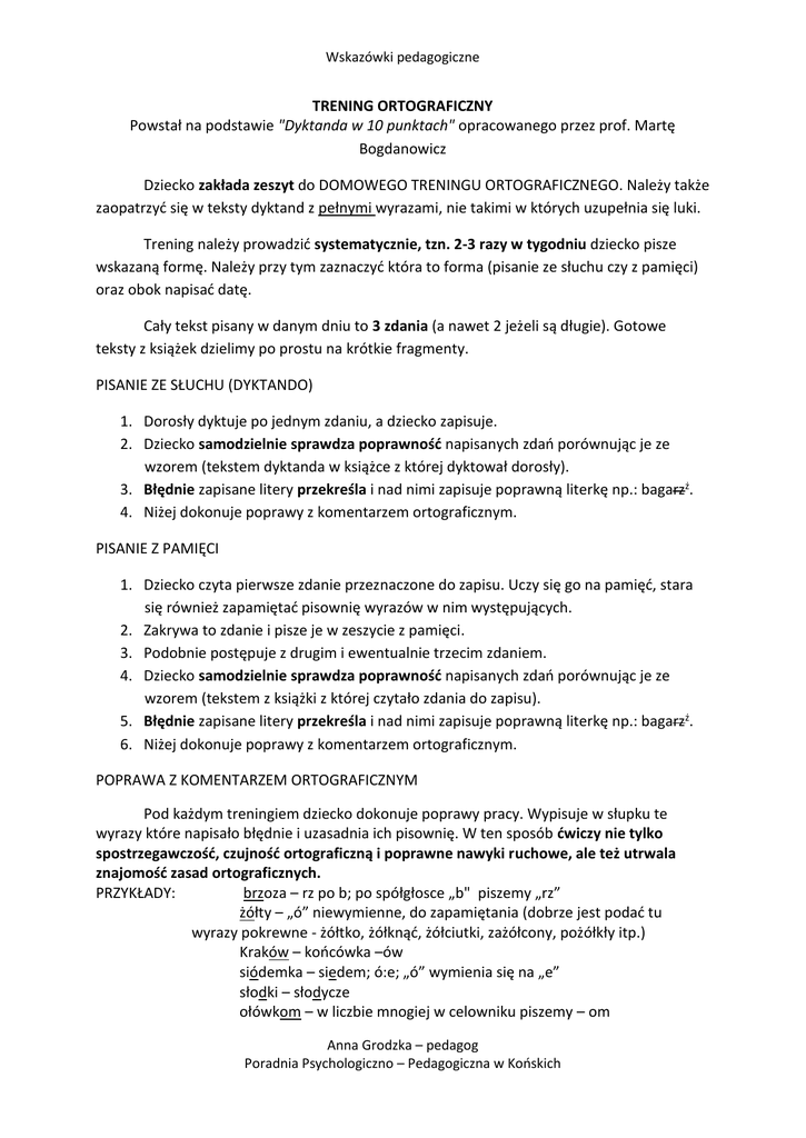 Wskazówki pedagogiczne TRENING ORTOGRAFICZNY Powstał na podstawie "Dyktanda w 10 punktach" opracowanego przez prof. Martę Bogdanowicz Dziecko zakłada zeszyt do DOMOWEGO TRENINGU ORTOGRAFICZNEGO. Należy także zaopatrzyć się w teksty dyktand z pełnymi wyrazami, nie takimi w których uzupełnia się luki. Trening należy prowadzić systematycznie, tzn. 2-3 razy w tygodniu dziecko pisze wskazaną formę. Należy przy tym zaznaczyć która to forma (pisanie ze słuchu czy z pamięci) oraz obok napisać datę. Cały tekst pisany w danym dniu to 3 zdania (a nawet 2 jeżeli są długie). Gotowe teksty z książek dzielimy po prostu na krótkie fragmenty. PISANIE ZE SŁUCHU (DYKTANDO) 1. Dorosły dyktuje po jednym zdaniu, a dziecko zapisuje. 2. Dziecko samodzielnie sprawdza poprawność napisanych zdań porównując je ze wzorem (tekstem dyktanda w książce z której dyktował dorosły). 3. Błędnie zapisane litery przekreśla i nad nimi zapisuje poprawną literkę np.: bagarzż. 4. Niżej dokonuje poprawy z komentarzem ortograficznym. PISANIE Z PAMIĘCI 1. Dziecko czyta pierwsze zdanie przeznaczone do zapisu. Uczy się go na pamięć, stara się również zapamiętać pisownię wyrazów w nim występujących. 2. Zakrywa to zdanie i pisze je w zeszycie z pamięci. 3. Podobnie postępuje z drugim i ewentualnie trzecim zdaniem. 4. Dziecko samodzielnie sprawdza poprawność napisanych zdań porównując je ze wzorem (tekstem z książki z której czytało zdania do zapisu). 5. Błędnie zapisane litery przekreśla i nad nimi zapisuje poprawną literkę np.: bagarzż. 6. Niżej dokonuje poprawy z komentarzem ortograficznym. POPRAWA Z KOMENTARZEM ORTOGRAFICZNYM Pod każdym treningiem dziecko dokonuje poprawy pracy. Wypisuje w słupku te wyrazy które napisało błędnie i uzasadnia ich pisownię. W ten sposób ćwiczy nie tylko spostrzegawczość, czujność ortograficzną i poprawne nawyki ruchowe, ale też utrwala znajomość zasad ortograficznych. PRZYKŁADY: brzoza – rz po b; po spółgłosce „b" piszemy „rz” żółty – „ó” niewymienne, do zapamiętania (dobrze jest podać tu wyrazy pokrewne - żółtko, żółknąć, żółciutki, zażółcony, pożółkły itp.) Kraków – końcówka –ów siódemka – siedem; ó:e; „ó” wymienia się na „e” słodki – słodycze ołówkom – w liczbie mnogiej w celowniku piszemy – om Anna Grodzka – pedagog Poradnia Psychologiczno – Pedagogiczna w Końskich