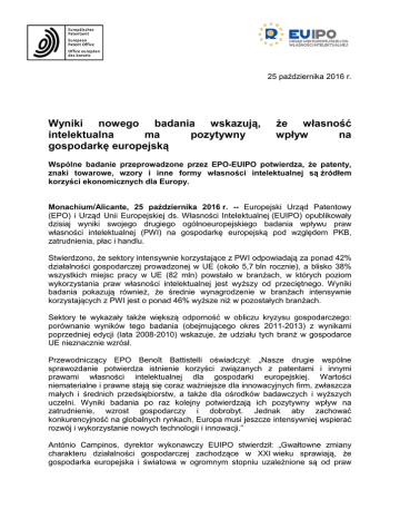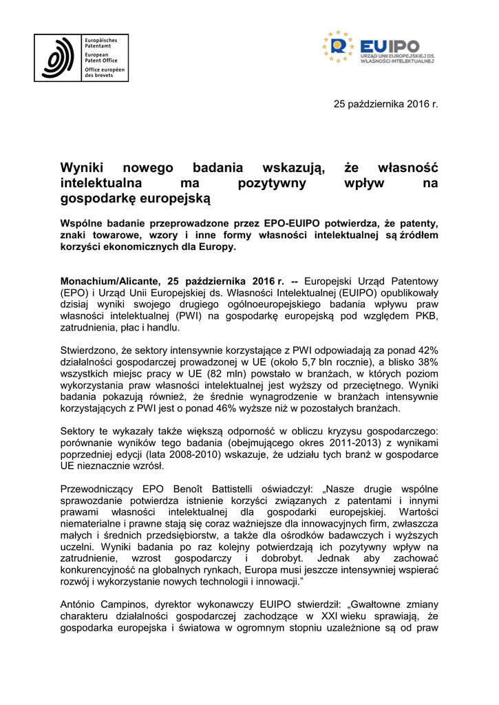 25 października 2016 r. Wyniki nowego badania wskazują, intelektualna ma pozytywny gospodarkę europejską że własność wpływ na Wspólne badanie przeprowadzone przez EPO-EUIPO potwierdza, że patenty, znaki towarowe, wzory i inne formy własności intelektualnej są źródłem korzyści ekonomicznych dla Europy. Monachium/Alicante, 25 października 2016 r. -- Europejski Urząd Patentowy (EPO) i Urząd Unii Europejskiej ds. Własności Intelektualnej (EUIPO) opublikowały dzisiaj wyniki swojego drugiego ogólnoeuropejskiego badania wpływu praw własności intelektualnej (PWI) na gospodarkę europejską pod względem PKB, zatrudnienia, płac i handlu. Stwierdzono, że sektory intensywnie korzystające z PWI odpowiadają za ponad 42% działalności gospodarczej prowadzonej w UE (około 5,7 bln rocznie), a blisko 38% wszystkich miejsc pracy w UE (82 mln) powstało w branżach, w których poziom wykorzystania praw własności intelektualnej jest wyższy od przeciętnego. Wyniki badania pokazują również, że średnie wynagrodzenie w branżach intensywnie korzystających z PWI jest o ponad 46% wyższe niż w pozostałych branżach. Sektory te wykazały także większą odporność w obliczu kryzysu gospodarczego: porównanie wyników tego badania (obejmującego okres 2011-2013) z wynikami poprzedniej edycji (lata 2008-2010) wskazuje, że udziału tych branż w gospodarce UE nieznacznie wzrósł. Przewodniczący EPO Benoît Battistelli oświadczył: „Nasze drugie wspólne sprawozdanie potwierdza istnienie korzyści związanych z patentami i innymi prawami własności intelektualnej dla gospodarki europejskiej. Wartości niematerialne i prawne stają się coraz ważniejsze dla innowacyjnych firm, zwłaszcza małych i średnich przedsiębiorstw, a także dla ośrodków badawczych i wyższych uczelni. Wyniki badania po raz kolejny potwierdzają ich pozytywny wpływ na zatrudnienie, wzrost gospodarczy i dobrobyt. Jednak aby zachować konkurencyjność na globalnych rynkach, Europa musi jeszcze intensywniej wspierać rozwój i wykorzystanie nowych technologii i innowacji.” António Campinos, dyrektor wykonawczy EUIPO stwierdził: „Gwałtowne zmiany charakteru działalności gospodarczej zachodzące w XXI wieku sprawiają, że gospodarka europejska i światowa w ogromnym stopniu uzależnione są od praw 25 października 2016 r. własności intelektualnej, takich jak znaki towarowe, wzory przemysłowe, patenty i pozostałe prawa własności intelektualnej. W sprawozdaniu udowodniono, że ta wzajemna zależność staje się coraz silniejsza, a wiele podmiotów korzysta różnych rodzajów praw własności intelektualnej jednocześnie. Stoimy w obliczu wyzwania polegającego na zapewnieniu szerszego dostępu do praw własności intelektualnej wszystkim przedsiębiorstwom, w tym MŚP, a także ich skutecznej ochrony przed przypadkami naruszeń, co pozwoli UE utrzymać wysoki poziom innowacyjności, a przez to przyczyni się do tworzenia nowych stanowisk pracy i wzrostu gospodarczego”. Badaniem objęto różne prawa własności intelektualnej, tzn. patenty, znaki towarowe, wzory, prawa autorskie, oznaczenia geograficzne oraz prawa ochrony odmian roślin. Zidentyfikowano branże, które korzystają z nich względnie intensywnie i zmierzono udział branż intensywnie korzystających z PWI w gospodarce na podstawie kilku wskaźników ekonomicznych, w szczególności produktu krajowego brutto (PKB), zatrudnienia, wynagrodzeń i handlu zagranicznego na poziomie UE. Wykorzystano w tym celu metodologię podobną do tej, którą posłużono się w poprzednim badaniu EPO-EUIPO, którego wyniki opublikowano w 2013 r., a także porównywalną z badaniami przeprowadzonymi w Stanach Zjednoczonych. Silna pozycja przemysłu UE w obszarze zielonych technologii Z treści sprawozdania wynika, że branże intensywnie korzystające z PWI odpowiadają za około 90% wymiany handlowej UE z resztą świata. Stwierdzono, że UE utrzymuje wyjątkowo silną pozycję w branży technologii łagodzenia zmian klimatu (climate change mitigation technologies, CCMT), która zatrudnia 1,2% europejskiej siły roboczej i odpowiada za 2,1% produkcji gospodarczej, przyczyniając się znacznie do tworzenia dodatniego salda wymiany handlowej pomiędzy UE a resztą świata. Branże intensywnie korzystające ze wzorów są ważnym motorem handlu Europejskie firmy przodują również w zakresie wzorów przemysłowych. W bilansie handlu zagranicznego UE w 2013 r. branże intensywnie korzystające ze wzorów wygenerowały ponad 243 mld euro. Firmy intensywnie korzystające ze wzorów wytwarzają 18% PKB Unii Europejskiej i zatrudniają 38,7 milionów pracowników. Według autorów sprawozdania, około połowa wszystkich europejskich branż intensywnie korzysta z PWI; pośród tych sklasyfikowanych na 20 najwyższych pozycjach znalazły się m.in. inżynieria, nieruchomości, działalność finansowa i ubezpieczeniowa, produkcja pojazdów samochodowych, komputerów i przemysł farmaceutyczny. 25 października 2016 r. Wyniki podobnego badania dotyczącego gospodarki amerykańskiej, opublikowanego we wrześniu 2016 r. przez amerykański Urząd Patentów i Znaków Towarowych, były porównywalne. Udział zatrudnienia i PKB w branżach intensywnie korzystających z PWI jest nieco wyższy w Europie niż w Stanach Zjednoczonych. Branże te mają również spory udział w amerykańskim handlu zagranicznym, choć jest on niższy niż w Europie. Wyniki obu badań wskazują, że wynagrodzenia pracowników w branżach intensywnie korzystających z PWI są o 46% wyższe niż w pozostałych. Dalsze informacje: • • • Opracowanie dostępne na stronie internetowej EPO Opracowanie dostępne na stronie EUIPO #IPvalue Kontakt dla mediów: EPO Rainer Osterwalder Tel. +49 (0)89 2399 1820 [email protected] EUIPO Laura CASADO Tel: +34 965 13 8934 [email protected] Claire CASTEL Tel: +34 965 13 9735 [email protected]