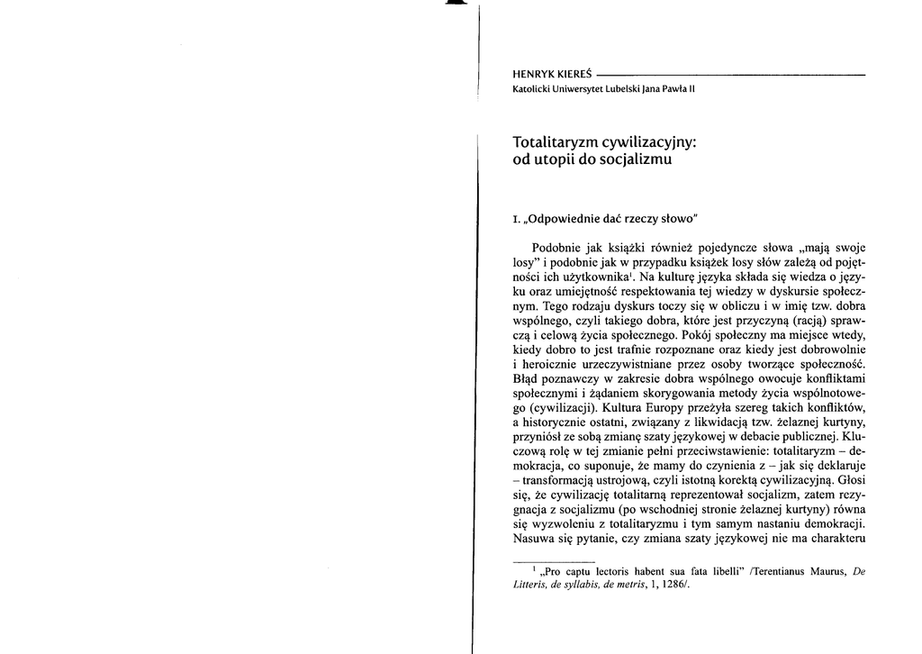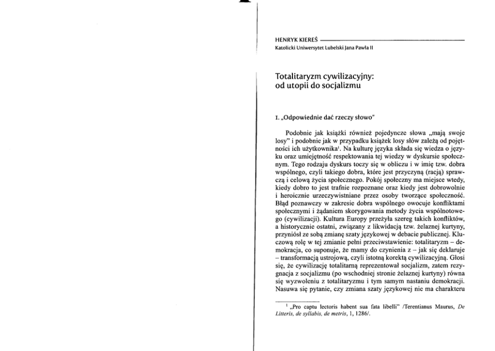 HENRYK KlEREŚ Katolicki Uniwersytet Lubelski lana Pawta ll Totatitaryzm cywilizacyj ny: od utoptt do socjalizmu I. ,,odpowiednie dać rueczy stowo" Podobnie jak książki r wniez pojedyncze słowa -mają swoje losy'' i podobnie jak w przypadku książek losy sł w zaleŻą od pojętnościich użytkownikal. Na kulturę języka składa się wiedza o jęryku oraz umiejętnośćrespektowania tej wiedzy w dyskursie społecznym. Tego rodzaju dyskurs toczy się w obliczu i w imię tzw. dobra wsp lnego, czyli takiego dobra, kt re jest przyczyną (racją) sprawczą i celową Życia społecznego. Pok j społeczny ma miejsce wtedy, kiedy dobro to jest trafnie rozpoznanę oraz kiedy jest dobrowolnie i heroicznie urzeczywistniane przez osoby tworzące społeczność. BŁąd poznawczy w zakresie dobra wsp lnego owocuje konfliktami społecznymi i żądaniem skorygowania metody życia wsp lnotowego (cywi1izacji)' Kultura Europy przeżyłaSzereg takich konflikt w, a historycznie ostatni' związany z likwidacją tzw. żelaznej kurtyny, przyni sł ze sobą zmianę szaty językowej w debacię publicznej. Kluczową ro1ę w tej zmianie pełni przeciwstawienie: totalitaryzm - demokracja, co suponuje, Że mamy do czynienia z * jak się deklaruje _ transformacją ustrojową, czyIi istotną korektą cywi|izacyjną. Głosi się, że cywilizację totalitarną reprezentował socjalizm, zatem rezygnacja z socja|izmu (po wschodniej stronie Że|aznej kurtyny) r wna się wyzwoleniu z tota|itaryzmu i tym samym nastaniu demokracji. Nasuwa się pytanie, czy zmiana szaĘ językowej nie ma charakteru l ,,Pro captu lectoris habęnt sua Litteris, de syllabis, de metris,l, 12861 fata . libęlli'' /Teręntianus Maurus' De 30 I Henryk Kiereś Totalitaryzm cywilizacyjny: od utopii do socjalizmu czysto propagandowego? Czy lansowana transformacja ustrojowa wyzwala życie społeczne z kajdan totalitaryzmu? Zatrzymajmy się nad niedalekąprzeszłościąpolityczną paristw tzw. bloku wschodniego i sp jrzmy na nią pod kątem języka debaty publicznej. Jak pamiętamy, a pamiętać warto, byĘ to paristwa tzw. demokracji ludowej, a w osobliwy pleonazm (kiedy Wruzy tworzącenazwę znaczą to samo) zna|azł sw j wyraz w oficjalnych nazwach pa stw, np. Polska Rzeczpospolita Ludowa lub Niemiecka Republika DemoŁłatyczna. Słowo ,,rzeczpospolita'' to tfumaczenie łac. res publica, co z kolei ma oddawać gr' demokratia (od demos - lud), a więc gdyby chciało się zaakcentować ustĄowy charakter paristwa, wystarczyło_ by powiedzieć: Rzeczpospolita Polska czy Republika (resp. Rzesza) Niemiecka. W innej, alternaĘwnej nazwie pa stwa te określano jako paristwa tzw. demokracji socjalistycznej (Łac. socius _ uczestnik; societas * towarzystwo). Ten nadmiar słowa ,,lud'' śmieszy, lansuje bowiem ustr j ,,ludowo-ludowy'', ale nie był on przypadkowy, ponieważwiązała się z nim świadoma manipulacja, podporządkowana dialektyce propagandy. ot ż chodziło o słowo ,,komunizm'' i to, co się za nim kryło, mianowicie, Związek Radziecki (Rosja Sowiecka) z jego odrażającym totalitaryzmem, odziedziczonym po Rosji carskiej i bezwzględnie ucieleśnianym w ramach ustroju komunistycznego. Komunizm miał złą opinię, dlatego w paristwach, kt re Zachodni alianci oddali we władanie Rosji Sowieckiej, takĘcznie m wiono o socjalizmie, a żeby zdjąć, z niego odium pokrewieristwa z komuni_ Zmem dodawano skwapliwie, Że chodzi o demokrację socjalistyczną' Wspominano co prawda o komunizmie, ale w ramach ideologicznego homagium składanego rytualnie Związkowi Radzieckiemu, zaś możliwośćjego realizacji we własnych paristwach wiązano z dość nieokreślon ą przy szłością. Z powyższego przypomnienia wynika, że w dyskursie społecznym panuje zamęt terminologiczno_pojęciowy' w rezultacie kt rego nie wiadomo' jak mają się do siebie socjalizm, komunizm, tota|itaryzm, demokracja oraz w czym zasadza się istota transformacji ustrojowej z socjalizmu (komunizmu) i totalitaryzmu w kapitalizm, liberalizm i globalizm. Nachalna propaganda towarzysząca tej transformacji dystansuje się od socjalizmu i komunizmu, oskarża je o to- I I I ta|itaryzm i zafałszowanie idei demokracji, a z drugiej strony głosi, że wspomniana transformacja oznacza,,koniec historii'' i ostateczne rozstrzygnięcie problemu cywilizacji, nastanie tzw. czas w postpolitycznych. Inaczej m wiąc, głosi się, że nowy ustr j jest ,jedynie SłuSZny'', że - patrząc z perspektywy podjętej w artykule kwestii przezwycięża on totalitaryZm cywilizacyjny. Czy tak jest? zatrzymajmy się najpierw nad historycznym aspektem problemu cywilizacji i konkurującymi ze sobą metodami rczsttzygania tego problemu. z. Utopizm czy indukcfa? W tytule paragrafu wyr Żnia się i odr żnia dwie rywa|izujące ze sobą metody rozwiązywania problemu ustroju społecznego. Genezy utopizmu należyupatrywać w metodzie najstarszej historycznie, mianowicie, w poznaniu poetyckim i jego mitach społecznych. W mitach tego rodzaju wskazywano naprzyczyny ztzeszania się rodzaju ludzkiego, a przede wszystkim barwnie opisywano fikcyjne społeczności i paristwa. Ich doskonałe ustroje polityczne gwarantowĄ człowieko- wi pełnię d br i szczęŚliwe życie w harmonii społecznej. Pomysł w nie brakowało, ale pomimo r Żnic wszystkie mity społeczne służyĘ moralizowaniu w zakresie pedagogiki paristwowej, byĘ rodzajem moralitetu społecznego. Kiedy w kulturze starożytnej Grecji poznanie poetyckie ustąpiło miejsca nauce' mity społeczne zvłiązaĘ się z fi|ozofrą: z tradycją idealizmu filozoficznego. Tradycja ta nie była jednolita myślowo i od samego początku reprezentowaĘ ją(i tak jest do dziś)dwa przeciwstawne nurty: racjonalizm oruz inacjonalizm, co Zaowocowało odmiennymi koncepcjami świata,człowieka i celu ludzkiego życia. I tak, racjona|izm, kt ry ucieleśniłsię doskonale w myśliPlatona, był wpatrzony w wieczną i niezmienną ideę paristwa, a politykę pojmował jako sztukę rzą