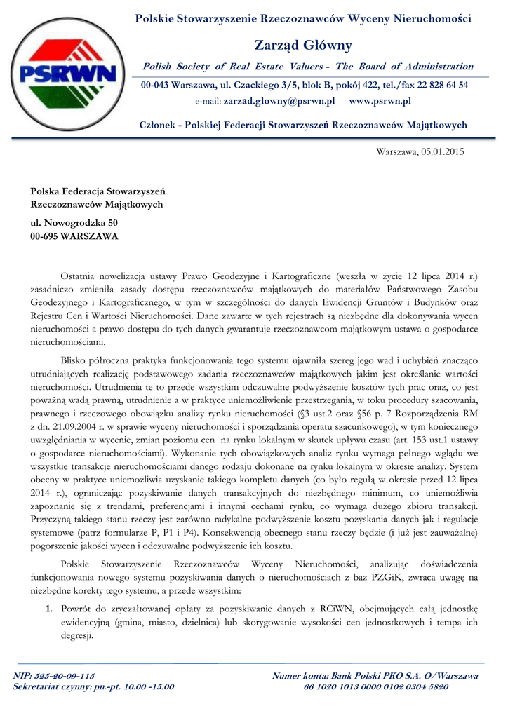 Polskie Stowarzyszenie Rzeczoznawców Wyceny Nieruchomości Zarząd Główny Polish Society of Real Estate Valuers - The Board of Administration 00-043 Warszawa, ul. Czackiego 3/5, blok B, pokój 422, tel./fax 22 828 64 54 e-mail: [email protected] www.psrwn.pl Członek - Polskiej Federacji Stowarzyszeń Rzeczoznawców Majątkowych Warszawa, 05.01.2015 Polska Federacja Stowarzyszeń Rzeczoznawców Majątkowych ul. Nowogrodzka 50 00-695 WARSZAWA Ostatnia nowelizacja ustawy Prawo Geodezyjne i Kartograficzne (weszła w życie 12 lipca 2014 r.) zasadniczo zmieniła zasady dostępu rzeczoznawców majątkowych do materiałów Państwowego Zasobu Geodezyjnego i Kartograficznego, w tym w szczególności do danych Ewidencji Gruntów i Budynków oraz Rejestru Cen i Wartości Nieruchomości. Dane zawarte w tych rejestrach są niezbędne dla dokonywania wycen nieruchomości a prawo dostępu do tych danych gwarantuje rzeczoznawcom majątkowym ustawa o gospodarce nieruchomościami. Blisko półroczna praktyka funkcjonowania tego systemu ujawniła szereg jego wad i uchybień znacząco utrudniających realizację podstawowego zadania rzeczoznawców majątkowych jakim jest określanie wartości nieruchomości. Utrudnienia te to przede wszystkim odczuwalne podwyższenie kosztów tych prac oraz, co jest poważną wadą prawną, utrudnienie a w praktyce uniemożliwienie przestrzegania, w toku procedury szacowania, prawnego i rzeczowego obowiązku analizy rynku nieruchomości (§3 ust.2 oraz §56 p. 7 Rozporządzenia RM z dn. 21.09.2004 r. w sprawie wyceny nieruchomości i sporządzania operatu szacunkowego), w tym koniecznego uwzględniania w wycenie, zmian poziomu cen na rynku lokalnym w skutek upływu czasu (art. 153 ust.1 ustawy o gospodarce nieruchomościami). Wykonanie tych obowiązkowych analiz rynku wymaga pełnego wglądu we wszystkie transakcje nieruchomościami danego rodzaju dokonane na rynku lokalnym w okresie analizy. System obecny w praktyce uniemożliwia uzyskanie takiego kompletu danych (co było regułą w okresie przed 12 lipca 2014 r.), ograniczając pozyskiwanie danych transakcyjnych do niezbędnego minimum, co uniemożliwia zapoznanie się z trendami, preferencjami i innymi cechami rynku, co wymaga dużego zbioru transakcji. Przyczyną takiego stanu rzeczy jest zarówno radykalne podwyższenie kosztu pozyskania danych jak i regulacje systemowe (patrz formularze P, P1 i P4). Konsekwencją obecnego stanu rzeczy będzie (i już jest zauważalne) pogorszenie jakości wycen i odczuwalne podwyższenie ich kosztu. Polskie Stowarzyszenie Rzeczoznawców Wyceny Nieruchomości, analizując doświadczenia funkcjonowania nowego systemu pozyskiwania danych o nieruchomościach z baz PZGiK, zwraca uwagę na niezbędne korekty tego systemu, a przede wszystkim: 1. Powrót do zryczałtowanej opłaty za pozyskiwanie danych z RCiWN, obejmujących całą jednostkę ewidencyjną (gmina, miasto, dzielnica) lub skorygowanie wysokości cen jednostkowych i tempa ich degresji. NIP: 525-20-09-115 Sekretariat czynny: pn.-pt. 10.00 -15.00 Numer konta: Bank Polski PKO S.A. O/Warszawa 66 1020 1013 0000 0102 0304 5820 2. Zmiana określenia jednostki rozliczeniowej w tab.12 załącznika do ustawy prawo geodezyjne i kartograficzne, na jednostkę logicznie jednorodną (np. transakcja). Obecny stan rzeczy prowadzi niejednokrotnie do sytuacji absurdalnych, bezzasadnie podnoszących koszt pozyskania danych, gdy np. transakcja sprzedaży lokalu obejmuje kilka nieruchomości – lokal, udział w gruncie, udział w pow. ogólnej budynku, udział w garażu itd. Niezależnie od powyższych niezbędnych korekt systemu, zwracamy uwagę na szereg innych utrudnień w dostępie do danych w prowadzonych rejestrach. • • • • System jest niejednolity – pełna swoboda w ustanawianiu programów dostępu do bazy przez poszczególne jednostki samorządowe (powiaty, miasta) powoduje niekompatybilność uzyskiwanych danych dot. lokalnych rynków nieruchomości a ponadto znakomicie podnosi koszty budżetowe w tej dziedzinie. Niepełne i niejednolite przygotowanie pracowników obsługujących RCiWN powoduje znaczne trudności tak w zamawianiu danych transakcyjnych jak i w sposobie ich udostępniania; np. obok formularza P niektóre starostwa lub PODGiK’i żądają formularza P1 inne P4. Rejestry CiWN w starostwach prowadzone są niejednolicie, co powoduje różny i nieporównywalny wzajemnie zakres charakterystyki nieruchomości w tych rejestrach (np. nagminnie występujący brak charakterystyki budynków i budowli, częsty brak oznaczenia bonitacyjnego użytków), a także zasadniczo utrudnia ich wykorzystanie dla potrzeb wyceny nieruchomości. Brak właściwego przygotowania pracowników lub niedoskonałości systemów informatycznych obsługi dostępu do danych (albo łącznie jedno i drugie) często powoduje rozbieżności pomiędzy zamówieniem a jego realizacją, a ponadto niejednokrotnie bardzo wydłuża czas oczekiwania na zamówione dane. Przedstawiając powyższe uwagi Polskie Stowarzyszenie Rzeczoznawców Wyceny Nieruchomości uprzejmie prosi Federację, jako ogólnopolską reprezentację zawodu rzeczoznawcy majątkowego, o podjęcie niezbędnych działań w celu koniecznej zmiany obecnego systemu dostępu do baz danych Państwowego Zasobu Geodezyjnego i Kartograficznego (w tym Rejestru Cen i Wartości Nieruchomości), dla poprawy obecnego stanu rzeczy przez usunięcie jego podstawowych wad. Ujawnione bowiem wady utrudniają (a wręcz uniemożliwiają) należyte wykonywania obowiązków zawodowych rzeczoznawcy majątkowego, jako osoby zaufania publicznego, w granicach interesu publicznego i dla jego ochrony ( patrz art.17 ust.1 Konstytucji RP oraz orzeczenie Trybunału Konstytucyjnego z dnia 2.12.2002 r. sygn. SK 20/01 określające zawód rzeczoznawcy majątkowego jako zawód zaufania publicznego). NIP: 525-20-09-115 Sekretariat czynny: pn.-pt. 10.00 -15.00 Numer konta: Bank Polski PKO S.A. O/Warszawa 66 1020 1013 0000 0102