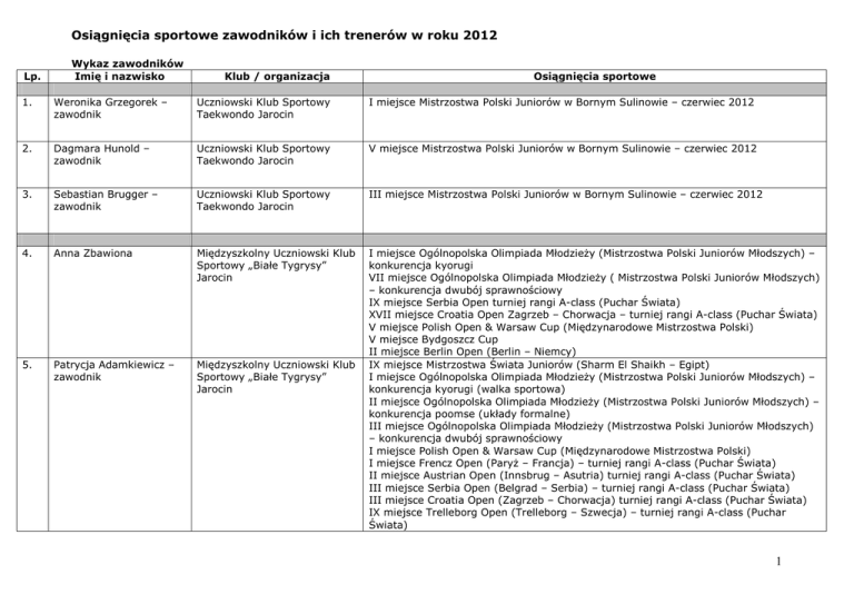 1 Osiągnięcia sportowe zawodników i ich trenerów w roku 2012