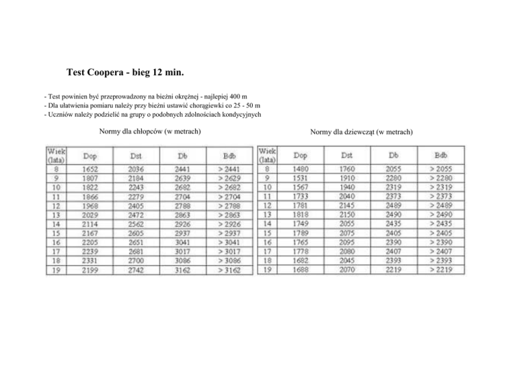 Test Coopera - bieg 12 min. - Test powinien być przeprowadzony na bieżni okrężnej - najlepiej 400 m - Dla ułatwienia pomiaru należy przy bieżni ustawić chorągiewki co 25 - 50 m - Uczniów należy podzielić na grupy o podobnych zdolnościach kondycyjnych Normy dla chłopców (w metrach) Normy dla dziewcząt (w metrach)