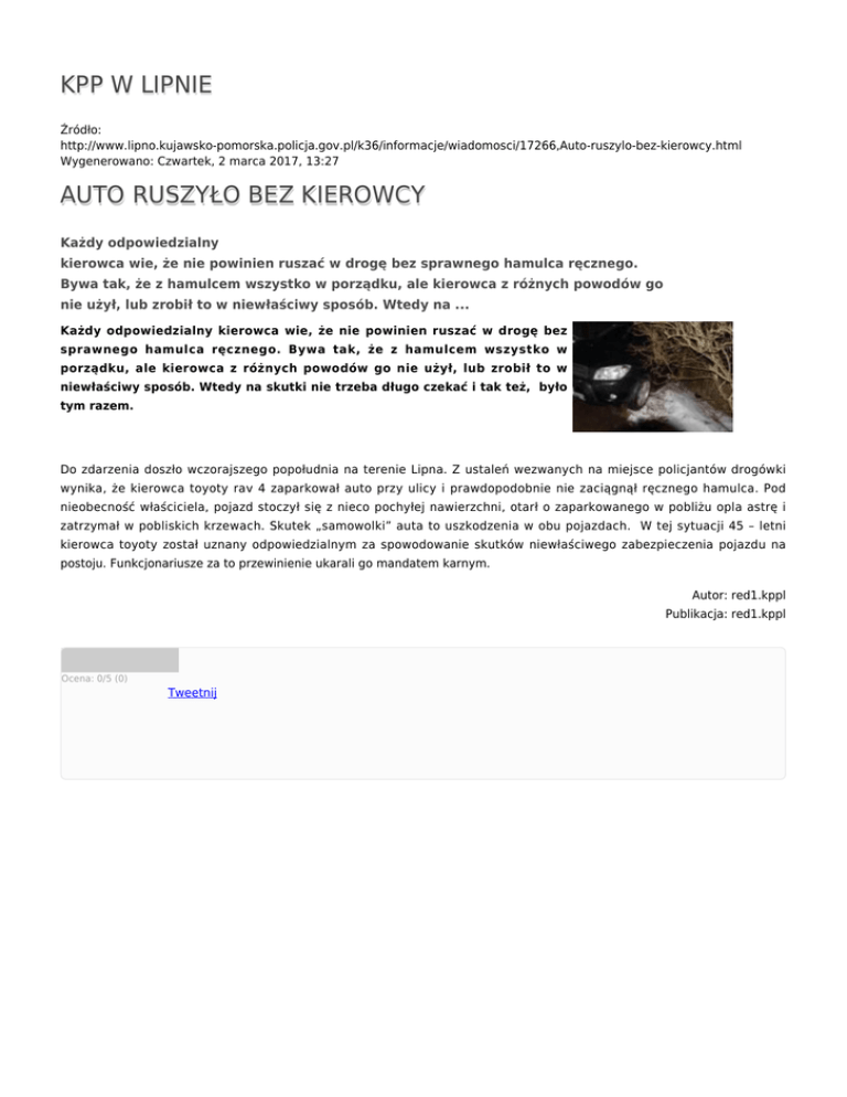 KPP W LIPNIE Źródło: http://www.lipno.kujawsko-pomorska.policja.gov.pl/k36/informacje/wiadomosci/17266,Auto-ruszylo-bez-kierowcy.html Wygenerowano: Czwartek, 2 marca 2017, 13:27 AUTO RUSZYŁO BEZ KIEROWCY Każdy odpowiedzialny kierowca wie, że nie powinien ruszać w drogę bez sprawnego hamulca ręcznego. Bywa tak, że z hamulcem wszystko w porządku, ale kierowca z różnych powodów go nie użył, lub zrobił to w niewłaściwy sposób. Wtedy na ... Każdy odpowiedzialny kierowca wie, że nie powinien ruszać w drogę bez sprawnego hamulca ręcznego. Bywa tak, że z hamulcem wszystko w porządku, ale kierowca z różnych powodów go nie użył, lub zrobił to w niewłaściwy sposób. Wtedy na skutki nie trzeba długo czekać i tak też, było tym razem. Do zdarzenia doszło wczorajszego popołudnia na terenie Lipna. Z ustaleń wezwanych na miejsce policjantów drogówki wynika, że kierowca toyoty rav 4 zaparkował auto przy ulicy i prawdopodobnie nie zaciągnął ręcznego hamulca. Pod nieobecność właściciela, pojazd stoczył się z nieco pochyłej nawierzchni, otarł o zaparkowanego w pobliżu opla astrę i zatrzymał w pobliskich krzewach. Skutek „samowolki” auta to uszkodzenia w obu pojazdach. W tej sytuacji 45 – letni kierowca toyoty został uznany odpowiedzialnym za spowodowanie skutków niewłaściwego zabezpieczenia pojazdu na postoju. Funkcjonariusze za to przewinienie ukarali go mandatem karnym. Autor: red1.kppl Publikacja: red1.kppl Ocena: 0/5 (0) Tweetnij