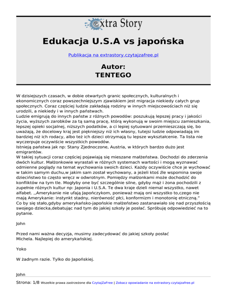 Edukacja U.S.A vs japońska Publikacja na extrastory.czytajzafree.pl Autor: TENTEGO W dzisiejszych czasach, w dobie otwartych granic społecznych, kulturalnych i ekonomicznych coraz powszechniejszym zjawiskiem jest migracja niekiedy całych grup społecznych. Coraz częściej ludzie zakładają rodziny w innych miejscowościach niż się urodzili, a niekiedy i w innych państwach. Ludzie emigrują do innych państw z różnych powodów: poszukują lepszej pracy i jakości życia, wyższych zarobków za tą samą pracę, którą wykonują w swoim miejscu zamieszkania, lepszej opieki socjalnej, niższych podatków, a ci lepiej sytuowani przemieszczają się, bo uważają, że docelowy kraj jest piękniejszy niż ich własny, tutejsi ludzie odpowiadają im bardziej niż ich rodacy, albo też ich dzieci otrzymają tu lepsze wykształcenie. Ta lista nie wyczerpuje oczywiście wszystkich powodów. Istnieją państwa jak np: Stany Zjednoczone, Austria, w których bardzo dużo jest emigrantów. W takiej sytuacji coraz częściej pojawiają się mieszane małżeństwa. Dochodzi do zderzenia dwóch kultur. Małżonkowie wyrastali w różnych systemach wartości i mogą wyznawać odmienne poglądy na temat wychowania swoich dzieci. Każdy oczywiście chce je wychować w takim samym duchu,w jakim sam został wychowany, a jeżeli ktoś źle wspomina swoje dzieciństwo to często wręcz w odwrotnym. Pomiędzy małżonkami może dochodzić do konfliktów na tym tle. Mogłyby one być szczególnie silne, gdyby mąż i żona pochodzili z zupełnie różnych kultur np: Japonia i U.S.A. Te dwa kraje dzieli niemal wszystko, nawet alfabet. ,,Amerykanie nie ufają Japończykom, ponieważ mają oni wszystko to,czego nie mają Amerykanie: instynkt stadny, nierówność płci, konformizm i monotonię etniczną.” Co by się stało,gdyby amerykańsko-japońskie małżeństwo zastanawiało się nad przyszłością swojego dziecka,debatując nad tym do jakiej szkoły je posłać. Spróbuję odpowiedzieć na to pytanie. John Przed nami ważna decyzja, musimy zadecydować do jakiej szkoły posłać Michela. Najlepiej do amerykańskiej. Yoko W żadnym razie. Tylko do Japońskiej. John Strona: 1/8 Wszelkie prawa zastrzeżone dla CzytajZaFree | Zobacz opowiadanie na extrastory.czytajzafree.pl Ameryka to najbogatszy kraj na świecie i ma najlepiej wykształcone społeczeństwo amerykańskie na świecie, jak mawia nasz prezydent. I nie chcesz żeby nasz syn do niego należał? Yoko Ależ oczywiście, że chcę. O niczym tak nie marzę jak o tym, żeby nasze dziecko wyrosło na ćwierćinteligenta w bezstresowym systemie nauczania. John Co masz na myśli? Yoko Wy Amerykanie to urodzeni optymiści. Wychowuje się was w duchu, że wszystko jest możliwe. Tak samo wychowujecie wasze dzieci. John A to źle? Co złego jest w myśleniu, że szklanka jest do połowy pełna? Yoko Chodzenie z głową w chmurach, brak trzeźwego osądu i nierealistyczne spojrzenie na świat. Macie nadmierne przekonanie o własnej wartości, idziecie przez świat z przyklejonymi uśmiechami. To nie jest prawdziwe,ale sztuczne. Nie chcę, żeby nasze dziecko było sztucznym tworem. John To nie jest sztuczne, po prostu cieszymy się z życia. Dzieci też to robią,a do nich nie masz pretensji. Yoko Dzieci to dzieci, im wolno,a wy jesteście już dorośli i na tym polega wasz problem. Nigdy nie dorastacie. John Na tym polega geniusz naszego systemu nauczania. Już od małego chowa się nas w wysokim mniemaniu o sobie, a potem zostaje nam to na całe życie. Yoko Pewnie. Grunt to dobre samopoczucie. Pewnie dlatego w niektórych szkołach zaprzestano sprawdzianów z pisowni,bo niektóre dzieciaki sobie z nimi nie radziły, a to burzyło ich wysokie mniemanie o sobie,a więc źle wpływało na ich samopoczucie. A to, że nie potrafią ani poprawnie pisać ani liczyć bez pomocy kalkulatora nie ma żadnego znaczenia, ważne, Strona: 2/8 Wszelkie prawa zastrzeżone dla CzytajZaFree | Zobacz opowiadanie na extrastory.czytajzafree.pl że dobrze się czują. John Przemawia przez ciebie sarkazm. Yoko Ty wiesz co to znaczy? John Widzisz więc może nasz system nauczania nie jest taki zły. Yoko Ale szkoły nie są najbezpieczniejsze. Podobno dwieście siedemdziesiąt tysięcy uczniów nosi do szkoły broń. John Tak, to jest problem. Yoko A ponad połowa amerykańskiej młodzieży opuszcza szkołę przed jej ukończeniem i bez perspektyw na otrzymanie dobrej pracy. John To też jest problem. Yoko Więc skoro oboje się zgadzamy, że edukacja w Stanach niesie wiele niedogodności w postaci problemów z przemocą, narkomanii i niskiego poziomu nauczania,to może rozpatrzymy zalety kształcenia w Japonii? John A są jakieś zalety? Yoko Całe mnóstwo. Ale po kolei. Japoński system oświaty dzieli się na 4 etapy: Szkołę podstawową trwającą 6 lat, szkołę średnią niższego stopnia trwającą 3 lata, szkołę średnia wyższego stopnia trwająca dalsze 3, potem studia trwające najczęściej 4 lata,z możliwością dalszych studiów podyplomowych,jak również całą gamę kolegiów technicznych trwających 2, 3 lata. Obowiązek nauki jest obowiązkowy do 15 roku życia w ramach szkoły podstawowej i szkoły średniej niższego stopnia. John Strona: 3/8 Wszelkie prawa zastrzeżone dla CzytajZaFree | Zobacz opowiadanie na extrastory.czytajzafree.pl Też mi rewelacja. W Stanach jest podobnie. Po etapie przedszkolnym dzieci idą do elemntary school w wieku 6 lat,a kończą ją w zależności od obranego systemu w wieku 12 lub 15 lat. A potem idą do high school, które może trwać 4 lub 6 lat. Są szkoły państwowe i prywatne, a te drugie są na ogół lepiej wyposażone. Nauka trwa różnie w obrębie różnych stanów, ale tak średnio do 16, 18 roku życia,a więc dłużej. Yoko Właśnie! Dzieci w Japonii są zdolniejsze, potrzebują mniej czasu niż te wasze amerykańskie matoły. John Przypominam ci, że twoje dziecko jest półkrwi takim właśnie mat