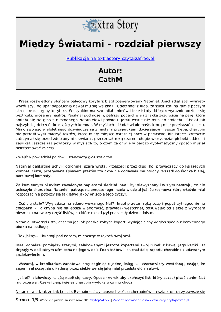 Między Światami - rozdział pierwszy Publikacja na extrastory.czytajzafree.pl Autor: CathM Przez rozświetlony słońcem pałacowy korytarz biegł zdenerwowany Nataniel. Anioł zdjął szal owinięty wokół szyi, bo upał popołudnia dawał mu się we znaki. Odetchnął z ulgą, zarzucił szal na ramię poczym skręcił w następny korytarz. W szybkim marszu mijał aniołów i inne istoty, którym wyraźnie udzielił się beztroski, wiosenny nastrój. Parsknął pod nosem, patrząc pogardliwie i z lekką zazdrością na parę, która śmiała się na głos z nieznanego Natanielowi powodu. Jemu wcale nie było do śmiechu. Chciał jak najszybciej dotrzeć do książęcych komnat. W myślach układał wiadomość, którą miał przekazać księciu. Mimo swojego wieloletniego doświadczenia z nagłymi przypadkami docierającymi spoza Nieba, cherubin nie potrafił wytłumaczyć faktów, które miały miejsce ostatniej nocy w pałacowej bibliotece. Wreszcie zatrzymał się przed zdobionymi drzwiami, przeczesał ręką czarne, długie włosy, wziął głęboki oddech i zapukał. Jeszcze raz powtórzył w myślach to, o czym za chwilę w bardzo dyplomatyczny sposób musiał poinformować księcia. - Wejść!- powiedział po chwili stanowczy głos zza drzwi. Nataniel delikatnie uchylił ogromne, szare wrota. Przeszedł przez długi hol prowadzący do książęcych komnat. Cisza, przerywana śpiewem ptaków zza okna nie dodawała mu otuchy. Wszedł do środka białej, barokowej komnaty. Za kamiennym biurkiem zawalonym papierami siedział Inael. Był niewyspany i w złym nastroju, co nie ucieszyło cherubina. Nataniel, patrząc na zmęczonego Inaela wiedział już, że rozmowa którą właśnie miał rozpocząć nie potoczy się tak łatwo jakby on sobie tego życzył. - Coś się stało? Wyglądasz na zdenerwowanego Nat?- Inael przetarł ręką oczy i popatrzył łagodnie na chłopaka. - To chyba nie najlepsza wiadomość, prawda?- westchnął, odsuwając od siebie z wyrazem niesmaku na twarzy część listów, na które nie zdążył przez cały dzień odpisać. Nataniel otworzył usta, obserwując jak paczka żółtych kopert, wydając cichy odgłos spadła z kamiennego biurka na podłogę. - Tak jakby... - burknął pod nosem, miętosząc w rękach swój szal. Inael odnalazł pomiędzy szarymi, zalakowanymi jeszcze kopertami swój kubek z kawą. Jego kąciki ust drgnęły w delikatnym uśmiechu na jego widok. Podniósł brwi i słuchał dalej raportu cherubina z udawanym zaciekawieniem. - Wczoraj, w kronikarium zanotowaliśmy zaginięcie jednej księgi... - czarnowłosy westchnął, czując, że zapomniał skrzętnie układaną przez siebie wersję jaką miał przedstawić Inaelowi. - Jakiej?- białowłosy książę napił się kawy. Opuścił wzrok aby skończyć list, który zaczął pisać zanim Nat mu przerwał. Czekał cierpliwie aż cherubin wyduka o co mu chodzi. Nataniel wiedział, że tak będzie. Był najmłodszy spośród sześciu cherubinów i reszta kronikarzy zawsze się Strona: 1/9 Wszelkie prawa zastrzeżone dla CzytajZaFree | Zobacz opowiadanie na extrastory.czytajzafree.pl nim wysługiwała w kłopotliwych sytuacjach, a on zawsze dawał się w to wciągnąć, obiecując sobie że „to już ostatni raz”. Przeklinał teraz w duchu swoją naiwność. - Tej napisanej przez pańskiego poprzednika...Samuela... - dodał jednym tchem. - Precyzuj... - Inael zupełnie nie miał nastroju do zgadywanek. Chciał szybko wysłuchać cherubina i wrócić do swoich zajęć, a niespodziewana wizyta Nataniela rozpraszała go, z każdą sekundą coraz bardziej zniechęcając do pracy. Wstał, nie mogąc już patrzeć na stertę niebieskich listów od astrologów. Zaczął chodzić po gabinecie, rozprostowując kości. - Księgi aniołów... Liber Angelorum bodajże... - wyjaśnił Nataniel, obserwując jak Inael z satysfakcją wyrzuca do śmieci listy, na które już odpowiedział. Książę, słysząc nazwę księgi zapomniał o listach i popatrzył na cherubina. - Jak to się mogło stać?- zapytał spokojnie. Opanowanie w kryzysowych sytuacjach było wielką zaletą Inaela. Nataniel bał się tego pytania, bo powinien na nie znać odpowiedź, a tak niestety nie było. - No właśnie nie mamy pojęcia... cały czas przynajmniej troje cherubów było w bibliotece, komputer nie zanotował włamania ale Księgi nie ma... - nie skończył zdania, gdy usłyszał odgłos obcasów w holu. Do komnaty wpadła, nie pukając rudowłosa dziewczyna. Uspokoiła oddech, ukłoniła się niechlujnie i nerwowo poprawiła rozczochrane włosy. - Książę, czip którym znakowana była Księga wykazał jej lokalizację... - wydyszała. Inael oparł się o biurko, zaczynając się niepokoić wieścią przyniesioną przez Nataniela. - Gdzie ją zlokalizowaliście?- zapytał, dopijając resztę kawy i próbując się odnaleźć w zaistniałej sytuacji. - Na Ziemi... - Sourel złapała oddech. Popatrzyła na bladego ze zdenerwowania Nataniela, który spojrzeniem dziękował jej za przyjście i wsparcie. Inael był podirytowany całą sytuacją. Patrzył spode łba na Nataniela i Sourel. Poważnie się zastanawiał nad kompetencjami swoich podwładnych. - No to ją znajdźcie - burknął. - Po co do mnie z tym przychodzicie zamiast jej szukać...!?- cierpliwość księcia powoli się kończyła. Sourel nie ucieszył podniesiony ton Inaela. Wbiła wzrok w posadzkę z czerwonego marmuru i zaczęła wiercić w niej dziurę obcasem. - Niestety straciliśmy sygnał... - starała się uśmiechnąć co nie za bardzo pomogło, gdyż Inael był coraz bardziej zdenerwowany. Białowłosy podszedł do okna i popatrzył na słońce wędrujące leniwie w stronę horyzontu. - Powinien tym się zająć ziemski dyplomata... - odparł przyciszonym głosem, tak że cherubini ledwo mogli te słowa usłyszeć. - Ale oczywiście od śmierci poprzedniego następny nie został wybrany! - krzyknął i huknął pięścią o parapet, płos
