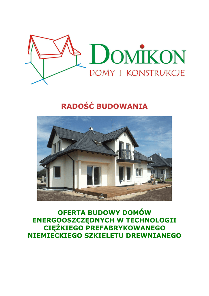 RADOŚĆ BUDOWANIA OFERTA BUDOWY DOMÓW ENERGOOSZCZĘDNYCH W TECHNOLOGII CIĘśKIEGO PREFABRYKOWANEGO NIEMIECKIEGO SZKIELETU DREWNIANEGO Oferta firmy DOMIKON DOMY ENERGOOSZCZĘDNE W TECHNOLOGII CIĘŻKIEGO NIEMIECKIEGO SZKIELETU DREWNIANEGO Spis treści O firmie .................................................................................. 3 Misja firmy DOMIKON .......................................................... 3 Wizja firmy DOMIKON.......................................................... 3 Wartości DOMIKON .............................................................. 3 Opis technologiczny budowy DOMIKON ............................ 4 PAKIET INNOWACYJNY DOMIKON ......................................5 Zalety technologii DOMIKON................................................7 HURAGANY, POWODZIE, TRZĘSIENIA ZIEMI A TECHNOLOGIA DOMIKON .................................................... 8 Zalety współpracy z firmą DOMIKON ................................. 9 PORÓWNIE TECHNOLOGII BUDOWANIA DOMÓW ............ 9 Przykładowy kosztorys budowy domu DOMIKON............ 12 Standardy wykonania DOMIKON - CENNIK ...................... 17 Strona 2 z 17 Oferta firmy DOMIKON DOMY ENERGOOSZCZĘDNE W TECHNOLOGII CIĘŻKIEGO NIEMIECKIEGO SZKIELETU DREWNIANEGO O firmie Misja firmy DOMIKON „Szacunek i profesjonalizm w obsłudze Klienta na kaŜdym etapie współpracy oraz elastyczność w realizacji Jego wymagań i potrzeb, niezwykła staranność wykonawstwa oraz dbałość o detale, dotrzymywanie terminów, ciągłe doskonalenie i wprowadzanie innowacji technologicznych to fundamenty naszego istnienia i działania”. Wizja firmy DOMIKON „Klient jest dla nas najwaŜniejszy. Chcemy, aby nasi Klienci byli dumni z tego, Ŝe budują swój wymarzony dom z firmą DOMIKON i aby przez to stanowili najlepsze źródło reklamy i referencji dla naszych następnych potencjalnych Klientów.” Wartości DOMIKON 1. SZACUNEK - dla naszych Klientów 2. JAKOŚĆ - jest najwaŜniejsza: dbamy o całość budowy i o detale 3. WIARYGODNOŚĆ + referencje od zadowolonych Klientów + 30 lat gwarancji na konstrukcję budynku +Nagrody: Gazele Biznesu i Eurocertyfikat Wiarygodności Firmy +ubezpieczenie OC na kaŜdy budowany dom 4. KOMPLEKSOWOŚĆ - budujemy domy od A (wykonania projektu) do Z (pod klucz) 5. ODWAGA - lubimy wyzwania: nie ma dla nas trudnych projektów WEJDŹ NA NASZĄ STRONĘ INTERNETOWĄ: www.domikon.pl www.domydrewniane.pl Strona 3 z 17 Oferta firmy DOMIKON DOMY ENERGOOSZCZĘDNE W TECHNOLOGII CIĘŻKIEGO NIEMIECKIEGO SZKIELETU DREWNIANEGO TWÓJ WYMARZONY DOM BĘDZIE: D DOBRZE SKONSTRUOWANY O OSZCZĘDNY - 70% TAŃSZY W EKSPLOATACJI M MOCNY i TRWAŁY - NA 100 LAT I IZOLOWANY CIEPLNIE I AKUSTYCZNIE K KOMFORTOWY - ZDROWY I CZYSTY O OGNIOTRWAŁY – TRUDNOPALNE MATERIAŁY N NOWOCZESNY W TECHNOLOGII FIRMA, KTÓRA CI GO WYBUDUJE TO: D DOŚWIADCZONE EKIPY - 14 LAT NA RYNKU O OC (ODPOWIEDZIALNOŚĆ CYWILNA) – NA KAŻDY DOM M MODYFIKACJE PROJEKTU W CENIE I INICJATYWA I PROFESJONALNE DORADZTWO K KLIENCI – ZADOWLENI I WDZIĘCZNI O ODWAGA PRZY REALIZACJI TRUDNYCH PROJEKTÓW N NAGRODY - EUROCERTYFIKAT WIARYGODNOŚCI FIRMY 2007 - GAZELE BIZNESU 2009 Opis technologiczny budowy DOMIKON Firma DOMIKON buduje domy w oparciu o technologię szkieletową prefabrykowaną (tzw. cięŜki szkielet niemiecki), czyli przygotowuje w fabryce poszczególne elementy domu (tj. np. ściany zewnętrzne, działowe, dach) w tzw. szkielecie drewnianym zbudowanym w oparciu o grube 16 cm belki. Następnie poszczególne elementy domu ładowane są na samochód cięŜarowy (TIR) i przewoŜone na plac budowy, następnie wykonywany jest montaŜ budynku. Równolegle z prefabrykacją moŜliwa jest budowa przez firmę DOMIKON tradycyjnych betonowych fundamentów, a całość budowy domu w stanie deweloperskim (z instalacjami) moŜe być wykonana w ok. 3 miesiące. Strona 4 z 17 Oferta firmy DOMIKON DOMY ENERGOOSZCZĘDNE W TECHNOLOGII CIĘŻKIEGO NIEMIECKIEGO SZKIELETU DREWNIANEGO PAKIET INNOWACYJNY DOMIKON 1. Budujemy domy w technologii cięŜkiego szkieletu drewnianego, co w odróŜnieniu od technologii lekkiej – kanadyjskiej a takŜe murowanej oznacza: prefabrykację wszystkich elementów konstrukcji w tym ścian i dachu w zakładzie produkcyjnym, pod dachem niezaleŜnie od warunków pogodowych w stałej temperaturze, bardzo wysoką precyzję zespolenia poszczególnych elementów ze sobą – w poziomie, a nie w pionie jak przy technologii kanadyjskiej, zastosowanie dwóch płyt OSB w poszyciu ścian zewnętrznych oraz grubych belek 16x6 cm zapewnia doskonałą stabilność i trwałość budynku; gruba 16 cm warstwa wełny mineralnej wewnątrz i 5 cm twardej wełny na zewnątrz zapewnienia właściwą izolację termiczną i akustyczną z zewnątrz budynku. (w technologii kanadyjskiej: jedna płyta OSB oraz belki 10x4 cm, wełna 10 cm). z uwagi na wytrzymałość konstrukcji ścian domu (grube 16 cm belki i podwójna płyta OSB w poszyciu) jest moŜliwość wylania na strop wylewki cementowej – co oznacza znakomite wygłuszenie akustyczne domu, moŜliwość zastosowania cięŜkiej dachówki cementowej lub ceramicznej zamiast np. powszechnej w technologii kanadyjskiej balchodachówki powodującej hałas przy wszelkich opadach atmosferycznych a takŜe olbrzymie nagrzewanie się w lecie zwłaszcza uŜytkowej części poddasza. Podwójna płyta OSB zastosowana w ścianach działowych i nośnych wewnątrz domu znakomicie wygłusza wraz z wełną wygłuszającą wszelkie hałasy pomiędzy pomieszczeniami. Współczynnik przenikania ciepła przy zastosowaniu naszej technologii waha się w zaleŜności od lokalnych uwarunkowań w granicach U = 0,14 do 0,19 co oznacza zapotrzebowanie na energię w wysokości ok. 40-60 kWh/m2 na rok. Dla domu murowanego norma to 150 kWh/m2 na rok, a dla domu bardzo ocieplonego tego typu wartość ta wynosi ok. 120 kWh/m2 na rok. To wprost oznacza, Ŝe oszczędności na kosztach ogrzewania domu wybudowane