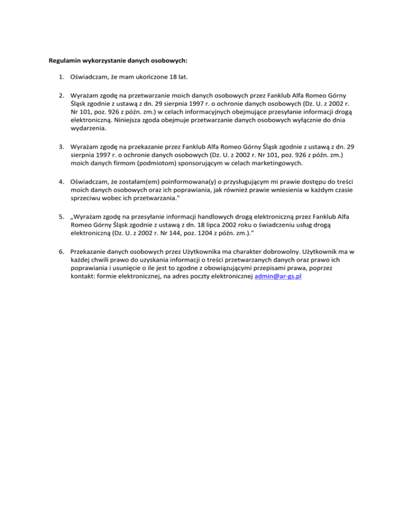 Regulamin wykorzystanie danych osobowych: 1. Oświadczam, że mam ukończone 18 lat. 2. Wyrażam zgodę na przetwarzanie moich danych osobowych przez Fanklub Alfa Romeo Górny Śląsk zgodnie z ustawą z dn. 29 sierpnia 1997 r. o ochronie danych osobowych (Dz. U. z 2002 r. Nr 101, poz. 926 z późn. zm.) w celach informacyjnych obejmujące przesyłanie informacji drogą elektroniczną. Niniejsza zgoda obejmuje przetwarzanie danych osobowych wyłącznie do dnia wydarzenia. 3. Wyrażam zgodę na przekazanie przez Fanklub Alfa Romeo Górny Śląsk zgodnie z ustawą z dn. 29 sierpnia 1997 r. o ochronie danych osobowych (Dz. U. z 2002 r. Nr 101, poz. 926 z późn. zm.) moich danych firmom (podmiotom) sponsorującym w celach marketingowych. 4. Oświadczam, że zostałam(em) poinformowana(y) o przysługującym mi prawie dostępu do treści moich danych osobowych oraz ich poprawiania, jak również prawie wniesienia w każdym czasie sprzeciwu wobec ich przetwarzania." 5. „Wyrażam zgodę na przesyłanie informacji handlowych drogą elektroniczną przez Fanklub Alfa Romeo Górny Śląsk zgodnie z ustawą z dn. 18 lipca 2002 roku o świadczeniu usług drogą elektroniczną (Dz. U. z 2002 r. Nr 144, poz. 1204 z późn. zm.).” 6. Przekazanie danych osobowych przez Użytkownika ma charakter dobrowolny. Użytkownik ma w każdej chwili prawo do uzyskania informacji o treści przetwarzanych danych oraz prawo ich poprawiania i usunięcie o ile jest to zgodne z obowiązującymi przepisami prawa, poprzez kontakt: formie elektronicznej, na adres poczty elektronicznej [email protected]