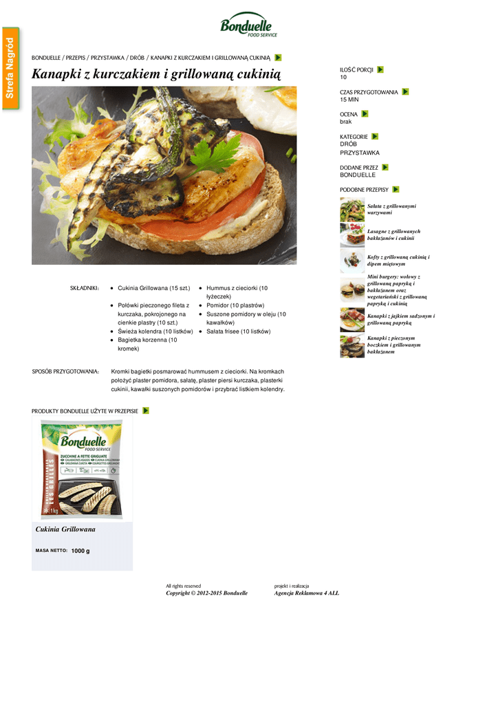 BONDUELLE / PRZEPIS / PRZYSTAWKA / DRÓB / KANAPKI Z KURCZAKIEM I GRILLOWANĄ CUKINIĄ Kanapki z kurczakiem i grillowaną cukinią ILOŚĆ PORCJI 10 CZAS PRZYGOTOWANIA 15 MIN OCENA brak KATEGORIE DRÓB PRZYSTAWKA DODANE PRZEZ BONDUELLE PODOBNE PRZEPISY Sałata z grillowanymi warzywami Lasagne z grillowanych bakłażanów i cukinii Kofty z grillowaną cukinią i dipem miętowym SKŁADNIKI: Cukinia Grillowana (15 szt.) Połówki pieczonego fileta z kurczaka, pokrojonego na cienkie plastry (10 szt.) Świeża kolendra (10 listków) Bagietka korzenna (10 kromek) SPOSÓB PRZYGOTOWANIA: Hummus z cieciorki (10 łyżeczek) Pomidor (10 plastrów) Suszone pomidory w oleju (10 kawałków) Sałata frisee (10 listków) Kromki bagietki posmarować hummusem z cieciorki. Na kromkach położyć plaster pomidora, sałatę, plaster piersi kurczaka, plasterki cukinii, kawałki suszonych pomidorów i przybrać listkiem kolendry. PRODUKTY BONDUELLE UŻYTE W PRZEPISIE Cukinia Grillowana MASA NETTO: 1000 g All rights reserved projekt i realizacja Copyright © 2012-2015 Bonduelle Agencja Reklamowa 4 ALL Mini burgery: wołowy z grillowaną papryką i bakłażanem oraz wegetariański z grillowaną papryką i cukinią Kanapki z jajkiem sadzonym i grillowaną papryką Kanapki z pieczonym boczkiem i grillowanym bakłażanem