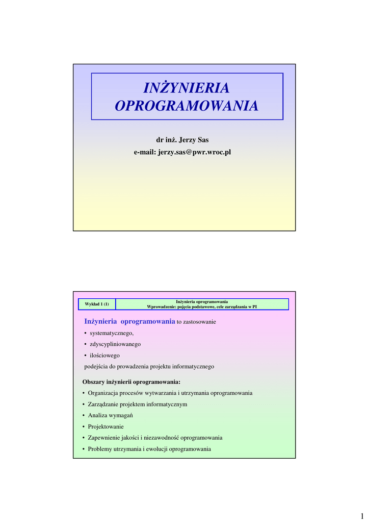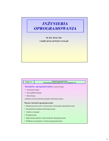 INŻYNIERIA OPROGRAMOWANIA dr inż. Jerzy Sas e-mail: [email protected] Wykład 1 (1) Inżynieria oprogramowania Wprowadzenie: pojęcia podstawowe, cele zarządzania w PI Inżynieria oprogramowania to zastosowanie • systematycznego, • zdyscypliniowanego • ilościowego podejścia do prowadzenia projektu informatycznego Obszary inżynierii oprogramowania: • Organizacja procesów wytwarzania i utrzymania oprogramowania • Zarządzanie projektem informatycznym • Analiza wymagań • Projektowanie • Zapewnienie jakości i niezawodność oprogramowania • Problemy utrzymania i ewolucji oprogramowania 1 Wykład 1 (2) Inżynieria oprogramowania Wprowadzenie: pojęcia podstawowe, cele zarządzania w PI Projekt informatyczny – przedsięwzięcie wymagające zaangażowania określonych zasobów ludzkich, którego celem jest przygotowanie do użycia produktu programistycznego • Realizacja i uruchomienie ogólnokrajowej sieci teleinformatycznej, • Implementacja, uruchomienie i wdrożenie ogólnokrajowego systemu zbierania, przetwarzania i udostępniania danych (np. dla ZUS, służby granicznej, innych służb publicznych), • Implementacja i wdrożenie kompleksowego systemu zarządzania przedsiębiorstwem, • Implementacja i wdrożenie systemu informatycznego obsługującego wybrany obszar działalności przedsiębiorstwa (np.. system kadrowo-płacowy, finansowo-księgowy, magazynowy, zarządzania kontaktami z klientami). • Zaprojektowanie, implementacja i wprowadzenie na rynek programu dla masowego odbiorcy indywidualnego (np. programu do wypełniania zeznań podatkowych) • Wykonanie biblioteki na użytek innego przedsięwzięcia programistycznego. • Rozszerzenie funkcjonującego oprogramowania o nową funkcjonalność Wykład 1 (3) Inżynieria oprogramowania Wprowadzenie: pojęcia podstawowe, cele zarządzania w PI Różnice w specyfice zarządzania PI a zarządzaniem w innych dziedzinach inżynierii: Krótki okres rozwoju inżynierii oprogramowania, Abstrakcyjny charakter materii Brak sprawdzonych wzorców postępowania dla różnych kategorii projektów, Mała powtarzalność wykonywanych działań (duży indywidualizm projektów), Znacznie większy stopień złożoności logicznej projektowanych i wytwarzanych produktów Brak wyraźnego podziału na fazę projektową i wykonawczą, Brak ustalonych norm zużycia zasobów (w szczególności czasu pracy) dla wykonania elementów projektu o określonych miarach wielkości i złożoności, W konsekwencji powyższego: Trudności w szacowaniu czasu i kosztów realizacji projektu Częste opóźnienia w dostarczaniu produktu, Niska jakość dostarczanych produktów. 2 Wykład 1 (3) Inżynieria oprogramowania Wprowadzenie: pojęcia podstawowe, cele zarządzania w PI Celem inżynierii oprogramowania jest opracowanie i analiza metod stosowanych na wszystkich etapach procesu tworzenia produktu informatycznego, pozwalających rozwiązywać specyficzne problemy występujące w tym procesie przy uwzględnieniu specyfiki projektu informatycznego gdzie: Proces tworzenia produktu informatycznego - zbiór czynności i związanych z nimi wyników, które prowadzą do wytworzenia produktu Wykład 1 (4) Inżynieria oprogramowania Wprowadzenie: pojęcia podstawowe, cele zarządzania w PI Program: Wstęp, pojęcia podstawowe, procesy w przedsięwzięciu informatycznym, fazy realizacji projektu informatycznego, zakresy i produkty realizacji faz, działania i role w kolejnych fazach, cele zarządzania w projekcie informatycznym, cykle życia projektów informatycznych, Przykładowe metodyki prowadzenia projektów informatycznych (USDP, Extreme Programming) Elementy zarządzania wymaganiami, Ocena złożoności projektu, szacowanie zapotrzebowania na zasoby Zapewnienie jakości w projekcie informatycznym (atrybuty jakości, podstawowe działania i techniki z zakresu zapewnienia jakości, role w procesie zapewnienia jakości ) Znaczenie oraz sposób organizacji przeglądów, inspekcji i audytów w różnych fazach realizacji PI Metody i techniki testowania oprogramowania Ocena procesu zarządzania projektem informatycznym – SEI Capability Maturity Model Certyfikat jakości ISO 9001:2000 w zakresie wytwarzania oprogramowania Organizacja pracy działu wytwarzania oprogramowania – podejście procesowe Kolokwium 3 Wykład 1 (5) Inżynieria oprogramowania Wprowadzenie: pojęcia podstawowe, cele zarządzania w PI Literatura: Sommerville I., Inżynieria oprogramowania, WNT, W-wa, 2003 Górski J., Inżynieria oprogramowania w projekcie informatycznym, wyd. II, MIKOM, Wwa, 2001, Beck K., Wydajne programowanie, Extreme Programming, Wydawnictwo MIKOM, 2001 Astels D., Miller G., Novak M., eXtreme Programming, Helion, 2002 Patton R., Testowanie oprogramowania, MIKOM, 2002 Jaszkiewicz A., Inżynieria oprogramowania, Helion, 1997 Hunt A., Thomas D., Pragmatyczny programista, WNT, 2002 Maguire S., Niezawodność oprogramowania, Helion, 2002 Szyjewski Z., Zarządzanie projektami informatycznymi, metodyka tworzenia systemów informatycznych, Agencja wydawnicza Placet, W-wa, 2001 Flasiński M., Zarządzanie projektami informatycznymi, PWN, W-wa, 2006 Sas J., Industrial Software Quality. Draft Course Materials. Raport SPR 12/1998, Wydziałowy Zakład Informatyki, Politechnika Wrocławska, 1998 Wykład 1 (6) Inżynieria oprogramowania Wprowadzenie: pojęcia podstawowe, cele zarządzania w PI Literatura (c.d.): Wiśniewska M., Droga przedsiębiorstwa do uzyskania certyfikatu ISO 9000, ODDK Gdańsk, 2001 Wiśniewska M., Normy ISO serii 9000:2000, wymagania, analiza, wdrażanie, ODDK, Gdańsk, 2001, Brooks F.P., Mityczny osobomiesiąc, eseje o inżynierii oprogramowania, WNT, 2000 Yourdon E., Marsz ku klęsce, poradnik dla projektanta systemów, WNT, 2000 Ciekawe miejsca w sieci: http://www.sei.cmu.edu - Software Engineering Institute http://www-306.ibm.com/software/rational/sw-library/ - baza artykułów dotyczących IO oraz narzędzi CASE http://www.ipipan.waw.pl/~
