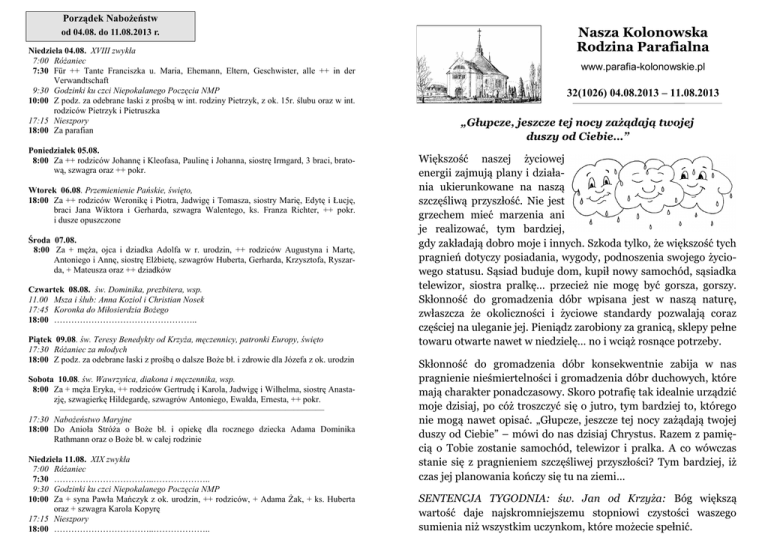 Porządek Nabożeństw od 04.08. do 11.08.2013 r. Niedziela 04.08. XVIII zwykła 7:00 Różaniec 7:30 Für ++ Tante Franciszka u. Maria, Ehemann, Eltern, Geschwister, alle ++ in der Verwandtschaft 9:30 Godzinki ku czci Niepokalanego Poczęcia NMP 10:00 Z podz. za odebrane łaski z prośbą w int. rodziny Pietrzyk, z ok. 15r. ślubu oraz w int. rodziców Pietrzyk i Pietruszka 17:15 Nieszpory 18:00 Za parafian Poniedziałek 05.08. 8:00 Za ++ rodziców Johannę i Kleofasa, Paulinę i Johanna, siostrę Irmgard, 3 braci, bratową, szwagra oraz ++ pokr. Wtorek 06.08. Przemienienie Pańskie, święto, 18:00 Za ++ rodziców Weronikę i Piotra, Jadwigę i Tomasza, siostry Marię, Edytę i Łucję, braci Jana Wiktora i Gerharda, szwagra Walentego, ks. Franza Richter, ++ pokr. i dusze opuszczone Środa 07.08. 8:00 Za + męża, ojca i dziadka Adolfa w r. urodzin, ++ rodziców Augustyna i Martę, Antoniego i Annę, siostrę Elżbietę, szwagrów Huberta, Gerharda, Krzysztofa, Ryszarda, + Mateusza oraz ++ dziadków Czwartek 08.08. św. Dominika, prezbitera, wsp. 11.00 Msza i ślub: Anna Koziol i Christian Nosek 17:45 Koronka do Miłosierdzia Bożego 18:00 ………………………………………….. Piątek 09.08. św. Teresy Benedykty od Krzyża, męczennicy, patronki Europy, święto 17:30 Różaniec za młodych 18:00 Z podz. za odebrane łaski z prośbą o dalsze Boże bł. i zdrowie dla Józefa z ok. urodzin Sobota 10.08. św. Wawrzyńca, diakona i męczennika, wsp. 8:00 Za + męża Eryka, ++ rodziców Gertrudę i Karola, Jadwigę i Wilhelma, siostrę Anastazję, szwagierkę Hildegardę, szwagrów Antoniego, Ewalda, Ernesta, ++ pokr. —–————–——————–—————–—————————–––—— 17:30 Nabożeństwo Maryjne 18:00 Do Anioła Stróża o Boże bł. i opiekę dla rocznego dziecka Adama Dominika Rathmann oraz o Boże bł. w całej rodzinie Niedziela 11.08. XIX zwykła 7:00 Różaniec 7:30 ……………………………..……………….. 9:30 Godzinki ku czci Niepokalanego Poczęcia NMP 10:00 Za + syna Pawła Mańczyk z ok. urodzin, ++ rodziców, + Adama Żak, + ks. Huberta oraz + szwagra Karola Kopyrę 17:15 Nieszpory 18:00 ……………………………..……………….. Nasza Kolonowska Rodzina Parafialna www.parafia-kolonowskie.pl 32(1026) 04.08.2013 – 11.08.2013 „Głupcze, jeszcze tej nocy zażądają twojej duszy od Ciebie…” Większość naszej życiowej energii zajmują plany i działania ukierunkowane na naszą szczęśliwą przyszłość. Nie jest grzechem mieć marzenia ani je realizować, tym bardziej, gdy zakładają dobro moje i innych. Szkoda tylko, że większość tych pragnień dotyczy posiadania, wygody, podnoszenia swojego życiowego statusu. Sąsiad buduje dom, kupił nowy samochód, sąsiadka telewizor, siostra pralkę… przecież nie mogę być gorsza, gorszy. Skłonność do gromadzenia dóbr wpisana jest w naszą naturę, zwłaszcza że okoliczności i życiowe standardy pozwalają coraz częściej na uleganie jej. Pieniądz zarobiony za granicą, sklepy pełne towaru otwarte nawet w niedzielę… no i wciąż rosnące potrzeby. Skłonność do gromadzenia dóbr konsekwentnie zabija w nas pragnienie nieśmiertelności i gromadzenia dóbr duchowych, które mają charakter ponadczasowy. Skoro potrafię tak idealnie urządzić moje dzisiaj, po cóż troszczyć się o jutro, tym bardziej to, którego nie mogą nawet opisać. „Głupcze, jeszcze tej nocy zażądają twojej duszy od Ciebie” – mówi do nas dzisiaj Chrystus. Razem z pamięcią o Tobie zostanie samochód, telewizor i pralka. A co wówczas stanie się z pragnieniem szczęśliwej przyszłości? Tym bardziej, iż czas jej planowania kończy się tu na ziemi… SENTENCJA TYGODNIA: św. Jan od Krzyża: Bóg większą wartość daje najskromniejszemu stopniowi czystości waszego sumienia niż wszystkim uczynkom, które możecie spełnić. 32/2013 Bóg zapłać za każdą zanoszoną modlitwę, ofiarowaną Komunię św. wspólną i indywidualną, słowa życzliwości, kartki od dzieci. Bóg zapłać o. Adamowi i o. Józefowi za modlitwę, pomoc, troskę i życzliwość. Bóg zapłać wszystkim za troskę o parafię, duchową i materialną. Za każdą wykonaną pracę, codzienną, cichą oraz widoczną, na wiele lat służącą. Za dbałość o wnętrze świątyni i zewnętrzne otoczenie. Z serca dziękuję siostrze Deborze. Z prac wykonanych w ostatnim czasie to zostały zamontowane nowe lampy na placu kościelnym (pobierają mniej energii niż stare), przeprowadzono przegląd i konserwację organów. Bóg zapłać za prace wykonane po zalaniu wodą naszych piwnic, szczególnie naprawę hydroforu i zabezpieczenie kuchni Caritas. Trwają prace w piwnicy i salce klasztoru. Wakacje z Bogiem dla dzieci z różnych względów (zalana kuchnia) w tym roku się nie odbyły. W zamian w sierpniu jest wyjazd do Wisły oraz spotkanie pod koniec sierpnia w ogrodach plebanii. W przyszłości, mamy nadzieję, znowu wakacje dla dzieci będą w tradycyjnej formie. Szczęść Boże! ——————————————————————————— Na wesoło Późniejszy proboszcz z Ars, Jan Vianney, jeszcze seminarzysta, zetknął się z pewnym bardzo surowym egzaminatorem. Egzamin był prawdziwą klęską. Na jego zakończenie profesor powiedział: Drogi Vianney, jesteś całkowitym ignorantem. Na co, Twoim zdaniem, potrzebny jest osioł? Przyszły święty powiedział: Skoro Samson powalił trzy tysiące Filistynów za pomocą oślej szczęki, czegóż nie dokona Pan, mając do dyspozycji całego osła? Ksiądz do wiernych w czasie ogłoszeń: O ile mi wiadomo, aniołowie pańscy dawno już przeszli na zamki błyskawiczne i stąd prośba do was, dobre dusze, aby nie wrzucać guzików do parafialnej skarbonki. Wikary na katechezie pyta dzieci: Ile mamy przykazań Bożych? Dziesięć – pada odpowiedź. A ile kościelnych? Dwóch – pan Fra