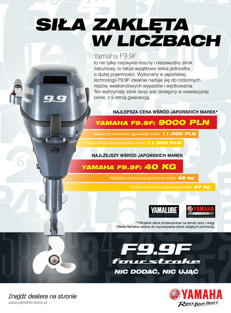 SIŁA ZAKLĘTA W LICZBACH Yamaha F9.9F to nie tylko niezwykle mocny i niezawodny silnik zaburtowy, to także wyjątkowo lekka jednostka o dużej pojemności. Wykonany w japońskiej technologii F9.9F idealnie nadaje się do rodzinnych rejsów, weekendowych wypadów i wędkowania. Ten wytrzymały silnik teraz jest dostępny w rewelacyjnej cenie, z 5-letnią gwarancją. NAJLEPSZA CENA WŚRÓD JAPOŃSKICH MAREK* Yamaha F9.9F: 9000 PLN Najbliższy konkurent japońskiej marki: 11.000 PLN Kolejny konkurent japońskiej marki: 11.500 PLN NAJLŻEJSZY WŚRÓD JAPOŃSKICH MAREK Yamaha F9.9F: 40 kg Najbliższy konkurent japońskiej marki: 42 kg Kolejny konkurent japońskiej marki: 47 kg *Oficjalne dane producentów na temat ceny i wagi. Oferta Yamaha ważna do wyczerpania sztuk objętych promocją. NIC DODAĆ, NIC UJĄĆ Znajdź dealera na stronie www.yamaha-motor.pl