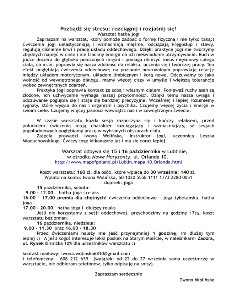 Pozbądź się stresu: rozciągnij i rozjaśnij się! Warsztat hatha jogi Zapraszam na warsztat, który pomoże zadbać o formę fizyczną i nie tylko taką:) Ćwiczenia jogi uelastyczniają i wzmacniają mięśnie, odciążają kręgosłup i stawy, regulują ciśnienie krwi i pracę układu oddechowego. Dzięki praktyce jogi nie tworzymy zbędnych napięć w ciele i nie tracimy energii na ich nieświadome utrzymywanie. Ruch w jodze dociera do głęboko położonych mięśni i pomaga obniżyć tonus mięśniowy całego ciała, co m.in. poprawia się nasza zdolność do relaksu, uczenia się i twórczej pracy. Ten efekt pogłębiają ćwiczenia oddechowe; na poziomie neuronalnym poprawiają relację między układem motorycznym, układem limbicznym i korą nową. Odczuwamy to jako wolność od wewnętrznego dialogu, mamy więcej ciszy w umyśle i większą tolerancję wobec zewnętrznych zdarzeń. Praktyka jogi poprawia kontakt ze sobą i własnym ciałem. Ponieważ ruchy asan są złożone, ich uchwycenie wymaga naszej przytomności. Dzięki temu nasza uwaga i odczuwanie pogłębia się i staje się bardziej precyzyjne. Wcześniej i lepiej rozumiemy sygnały, które wysyła do nas i organizm i psychika. Czujemy więcej życia i energii w swoim ciele. Czujemy więcej jasności wewnątrz nas i w zewnętrznym świecie. W czasie warsztatu każda sesja rozpoczyna się i kończy relaksem, przed południem ćwiczenia mają charakter rozciągający i wzmacniający, w sesjach popołudniowych pogłębiamy pracę w wybranych obszarach ciała. Zajęcia prowadzi Iwona Wolińska, instruktor jogi, uczennica Leszka Mioduchowskiego. Ćwiczy jogę kilkanaście lat i ma się coraz lepiej. Warsztat odbywa się 15 i 16 października w Lublinie, w ośrodku Nowe Horyzonty, ul. Orlanda 10. http://www.mapofpoland.pl/Lublin,mapa,10,Orlanda.html Koszt warsztatu: 160 zł, dla osób, które wpłacą do 30 września: 140 zł. Wpłata na konto: Iwona Wolińska, 50 1020 5558 1111 1773 2280 0051 dopisek: joga 15 października, sobota: 9.00 – 12.00 hatha joga i relaks 16.00 – 17.00 premia dla chętnych! ćwiczenia oddechowe - joga tybetańska, hatha joga 17.00 – 20.00 hatha joga i dłuższy relaks Jeśli nie korzystamy z sesji oddechowej, przychodzimy na godzinę 17tą, koszt warsztatu bez zmian. 16 października, niedziela: 9.00 – 11.30 oraz 16.00 – 18.30 Przed ćwiczeniami należy nie jeść przynajmniej 1 godzinę, im dłużej tym lepiej :) A jeśli kogoś interesuje lekki posiłek na Starym Mieście, w naleśnikarni Zadora, ul. Rynek 8 zniżka 10% dla uczestników warsztatu :) kontakt mailowy: [email protected] i telefoniczny: 608 212 639 (wyjątek: od 22 do 27 września sama uczestniczę w warsztacie, nie odbieram telefonów, tylko odpisuję na smsy). Zapraszam serdecznie Iwona Wolińska