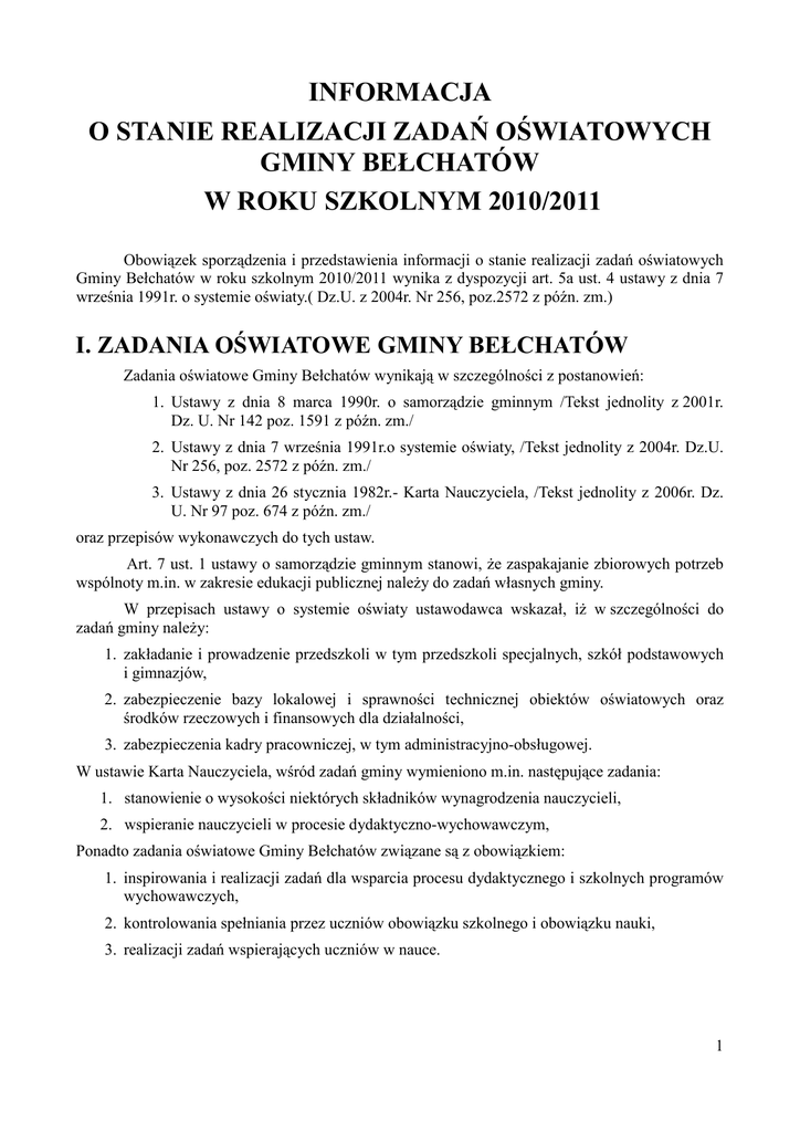 INFORMACJA O STANIE REALIZACJI ZADAŃ OŚWIATOWYCH GMINY BEŁCHATÓW W ROKU SZKOLNYM 2010/2011 Obowiązek sporządzenia i przedstawienia informacji o stanie realizacji zadań oświatowych Gminy Bełchatów w roku szkolnym 2010/2011 wynika z dyspozycji art. 5a ust. 4 ustawy z dnia 7 września 1991r. o systemie oświaty.( Dz.U. z 2004r. Nr 256, poz.2572 z późn. zm.) I. ZADANIA OŚWIATOWE GMINY BEŁCHATÓW Zadania oświatowe Gminy Bełchatów wynikają w szczególności z postanowień: 1. Ustawy z dnia 8 marca 1990r. o samorządzie gminnym /Tekst jednolity z 2001r. Dz. U. Nr 142 poz. 1591 z późn. zm./ 2. Ustawy z dnia 7 września 1991r.o systemie oświaty, /Tekst jednolity z 2004r. Dz.U. Nr 256, poz. 2572 z późn. zm./ 3. Ustawy z dnia 26 stycznia 1982r.- Karta Nauczyciela, /Tekst jednolity z 2006r. Dz. U. Nr 97 poz. 674 z późn. zm./ oraz przepisów wykonawczych do tych ustaw. Art. 7 ust. 1 ustawy o samorządzie gminnym stanowi, Ŝe zaspakajanie zbiorowych potrzeb wspólnoty m.in. w zakresie edukacji publicznej naleŜy do zadań własnych gminy. W przepisach ustawy o systemie oświaty ustawodawca wskazał, iŜ w szczególności do zadań gminy naleŜy: 1. zakładanie i prowadzenie przedszkoli w tym przedszkoli specjalnych, szkół podstawowych i gimnazjów, 2. zabezpieczenie bazy lokalowej i sprawności technicznej obiektów oświatowych oraz środków rzeczowych i finansowych dla działalności, 3. zabezpieczenia kadry pracowniczej, w tym administracyjno-obsługowej. W ustawie Karta Nauczyciela, wśród zadań gminy wymieniono m.in. następujące zadania: 1. stanowienie o wysokości niektórych składników wynagrodzenia nauczycieli, 2. wspieranie nauczycieli w procesie dydaktyczno-wychowawczym, Ponadto zadania oświatowe Gminy Bełchatów związane są z obowiązkiem: 1. inspirowania i realizacji zadań dla wsparcia procesu dydaktycznego i szkolnych programów wychowawczych, 2. kontrolowania spełniania przez uczniów obowiązku szkolnego i obowiązku nauki, 3. realizacji zadań wspierających uczniów w nauce. 1 II. STAN ORGANIZACJI I BAZA LOKALOWA W stosunku do roku szkolnego 2010/2011 sieć szkół podstawowych uległa zmianie. W roku szkolnym 2010/2011 Gmina Bełchatów była organem prowadzącym dla 6 szkół podstawowych oraz Gminnego Przedszkola w Domiechowicach (4 oddziały). W dniu 4 marca 2011 roku zostały utworzone cztery gimnazja na terenie gminy: Gimnazjum Publiczne w Domiechowicach, Gimnazjum Publiczne w Dobrzelowie, Gimnazjum Publiczne w Kurnosie Drugim oraz Gimnazjum Publiczne w Łękawie. W kolejnym roku szkolnym planuje się połączenie szkół podstawowych i gimnazjów w zespoły szkół. Do końca roku szkolnego 2010/2011 zadania Gminy Bełchatów związane z prowadzeniem gimnazjum realizowało Miasto Bełchatów na podstawie Porozumienia zawartego w dniu 28 czerwca 2005 roku pomiędzy Gminą Miasto Bełchatów a Gminą Bełchatów w sprawie przejęcia zadania publicznego polegającego na zapewnieniu kształcenia, wychowania i opieki uczniom zamieszkałym na terenie Gminy Bełchatów w publicznych gimnazjach, dla których organem prowadzącym jest Gmina Miasto Bełchatów. Kwota dotacji przekazywana z tego tytułu dla Miasta Bełchatów wyniosła w roku 2009 - 244,244,00 zł, w roku 2010 – 302,584,00zł, w roku 2011 – 240.410,00zł. Stan organizacji szkół podstawowych prowadzonych przez Gminę Bełchatów przedstawia tabela nr1. Tabela nr 1. Stan organizacji szkół podstawowych Gminy Bełchatów. Wyszczególnienie Liczba Liczba oddzia ucznió łów w w tym 0 I II III IV V VI 1 Szkoła Podstawowa w Domiechowicach 11 173 21 20 24 32 24 25 27 2 Szkoła Podstawowa w Dobrzelowie 6 100 19 5 22 7 20 12 15 3 Szkoła Podstawowa w Dobiecinie 7 74 14 8 11 11 6 13 11 4 Szkoła Podstawowa w Kurnosie Drugim 9 132 33 15 14 13 14 26 17 5 Szkoła Podstawowa w Janowie 7 86 15 14 10 13 8 11 15 6 Szkoła Podstawowa w Łękawie 6 102 17 10 13 21 19 8 14 46 667 119 72 94 97 91 95 99 Razem W Gminie Bełchatów funkcjonuje Gminne Przedszkole w Domiechowicach z oddziałami: w Kurnosie Drugim, Łękawie oraz od dnia 1 września 2010 roku w Dobrzelowie. Oddział przedszkola w Kurnosie Drugim z dniem 1 września 2010 roku został przeniesiony do nowej siedziby (budynek Gminnego Centrum Kultury), pozostałe oddziały są zlokalizowane w budynkach szkół podstawowych w zaadaptowanych na ten cel pomieszczeniach. Obecna sieć oddziałów przedszkola w pełni zabezpiecza aktualne potrzeby mieszkańców Gminy Bełchatów w tym zakresie. Nieliczna grupa wychowanków przedszkoli korzystała z niepublicznych przedszkoli na terenie miasta Bełchatów (3 dzieci w m-cu wrześniu 2010, 7 dzieci w m-cu czerwcu 2011). Gmina na podstawie obowiązujących przepisów prawnych była zobowiązana do refundacji kosztów udzielonych przez inne samorządy dotacji przedszkolom niepublicznym z tytułu uczęszczania do tych przedszkoli dzieci będących mieszkańcami Gminy Bełchatów. Stan organizacji oddziałów przedszkola obrazuje tabela nr 2. 2 Tabela nr 2. Stan organizacji oddziałów Gminnego Przedszkola w Domiechowicach. Wyszczególnienie Liczba grup Liczba uczniów /wychowanków/ 1 Oddział nr 1 w Domiechowicach 1 21 2 Oddział nr 2 w Łękawie 1 13 3 Oddział nr 3 w Kurnosie Drugim 1 25 4 Oddział nr 3 w Dobrzelowie 1 25 Razem 4 84 W tabeli poniŜej przedstawiono dane liczbowe dotyczące uczniów szkół podstawowych zamieszkałych na terenie Gminy Bełchatów. Do szkół prowadzonych przez Gminę Bełchatów uczęszczało około 72% uczniów zamieszkałych na terenie gminy, pozostałe 28% uczniów – mieszkańców Gminy Bełchatów uczęszczało do innych placówek, w zdecydowanej większości do szkół na terenie Miasta Bełchatowa. Uczniowie zamieszkali na terenie Miasta Bełchatowa stanowią 14 % ogólnej liczby uczniów szkół gminnych. Sytuacja ta jest wynikiem przede wszystkim wokółmiejskiego usytuowania Gminy Bełchatów, często takŜe uwarunkowaniami rodzinnymi m.in. związanymi z
