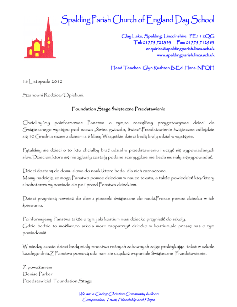 Spalding Parish Church of England Day School Clay Lake, Spalding. Lincolnshire. PE11 2QG Tel: 01775 722333 Fax: 01775 712983 [email protected] [email protected] www.spaldingparish.lincs.sch.uk Head Teacher: Teacher: Glyn Rushton B.Ed. Hons. NPQH 16 Listopada 2012 Szanowni Rodzice/Opiekuni, Foundation Stage Świ wiąteczne wi teczne Przedstawienie Chcielibyśmy poinformowac Panstwa o tym,ze zaczęliśmy przygotowywac dzieci do Swiątecznego występu pod nazwa „Świec gwiazdo, Świec”.Przedstawienie świąteczne odbędzie się 10 Grudnia razem z dziecmi z 6 klasy.Wszystkie dzieci bedą braly udzial w występie. Pytaliśmy sie dzieci o to ,kto chcialby brać udzial w przedstawieniu i uczyć się wypowiadanych slow.Dzieciom,ktore się nie zglosily zostaly podane sceny,gdzie nie beda musialy sięwypowiadać. Dzieci dostaną do domu slowa do nauki,ktore beda dla nich zaznaczone. Mamy nadzieję, ze mogą Panstwo pomoc dzieciom w nauce tekstu, a także powiedzieć kto/ktory z bohaterow wypowiada sie po i przed Panstwa dzieckiem. Dzieci przyniosą rownież do domu piosenki świąteczne do nauki.Prosze pomoc dziecku w ich śpiewaniu. Poinformujemy Panstwa także o tym, jaki kostium musi dziecko przynieść do szkoly. Gdzie bedzie to możliwe,to szkola moze zaopatrzyć dziecko w kostium,ale proszę nas o tym powiadomić W miedzy czasie dzieci bedą mialy mnostwo rożnych zabawnych zajęc praktykując tekst w szkole kazdego dnia.Z Panstwa pomocą uda nam sie uzyskać wspaniale Świąteczne Przedstawienie. Z poważaniem Denise Parker Przedstawiciel Foundation Stage We are a Caring Christian Community built on Compassion, Trust, Friendship and Hope