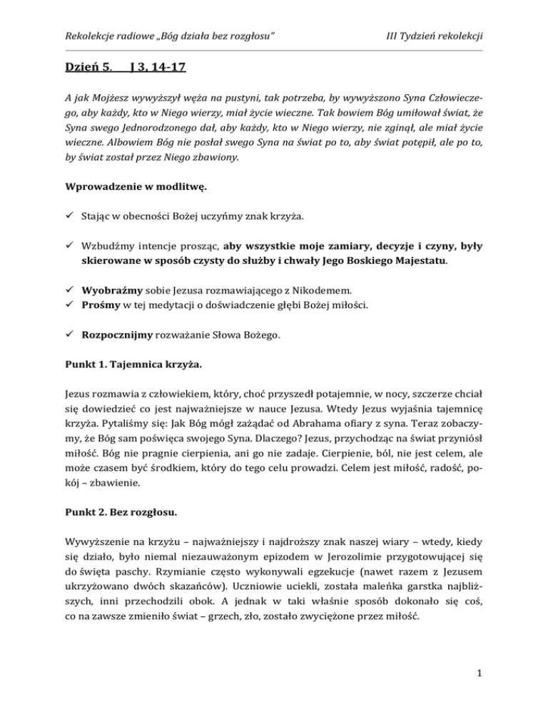 Rekolekcje radiowe „Bóg działa bez rozgłosu” Dzień 5. III Tydzień rekolekcji J 3, 14-17 A jak Mojżesz wywyższył węża na pustyni, tak potrzeba, by wywyższono Syna Człowieczego, aby każdy, kto w Niego wierzy, miał życie wieczne. Tak bowiem Bóg umiłował świat, że Syna swego Jednorodzonego dał, aby każdy, kto w Niego wierzy, nie zginął, ale miał życie wieczne. Albowiem Bóg nie posłał swego Syna na świat po to, aby świat potępił, ale po to, by świat został przez Niego zbawiony. Wprowadzenie w modlitwę. Stając w obecności Bożej uczyńmy znak krzyża. Wzbudźmy intencje prosząc, aby wszystkie moje zamiary, decyzje i czyny, były skierowane w sposób czysty do służby i chwały Jego Boskiego Majestatu. Wyobraźmy sobie Jezusa rozmawiającego z Nikodemem. Prośmy w tej medytacji o doświadczenie głębi Bożej miłości. Rozpocznijmy rozważanie Słowa Bożego. Punkt 1. Tajemnica krzyża. Jezus rozmawia z człowiekiem, który, choć przyszedł potajemnie, w nocy, szczerze chciał się dowiedzieć co jest najważniejsze w nauce Jezusa. Wtedy Jezus wyjaśnia tajemnicę krzyża. Pytaliśmy się: Jak Bóg mógł zażądać od Abrahama ofiary z syna. Teraz zobaczymy, że Bóg sam poświęca swojego Syna. Dlaczego? Jezus, przychodząc na świat przyniósł miłość. Bóg nie pragnie cierpienia, ani go nie zadaje. Cierpienie, ból, nie jest celem, ale może czasem być środkiem, który do tego celu prowadzi. Celem jest miłość, radość, pokój – zbawienie. Punkt 2. Bez rozgłosu. Wywyższenie na krzyżu – najważniejszy i najdroższy znak naszej wiary – wtedy, kiedy się działo, było niemal niezauważonym epizodem w Jerozolimie przygotowującej się do święta paschy. Rzymianie często wykonywali egzekucje (nawet razem z Jezusem ukrzyżowano dwóch skazańców). Uczniowie uciekli, została maleńka garstka najbliższych, inni przechodzili obok. A jednak w taki właśnie sposób dokonało się coś, co na zawsze zmieniło świat – grzech, zło, zostało zwyciężone przez miłość. 1 Rekolekcje radiowe „Bóg działa bez rozgłosu” III Tydzień rekolekcji Punkt 3. Sąd miłosierdzia. Jezus nie przyszedł na świat, żeby osądzać czy potępiać. Boża miłość obejmuje wszystkich. Nikogo nie odrzuca. Tylko sam człowiek może odrzucić tę miłość i tym samym postawić się poza Bożym miłosierdziem. Lecz nawet wtedy wystarczy zwrócić się z ufnością i wiarą do Boga - źródła miłości aby zostać uratowanym. Bóg posłał swojego Syna, aby tą miłość pokazał ludziom. Miłość bezgraniczną, ufną, która raczej pozwoli siebie skrzywdzić, niż sama skrzywdzi innych. Nawet wtedy nie potępia. Na krzyżu Jezus modli się, Ojcze, przebacz im, bo nie wiedzą co czynią. Krzyż Chrystusa, nie jest znakiem śmierci, lecz miłości i ratunku – jak przywołany obraz węża miedzianego ratującego Izraelitów na pustyni. Wystarczy spojrzeć z wiarą – zaufać. Jaka jest moja odpowiedź na tak wielką, bezwarunkową miłość? Zakończmy rozważanie osobista rozmową z Panem o przebiegu tej medytacji. Odmówmy “Ojcze Nasz“. 2