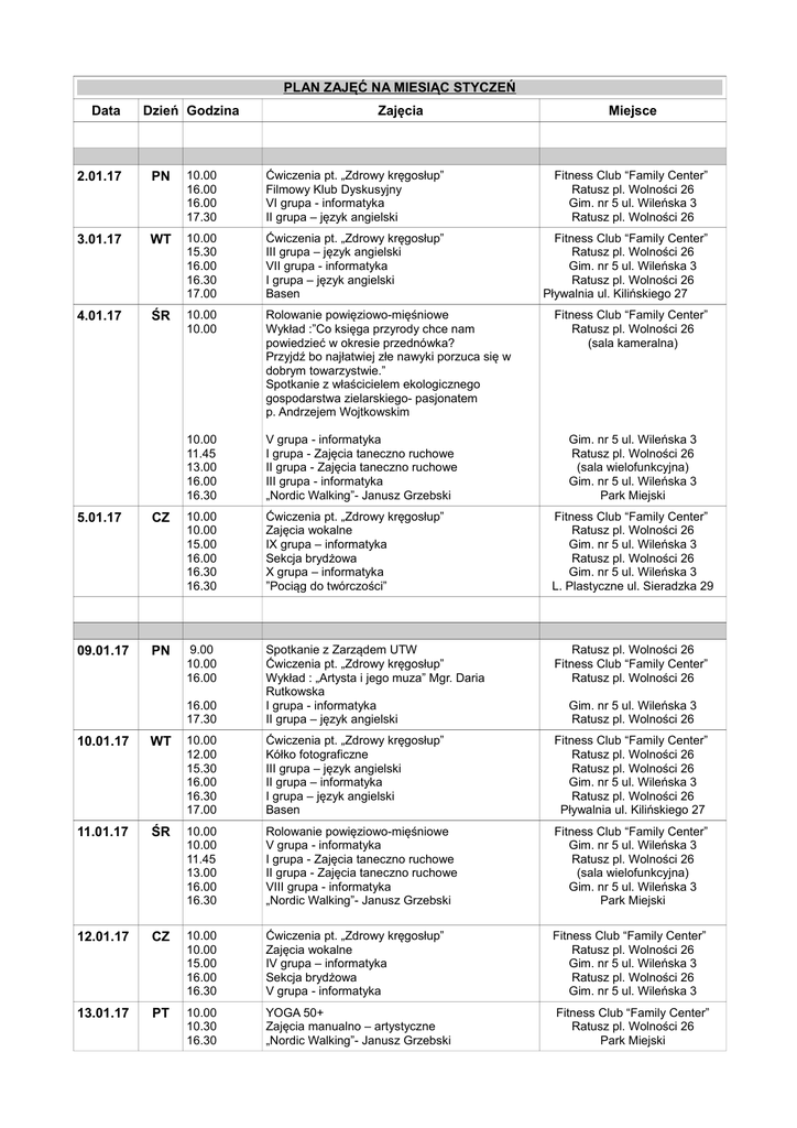 PLAN ZAJĘĆ NA MIESIĄC STYCZEŃ Data Dzień Godzina Zajęcia Miejsce 2.01.17 PN 10.00 16.00 16.00 17.30 Ćwiczenia pt. „Zdrowy kręgosłup” Filmowy Klub Dyskusyjny VI grupa - informatyka II grupa – język angielski Fitness Club “Family Center” Ratusz pl. Wolności 26 Gim. nr 5 ul. Wileńska 3 Ratusz pl. Wolności 26 3.01.17 WT 10.00 15.30 16.00 16.30 17.00 Ćwiczenia pt. „Zdrowy kręgosłup” III grupa – język angielski VII grupa - informatyka I grupa – język angielski Basen Fitness Club “Family Center” Ratusz pl. Wolności 26 Gim. nr 5 ul. Wileńska 3 Ratusz pl. Wolności 26 Pływalnia ul. Kilińskiego 27 4.01.17 ŚR 10.00 10.00 Rolowanie powięziowo-mięśniowe Wykład :”Co księga przyrody chce nam powiedzieć w okresie przednówka? Przyjdź bo najłatwiej złe nawyki porzuca się w dobrym towarzystwie.” Spotkanie z właścicielem ekologicznego gospodarstwa zielarskiego- pasjonatem p. Andrzejem Wojtkowskim 10.00 11.45 13.00 16.00 16.30 V grupa - informatyka I grupa - Zajęcia taneczno ruchowe II grupa - Zajęcia taneczno ruchowe III grupa - informatyka „Nordic Walking”- Janusz Grzebski Fitness Club “Family Center” Ratusz pl. Wolności 26 (sala kameralna) Gim. nr 5 ul. Wileńska 3 Ratusz pl. Wolności 26 (sala wielofunkcyjna) Gim. nr 5 ul. Wileńska 3 Park Miejski 5.01.17 CZ 10.00 10.00 15.00 16.00 16.30 16.30 Ćwiczenia pt. „Zdrowy kręgosłup” Zajęcia wokalne IX grupa – informatyka Sekcja brydżowa X grupa – informatyka ”Pociąg do twórczości” Fitness Club “Family Center” Ratusz pl. Wolności 26 Gim. nr 5 ul. Wileńska 3 Ratusz pl. Wolności 26 Gim. nr 5 ul. Wileńska 3 L. Plastyczne ul. Sieradzka 29 09.01.17 PN 9.00 10.00 16.00 Ratusz pl. Wolności 26 Fitness Club “Family Center” Ratusz pl. Wolności 26 16.00 17.30 Spotkanie z Zarządem UTW Ćwiczenia pt. „Zdrowy kręgosłup” Wykład : „Artysta i jego muza” Mgr. Daria Rutkowska I grupa - informatyka II grupa – język angielski Gim. nr 5 ul. Wileńska 3 Ratusz pl. Wolności 26 10.01.17 WT 10.00 12.00 15.30 16.00 16.30 17.00 Ćwiczenia pt. „Zdrowy kręgosłup” Kółko fotograficzne III grupa – język angielski II grupa – informatyka I grupa – język angielski Basen Fitness Club “Family Center” Ratusz pl. Wolności 26 Ratusz pl. Wolności 26 Gim. nr 5 ul. Wileńska 3 Ratusz pl. Wolności 26 Pływalnia ul. Kilińskiego 27 11.01.17 ŚR 10.00 10.00 11.45 13.00 16.00 16.30 Rolowanie powięziowo-mięśniowe V grupa - informatyka I grupa - Zajęcia taneczno ruchowe II grupa - Zajęcia taneczno ruchowe VIII grupa - informatyka „Nordic Walking”- Janusz Grzebski Fitness Club “Family Center” Gim. nr 5 ul. Wileńska 3 Ratusz pl. Wolności 26 (sala wielofunkcyjna) Gim. nr 5 ul. Wileńska 3 Park Miejski 12.01.17 CZ 10.00 10.00 15.00 16.00 16.30 Ćwiczenia pt. „Zdrowy kręgosłup” Zajęcia wokalne IV grupa – informatyka Sekcja brydżowa V grupa - informatyka Fitness Club “Family Center” Ratusz pl. Wolności 26 Gim. nr 5 ul. Wileńska 3 Ratusz pl. Wolności 26 Gim. nr 5 ul. Wileńska 3 13.01.17 PT 10.00 10.30 16.30 YOGA 50+ Zajęcia manualno – artystyczne „Nordic Walking”- Janusz Grzebski Fitness Club “Family Center” Ratusz pl. Wolności 26 Park Miejski 19.01.17 CZ 10.00 Zajęcia wokalne Ratusz pl. Wolności 26 25.01.17 ŚR 10.00 11.00 16.30 V grupa - informatyka III grupa – informatyka „Nordic Walking”- Janusz Grzebski Gim. nr 5 ul. Wileńska 3 Gim. nr 5 ul. Wileńska 3 Park Miejski 26.10.17 CZ 10.00 11.30 IX grupa - informatyka X grupa - informatyka Gim. nr 5 ul. Wileńska 3 Gim. nr 5 ul. Wileńska 3 30.01.17 PN 10.00 15.00 16.00 Ćwiczenia pt. „Zdrowy kręgosłup” Spotkanie z Zarządem UTW Wykład: Centrum Dietetyczne Naturhouse „Jesteś tym co jesz. Zasady zdrowego żywienia słuchaczy UTW.” (krótki przewodnik) 16.00 17.30 VI grupa - informatyka II grupa – język angielski 10.00 15.30 16.30 16.00 17.00 Ćwiczenia pt. „Zdrowy kręgosłup” III grupa – język angielski I grupa – język angielski VII grupa - informatyka Basen 31.01.17 WT Fitness Club “Family Center” Ratusz pl. Wolności 26 Ratusz pl. Wolności 26 Gim. nr 5 ul. Wileńska 3 Ratusz pl. Wolności 26 Fitness Club “Family Center” Ratusz pl. Wolności 26 Ratusz pl. Wolności 26 Gim. nr 5 ul. Wileńska 3 Pływalnia ul. Kilińskiego 27