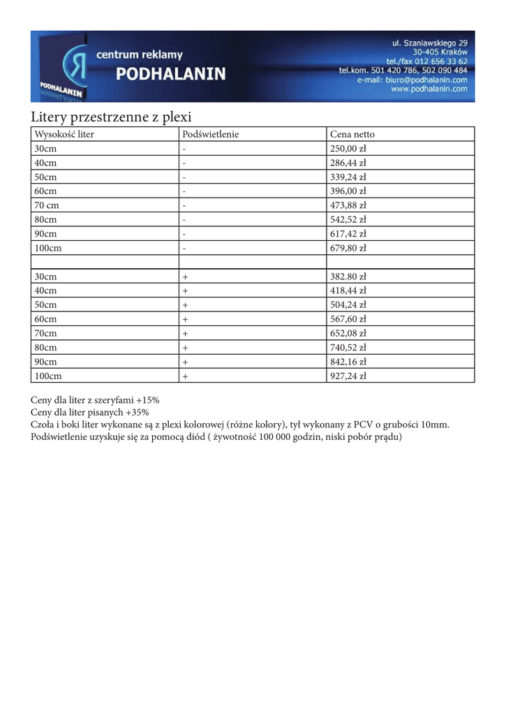 Litery przestrzenne z plexi Wysokość liter 30cm 40cm 50cm 60cm 70 cm 80cm 90cm 100cm Podświetlenie - Cena netto 250,00 zł 286,44 zł 339,24 zł 396,00 zł 473,88 zł 542,52 zł 617,42 zł 679,80 zł 30cm 40cm 50cm 60cm 70cm 80cm 90cm 100cm + + + + + + + + 382.80 zł 418,44 zł 504,24 zł 567,60 zł 652,08 zł 740,52 zł 842,16 zł 927,24 zł Ceny dla liter z szeryfami +15% Ceny dla liter pisanych +35% Czoła i boki liter wykonane są z plexi kolorowej (różne kolory), tył wykonany z PCV o grubości 10mm. Podświetlenie uzyskuje się za pomocą diód ( żywotność 100 000 godzin, niski pobór prądu) Litery z plexi Litery z Plexi 5 cm grubość plexi(mm) 3 3 5 10 20 Litery z Plexi 10 cm 3 3 5 10 20 rodzaj plexi kolorowa bezbarwna bezbarwna bezbarwna bezbarwna Cena netto 1,70 zł 1,50 zł 1,60 zł 3,80 zł 7,10 zł kolorowa bezbarwna bezbarwna bezbarwna bezbarwna 2,75 zł 2,35 zł 3,95 zł 9,20 zł 18,30 zł Litery z Plexi 15 cm 3 3 5 10 20 kolorowa bezbarwna bezbarwna bezbarwna bezbarwna 3,90 zł 3,60 zł 7,90 zł 15,90 zł 32,30 zł Litery z Plexi 20 cm 3 3 5 10 20 kolorowa bezbarwna bezbarwna bezbarwna bezbarwna 7,40 zł 7,20 zł 12,50 zł 23,50 zł 47,00 zł Litery z Plexi 25 cm 3 3 5 10 20 kolorowa bezbarwna bezbarwna bezbarwna bezbarwna 13,50 zł 13,00 zł 21,20 zł 42,50 zł 84,20 zł Litery z Plexi 30 cm 3 3 5 10 20 kolorowa bezbarwna bezbarwna bezbarwna bezbarwna 19,50 zł 19,30 zł 27,30 zł 48,20 zł 96,40 zł Litery z plexi Litery z Plexi 35 cm grubość plexi(mm) 3 3 5 10 20 Litery z Plexi 40 cm 3 3 5 10 20 rodzaj plexi kolorowa bezbarwna bezbarwna bezbarwna bezbarwna Cena netto 23,50 zł 22,50 zł 31,25 zł 55,40 zł 98,20 zł kolorowa bezbarwna bezbarwna bezbarwna bezbarwna 27,50 zł 26,50 zł 33,50 zł 59,60 zł 135,00 zł Litery z Plexi 45 cm 3 3 5 10 20 kolorowa bezbarwna bezbarwna bezbarwna bezbarwna 29,90 zł 28,80 zł 38,40 zł 68,50 zł 148,90 zł Litery z Plexi 50 cm 3 3 5 10 20 kolorowa bezbarwna bezbarwna bezbarwna bezbarwna 31,00 zł 29,90 zł 44,50 zł 81,10 zł 177,50 zł Litery z Plexi 55 cm 3 3 5 10 20 kolorowa bezbarwna bezbarwna bezbarwna bezbarwna 34,60 zł 33,80 zł 48,40 zł 99,40 zł 208,10 zł Litery z Plexi 60 cm 3 3 5 10 20 kolorowa bezbarwna bezbarwna bezbarwna bezbarwna 37,80 zł 36,90 zł 61,20 zł 118,90 zł 238,40 zł Litery z plexi Litery z Plexi 65 cm grubość plexi(mm) 3 3 5 10 20 Litery z Plexi 70 cm 3 3 5 10 20 rodzaj plexi kolorowa bezbarwna bezbarwna bezbarwna bezbarwna Cena netto 44,80 zł 43,30 zł 72,60 zł 132,50 zł 275,80 zł kolorowa bezbarwna bezbarwna bezbarwna bezbarwna 64,85 zł 63,40 zł 106,20 zł 198,23 zł 407,89 zł Litery z Plexi 75 cm 3 3 5 10 20 kolorowa bezbarwna bezbarwna bezbarwna bezbarwna 78,39 zł 76,90 zł 119,20 zł 221,11 zł 459,73 zł Litery z Plexi 85 cm 3 3 5 10 20 kolorowa bezbarwna bezbarwna bezbarwna bezbarwna 93,16 zł 89,94 zł 151,80 zł 275,38 zł 574,60 zł Litery z Plexi 90 cm 3 3 5 10 20 kolorowa bezbarwna bezbarwna bezbarwna bezbarwna 103,52 zł 99,74 zł 169,14 zł 307,03 zł 639,24 zł Litery z Plexi 95 cm 3 3 5 10 20 kolorowa bezbarwna bezbarwna bezbarwna bezbarwna 111,01 zł 109,93 zł 190,39 zł 340,69 zł 715,61 zł Litery z plexi Litery z Plexi 100 cm grubość plexi(mm) 3 3 5 10 20 Litery z Plexi 105 cm 3 3 5 10 20 rodzaj plexi kolorowa bezbarwna bezbarwna bezbarwna bezbarwna Cena netto 125,28 zł 124,38 zł 210,42 zł 369,36 zł 790,84 zł kolorowa bezbarwna bezbarwna bezbarwna bezbarwna 165,68 zł 160,35 zł 244,10 zł 440,91 zł 890,93 zł Litery z Plexi 110 cm 3 3 5 10 20 kolorowa bezbarwna bezbarwna bezbarwna bezbarwna 162,99 zł 152,58 zł 262,82 zł 480,76 zł 990,75 zł Litery z Plexi 115 cm 3 3 5 10 20 kolorowa bezbarwna bezbarwna bezbarwna bezbarwna 189,17 zł 179,20 zł 295,19 zł 515,91 zł 1095,43 zł Litery z Plexi 90 cm 3 3 5 10 20 kolorowa bezbarwna bezbarwna bezbarwna bezbarwna 103,52 zł 99,74 zł 169,14 zł 307,03 zł 639,24 zł Litery z Plexi 95 cm 3 3 5 10 20 kolorowa bezbarwna bezbarwna bezbarwna bezbarwna 111,01 zł 109,93 zł 190,39 zł 340,69 zł 715,61 zł Wycinanie liter ze styroduru Litery ze styroduru malowane Wysokość liter (cm) 15 15 15 20 20 20 25 25 25 30 30 30 35 35 35 40 40 40 45 45 45 50 50 50 55 55 55 60 60 60 65 65 65 70 70 70 Grubość styroduru (mm) 20-30 40-60 80-100 20-30 40-60 80-100 20-30 40-60 80-100 20-30 40-60 80-100 20-30 40-60 80-100 20-30 40-60 80-100 20-30 40-60 80-100 20-30 40-60 80-100 20-30 40-60 80-100 20-30 40-60 80-100 20-30 40-60 80-100 20-30 40-60 80-100 Cena netto 7,81 zł 8,74 zł 12,32 zł 10,67 zł 11,66 zł 17,05 zł 13,42 zł 15,07 zł 22,22 zł 16,39 zł 18,59 zł 27,61 zł 19,47 zł 22,22 zł 33,44 zł 22,55 zł 25,96 zł 39,49 zł 25,85 zł 29,92 zł 45,98 zł 29,15 zł 34,21 zł 52,80 zł 32,67 zł 38,72 zł 59,95 zł 36,19 zł 43,45 zł 68,86 zł 39,82 zł 48,29 zł 78,21 zł 44,00 zł 54,23 zł 88,44 zł Wycinanie liter ze styroduru Litery ze styroduru malowane Wysokość liter (cm) 80 80 80 90 90 90 100 100 100 110 110 110 Minimalka: 1 płyta 560x1200mm Kolor metaliczny dopłata + 35% Grubość styroduru (mm) 20-30 40-60 80-100 20-30 40-60 80-100 20-30 40-60 80-100 20-30 40-60 80-100 Cena netto 49,83 zł 63,36 zł 104,39 zł 58,63 zł 75,02 zł 129,69 zł 67,76 zł 87,45 zł 144,10 zł 75,46 zł 99,77 zł 165,99 Litery ze styroduru z licem z plexi Wysokość liter (cm) 15 15 15 20 20 20 25 25 25 30 30 30 35 35 35 40 40 40 45 45 45 50 50 50 55 55 55 60 60 60 65 65 65 70 70 70 Grubość styroduru (mm) 23-33 43-63 83-103 23-33 43-63 83-103 23-33 43-63 83-103 23-33 43-63 83-103 23-33 43-63 83-103 23-33 43-63 83-103 23-33 43-63 83-103 23-33 43-63 83-103 23-33 43-63 83-103 23-33 43-63 83-103 23-33 43-63 83-103 23-33 43-63 83-103 Cena netto 14,85 zł 15,73 zł 20,90 zł 21,01 zł 22,55 zł 29,92 zł 27,39 zł 29,59 zł 39,38 zł 34,98 zł 37,95 zł 50,38 zł 42,68 zł 46,42 zł 61,82 zł 51,26 zł 55,88 zł 74,58 zł 60,06 zł 65,67 zł 87,67 zł 69,74 zł 76,78 zł 102,19 zł 79,64 zł 88,11 zł 117,15 zł 91,63 z