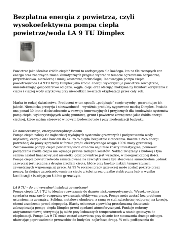 Bezpłatna energia z powietrza, czyli wysokoefektywna pompa ciepła powietrze/woda LA 9 TU Dimplex Powietrze jako idealne źródło ciepła? Brzmi to zachęcająco dla każdego, kto na tle rosnących cen energii oraz znacznych zmian klimatycznych pragnie wybrać w temacie ogrzewania bezpieczną przyszłościowo, niezależną i mniej kosztowną technologię. Innowacyjna pompa ciepła powietrze/woda LA 9TU firmy Dimplex jako źródło energii wykorzystuje powietrze zewnętrzne, uniezależniając gospodarstwo od gazu, węgla, oleju oraz oferując maksymalny komfort korzystania z ciepła i ciepłej wody użytkowej przy niewielkich kosztach eksploatacji przez cały rok. Marka to rodzaj świadectwa. Producent w ten sposób „podpisuje” swoje wyroby, gwarantując ich jakość. Niemiecka precyzja i niezawodność – wyróżnia produkty sygnowane marką Dimplex. Posiada ona ponad 30-letnie doświadczenie w rozwoju innowacyjnych i przyjaznych dla środowiska systemów pomp ciepła, wykorzystujących wodę gruntową, grunt i powietrze zewnętrzne jako źródło energii cieplnej, które można stosować w nowym budownictwie i przy modernizacji budynku. Do nowoczesnego, energooszczędnego domu Pompa ciepła należy do najbardziej wydajnych systemów grzewczych i podgrzewania wody użytkowej, czerpie ona bowiem do ok. 75 % ciepła bezpłatnie z otoczenia. Razem z 25% energii potrzebnej do pracy sprężarki w formie prądu elektrycznego osiąga 100% mocy grzewczej. Zastosowanie pompy ciepła powietrze/woda oznacza najniższe koszty inwestycyjne, ponieważ podłączenia źródła ciepła nie wymaga prawie żadnych kosztów. Nakład związany z budową i tym samym nakład finansowy jest niewielki, gdyż powietrze jest wszędzie, w nieograniczonej ilości. Pompa ciepła powietrze/woda zainstalowana na zewnątrz może być stosowana samodzielnie, jednak zazwyczaj jest łączona z drugim źródłem ciepła, które przy bardzo niskich temperaturach zewnętrznych wspomaga jej pracę. Aż 95 % rocznej pracy grzewczej może zostać pokryte przez pompę, brakujące zapotrzebowanie na ciepło z kolei przez grzałkę elektryczną lub w wyniku kombinacji z istniejącym kotłem grzewczym. LA 9 TU – do uniwersalnej instalacji zewnętrznej Pompa ciepła LA 9 TU to idealne rozwiązanie do domów niskoenergetycznych. Wysokowydajna sprężarka oraz zawór rozprężny gwarantują efektywną pracę. Pompa może zostać bez problemu ustawiona na zewnątrz. Solidna, metalowa obudowa, z ramą ze stali szlachetnej odpornej na korozję, chroni urządzenie przed niepogodą. Blachy osłonowe z powłoką proszkowaną skutecznie zabezpieczają pompę ciepła Dimplex przed opadami atmosferycznymi. Funkcje ochrony antyzamrożeniowej utrzymują ją także przy lodowatych temperaturach w stanie gotowym do eksploatacji. Pompa LA 9 TU może zostać ustawiona przy ścianie bez stosowania dużego odstępu, ułatwiając poprowadzenie przewodów do budynku najkrótszą drogą. W celu podłączenia do domowego układu ogrzewania wystarczy ułożyć w ziemi dwie izolowane rury do zasilania i powrotu oraz elektryczne przewody połączeniowe. Co więcej, bionicznie uformowane łopatki wentylatora pomp ciepła wzorowane na kształt swoich skrzydeł zapewniają niemal bezgłośną pracę. Dzięki zastosowaniu parownika o wysokiej wydajności zostaje zmniejszona prędkość powietrza. Sam wentylator obraca się o 30 % wolniej, dzięki czemu dodatkowo zostaje zredukowana emisja dźwięku. Zintegrowane odprzężenie dźwięków materiałowych zapobiega zaś przenoszeniu drgań na budynek. COP – dla wymagających Efektywność działania pompy ciepła określa współczynnik wydajności, zwany też wskaźnikiem efektywności energetycznej, zdefiniowany jako proporcja użytecznych efektów energetycznych do energii napędowej urządzenia. Mówiąc prościej to stosunek efektu do nakładu. W pompie ciepła za efekt uważa się ilość ciepła przekazywanego w górnym źródle. Wysokowydajne pompy ciepła osiągają roczne wskaźniki pracy porównywalne z pompami ciepła typu solanka/woda. Maksymalne temperatury zasilania wynoszące 58 °C i związana z tym wysoka wydajność grzewcza może zostać osiągnięta przy temperaturach zewnętrznych do - 25 °C. Również w przypadku modernizacji przy użyciu grzejników, zostaje zagwarantowany wysoki roczny wskaźnik pracy w trybie ogrzewania i przygotowania cieplej wody. Pompa ciepła uzyskuje największą skuteczność energetyczną w połączeniu z ogrzewaniem niskotemperaturowym (ogrzewanie podłogowe). W zależności od regionu klimatycznego współczynnik efektywności potrafi wynieść nawet 4, co do tej pory było możliwe tylko przy zastosowaniu pompy typu solanka/woda. Co więcej, pompa wyposażona jest w regulator typu EconPlus, z jego pomocą wytworzona energia cieplna może zostać ujęta oddzielnie zarówno dla trybu ogrzewania jak i przygotowania cieplej wody. Znaczną część naszego zużycia oleju i gazu przeznacza się dzisiaj na klasyczne ogrzewanie pomieszczeń. Jednakże ropa naftowa służy jako surowiec dla wielu produktów codziennego użytku i powinno się ograniczać jej spalanie. W szczególności ogrzewanie budynków może zostać zastąpione systemami grzewczymi z pompami ciepła. W ten sposób zostanie zmniejszona zależność od kopalnych nośników energii i tym samym nastąpi znaczna redukcja emisji CO2. Pompy ciepła typu powietrze / woda mogą mieć w tych kwestiach znaczący udział. ● ● ● ● ● ● ● ● ● ● ● ● ● ● ● ● Nazwa: LA 9TU Rodzaj: powietrze / woda Temperatura dolnego źródła: 35 °C do -20°C Maks.temperatura wody c.o.: 60°C Czynnik roboczy: R404 Sterowanie: naścienny menadżer pompy ciepła WPM EconPlus Gwarancja: 2 lata Zastosowanie: do c.o. i c.w.u. Powierzchnia ogrzewania: 150 -180 m² Wymiary jednostki zewn. (wys.szer.gł.): 1460x910x750 mm Nominalna moc cieplna: 7, 5 kW Komentarz do mocy nominalnej: (2/35°C) Moc chł