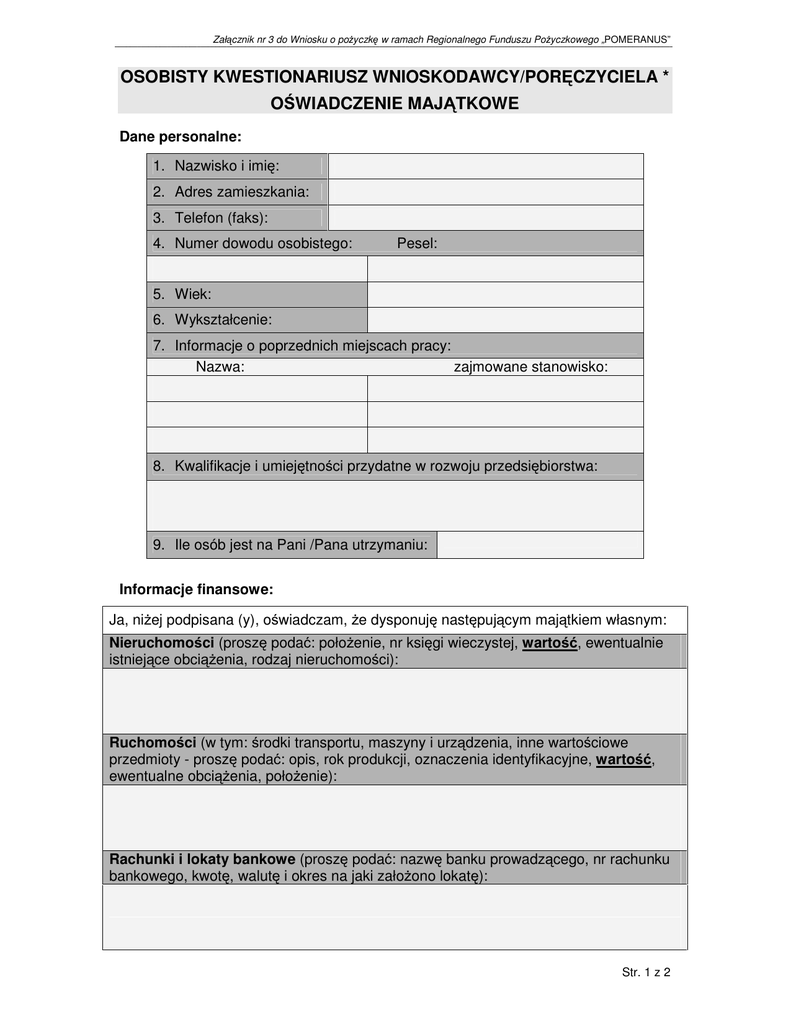 Załącznik nr 3 do Wniosku o pożyczkę w ramach Regionalnego Funduszu Pożyczkowego „POMERANUS” OSOBISTY KWESTIONARIUSZ WNIOSKODAWCY/PORĘCZYCIELA * OŚWIADCZENIE MAJĄTKOWE Dane personalne: 1. Nazwisko i imię: 2. Adres zamieszkania: 3. Telefon (faks): 4. Numer dowodu osobistego: Pesel: 5. Wiek: 6. Wykształcenie: 7. Informacje o poprzednich miejscach pracy: Nazwa: zajmowane stanowisko: 8. Kwalifikacje i umiejętności przydatne w rozwoju przedsiębiorstwa: 9. Ile osób jest na Pani /Pana utrzymaniu: Informacje finansowe: Ja, niżej podpisana (y), oświadczam, że dysponuję następującym majątkiem własnym: Nieruchomości (proszę podać: położenie, nr księgi wieczystej, wartość, ewentualnie istniejące obciążenia, rodzaj nieruchomości): Ruchomości (w tym: środki transportu, maszyny i urządzenia, inne wartościowe przedmioty - proszę podać: opis, rok produkcji, oznaczenia identyfikacyjne, wartość, ewentualne obciążenia, położenie): Rachunki i lokaty bankowe (proszę podać: nazwę banku prowadzącego, nr rachunku bankowego, kwotę, walutę i okres na jaki założono lokatę): Str. 1 z 2 Załącznik nr 3 do Wniosku o pożyczkę w ramach Regionalnego Funduszu Pożyczkowego „POMERANUS” Prawa majątkowe (udziały w podmiotach gospodarczych, papiery wartościowe np. akcje, obligacje - proszę podać: nazwę podmiotu, wartość udziałów, nazwę podmiotu prowadzącego rachunek papierów wartościowych, nr rachunku, rodzaj, ilość): Powyższy majątek jest / nie jest *) objęty wspólnością majątkową małżeńską z (imię i nazwisko małżonka, Pesel) Czy Pani / Pan korzysta z kredytów, pożyczek, leasingu, poręczeń, czy występują inne formy zobowiązań, takie jak np.: gwarancje, weksle. Prosimy wymienić wszystkie z uwzględnieniem okresu obowiązywania, występujących zabezpieczeń oraz aktualnego ich wykorzystania Pozostałe informacje ogólne: (Prosimy podać szczegóły w przypadku twierdzącej odpowiedzi na poniższe pytania) Czy kiedykolwiek przejmowano któryś ze składników Twojego majątku? tak nie Czy występujesz jako strona jakiegokolwiek roszczenia lub procesu sądowego? tak nie Czy kiedykolwiek ogłaszałeś upadłość? tak nie Czy posiadasz zaległości podatkowe? tak nie Szczegóły: Prawdziwość powyższych danych potwierdzam własnoręcznym podpisem: (miejscowość, data) (podpis Wnioskodawcy) __________________________________ *) niepotrzebne skreślić Str. 2 z 2