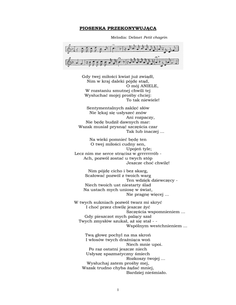PIOSENKA PRZEKONYWUJĄCA Melodia: Delmet Petit chagrin Gdy twej miłości kwiat już zwiądł, Nim w kraj daleki pójdę stąd, O mój ANIELE, W rozstaniu smutnej chwili tej Wysłuchać mojej prośby chciej: To tak niewiele! Sentymentalnych zaklęć słów Nie lękaj się usłyszeć znów Ani rozpaczy, Nie będę budził dawnych mar: Wszak musiał prysnąć szczęścia czar Tak lub inaczej ... Na wieki pomnieć będę ten O twej miłości cudny sen, Upojeń tyle; Lecz nim me serce strącisz w grrrrrrrób Ach, pozwól zostać u twych stóp Jeszcze choć chwilę! Nim pójdę cicho i bez skarg, Scałować pozwól z twoich warg Ten wdzięk dziewczęcy Niech twoich ust niestarty ślad Na ustach mych uniosę w świat, Nie pragnę więcej ... W twych sukniach pozwól twarz mi skryć I choć przez chwilę jeszcze żyć Szczęścia wspomnieniem ... Gdy pieszczot mych palący szał Twych zmysłów szukał, aż się stał - Wspólnym westchnieniem ... Twą głowę pochyl na ma skroń I włosów twych drażniąca woń Niech mnie upoi. Po raz ostatni jeszcze niech Usłyszę spazmatyczny śmiech Rozkoszy twojej ... Wysłuchaj zatem prośby mej, Wszak trudno chyba żądać mniej, Bardziej nieśmiało. 1 Niech dawnych wzruszeń słodka moc Odżyje choć na jedna noc, Wszak to tak mało ... Pisane w r. 1907 2