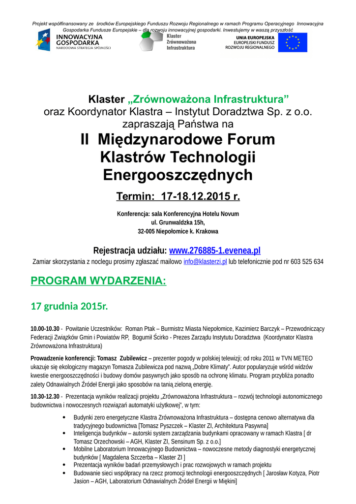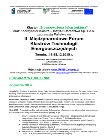Projekt współfinansowany ze środków Europejskiego Funduszu Rozwoju Regionalnego w ramach Programu Operacyjnego Innowacyjna Gospodarka Fundusze Europejskie – dla rozwoju innowacyjnej gospodarki. Inwestujemy w waszą przyszłość Klaster „Zrównoważona Infrastruktura” oraz Koordynator Klastra – Instytut Doradztwa Sp. z o.o. zapraszają Państwa na II Międzynarodowe Forum Klastrów Technologii Energooszczędnych Termin: 17-18.12.2015 r. Konferencja: sala Konferencyjna Hotelu Novum ul. Grunwaldzka 15h, 32-005 Niepołomice k. Krakowa Rejestracja udziału: www.276885-1.evenea.pl Zamiar skorzystania z noclegu prosimy zgłaszać mailowo [email protected] lub telefonicznie pod nr 603 525 634 PROGRAM WYDARZENIA: 17 grudnia 2015r. 10.00-10.30 - Powitanie Uczestników: Roman Ptak – Burmistrz Miasta Niepołomice, Kazimierz Barczyk – Przewodniczący Federacji Związków Gmin i Powiatów RP, Bogumił Ścirko - Prezes Zarządu Instytutu Doradztwa (Koordynator Klastra Zrównoważona Infrastruktura) Prowadzenie konferencji: Tomasz Zubilewicz – prezenter pogody w polskiej telewizji; od roku 2011 w TVN METEO ukazuje się ekologiczny magazyn Tomasza Zubilewicza pod nazwą „Dobre Klimaty”. Autor popularyzuje wśród widzów kwestie energooszczędności i budowy domów pasywnych jako sposób na ochronę klimatu. Program przybliża ponadto zalety Odnawialnych Źródeł Energii jako sposobów na tanią zieloną energię. 10.30-12.30 - Prezentacja wyników realizacji projektu „Zrównoważona Infrastruktura – rozwój technologii autonomicznego budownictwa i nowoczesnych rozwiązań automatyki użytkowej”, w tym: Budynki zero energetyczne Klastra Zrównoważona Infrastruktura – dostępna cenowo alternatywa dla tradycyjnego budownictwa [Tomasz Pyszczek – Klaster ZI, Architektura Pasywna] Inteligencja budynków – autorski system zarządzania budynkami opracowany w ramach Klastra [ dr Tomasz Orzechowski – AGH, Klaster ZI, Sensinum Sp. z o.o.] Mobilne Laboratorium Innowacyjnego Budownictwa – nowoczesne metody diagnostyki energetycznej budynków [ Magdalena Szczerba – Klaster ZI ] Prezentacja wyników badań przemysłowych i prac rozwojowych w ramach projektu Budowanie sieci współpracy na rzecz promocji technologii energooszczędnych [ Jarosław Kotyza, Piotr Jasion – AGH, Laboratorium Odnawialnych Źródeł Energii w Miękini] Projekt współfinansowany ze środków Europejskiego Funduszu Rozwoju Regionalnego w ramach Programu Operacyjnego Innowacyjna Gospodarka Fundusze Europejskie – dla rozwoju innowacyjnej gospodarki. Inwestujemy w waszą przyszłość Działania Klastra Zrównoważona Infrastruktura na rzecz poprawy efektywności energetycznej – materiał filmowy 12.30 – 12.45 – Przerwa Kawowa 12.45 – 13.45 Panel dyskusyjny I – Temat: wyzwania i szanse dla klastrów budowlanych i ekoenergetycznych w kontekście rozwoju rynku budownictwa energooszczędnego i pasywnego (Prawodawstwo i zmiany legislacyjne w procesie rozwoju rynku technologii energooszczędnych i OZE w Polsce i w krajach Europy Zachodniej, dyrektywa budynkowa, ustawa o OZE/ ISE, środki zewnętrzne na poprawę efektywności energetycznej) – MODERACJA: Krzysztof Szczotka 13.45 – 14.45 Podlaski Klaster Budownictwa Pasywnego LifeScience Podkarpacki Klaster Energii Odnawialnej Sądecki Klaster Energii Odnawialnej Klaster Inteligentne Budownictwo Eurocolor Sp. z o.o. – polski producent stolarki energooszczędnej TermoOrganika Sp. z o.o. – polski producent materiałów dociepleniowych Grupa Silikaty Sp. z o.o. – polski producent energooszczędnych materiałów konstrukcyjnych Bjerg Architektur (Dania) Panel dyskusyjny II – Temat: Wsparcie regionalne i centralne środowisk klastrowych oraz internacjonalizacja klastrów w nowej perspektywie na lata 2014-2020. Dobre praktyki klastrowe – doświadczenie lat 2007-2013, wnioski i rekomendacje – MODERACJA: Edyta Pęcherz Urząd Marszałkowski Województwa Małopolskiego Urząd Marszałkowski Województwa Podkarpackiego Małopolskie Centrum Przedsiębiorczości Związek Pracodawców Klastry Polskie Dr Sławomir Olko – Politechniki Śląska, Wydział Organizacji i Zarządzania Klaster Polskie Aluminium (Krajowy Klaster Kluczowy) Emilio Rull Quesada – Euro-Inversia - klastry i internacjonalizacja MŚP (Hiszpania) Simone Hagenauer – Green Building Cluster (Austria) 14.45- 15.00 - Podsumowanie i zamknięcie pierwszego dnia konferencji 15.00 – 17.00 – Obiad i spotkania B2B 18 grudnia 2015r. – uroczyste otwarcie oraz prezentacja energooszczędnych obiektów Klastra Zrównoważona Infrastruktura 9.15 Zbiórka przy autokarze przed hotelem Novum 10.00 Przyjazd do miejscowości Kokotów, gm. Wieliczka 10.00 – 11.30 Uroczyste otwarcie prototypowych budynków zero energetycznych Klastra Zrównoważona Infrastruktura, z udziałem Andrzeja Adamczyka - Ministra Infrastruktury i Budownictwa, oraz przedstawicieli: Urzędu Marszałkowskiego Województwa Małopolskiego Urzędu Miasta Krakowa Urzędu Miasta i Gminy w Wieliczce Federacji Związków Gmin i Powiatów RP 11.30 – 12.30 Dojazd do Słomnik Projekt współfinansowany ze środków Europejskiego Funduszu Rozwoju Regionalnego w ramach Programu Operacyjnego Innowacyjna Gospodarka Fundusze Europejskie – dla rozwoju innowacyjnej gospodarki. Inwestujemy w waszą przyszłość 12:30 – 14.30 Prezentacja pasywnych budynków użyteczności publicznej Gminy Słomniki 14.30 – 15.00 Lunch 16:00 – powrót do Krakowa/Niepołomic Udział w wydarzeniu jest bezpłatny, współfinansowany ze środków Unii Europejskiej w ramach Europejskiego Funduszu Rozwoju Regionalnego