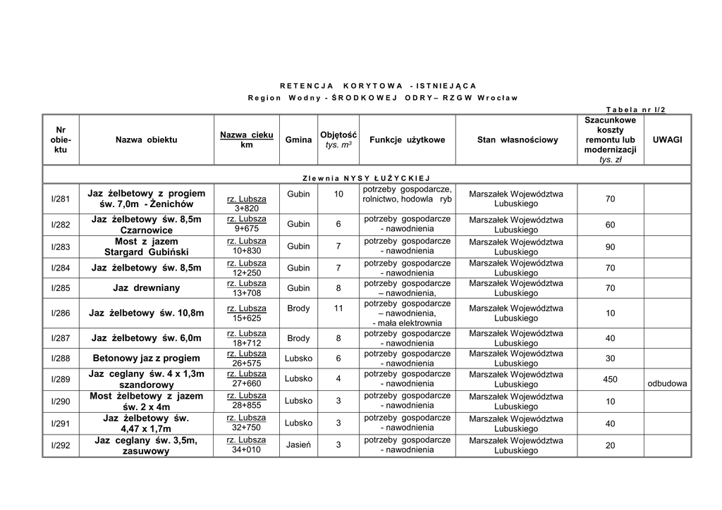 RETENCJA Regio n KORYTO WA Wodny - ŚR O D K O W E J - IST NIE J Ą C A O D R Y – R Z G W Wr o cła w T a b e l a n r I/ 2 Nr obiektu Nazwa obiektu Nazwa cieku km Gmina Objętość tys. m3 Stan własnościowy Szacunkowe koszty remontu lub modernizacji tys. zł potrzeby gospodarcze, rolnictwo, hodowla ryb Marszałek Województwa Lubuskiego 70 potrzeby gospodarcze - nawodnienia potrzeby gospodarcze - nawodnienia potrzeby gospodarcze - nawodnienia potrzeby gospodarcze – nawodnienia, potrzeby gospodarcze – nawodnienia, - mała elektrownia potrzeby gospodarcze - nawodnienia potrzeby gospodarcze - nawodnienia potrzeby gospodarcze - nawodnienia potrzeby gospodarcze - nawodnienia potrzeby gospodarcze - nawodnienia potrzeby gospodarcze - nawodnienia Marszałek Województwa Lubuskiego Marszałek Województwa Lubuskiego Marszałek Województwa Lubuskiego Marszałek Województwa Lubuskiego Funkcje użytkowe UWAGI Zle w nia N Y S Y Ł U Ż Y C KIE J I/281 I/282 I/283 Jaz żelbetowy z progiem św. 7,0m - Żenichów Jaz żelbetowy św. 8,5m Czarnowice Most z jazem Stargard Gubiński rz. Lubsza 3+820 rz. Lubsza 9+675 rz. Lubsza 10+830 rz. Lubsza 12+250 rz. Lubsza 13+708 I/284 Jaz żelbetowy św. 8,5m I/285 Jaz drewniany I/286 Jaz żelbetowy św. 10,8m rz. Lubsza 15+625 I/287 Jaz żelbetowy św. 6,0m I/288 Betonowy jaz z progiem rz. Lubsza 18+712 rz. Lubsza 26+575 rz. Lubsza 27+660 rz. Lubsza 28+855 rz. Lubsza 32+750 rz. Lubsza 34+010 I/289 I/290 I/291 I/292 Jaz ceglany św. 4 x 1,3m szandorowy Most żelbetowy z jazem św. 2 x 4m Jaz żelbetowy św. 4,47 x 1,7m Jaz ceglany św. 3,5m, zasuwowy Gubin 10 Gubin 6 Gubin 7 Gubin 7 Gubin 8 Brody 11 Brody 8 Lubsko 6 Lubsko 4 Lubsko 3 Lubsko 3 Jasień 3 Marszałek Województwa Lubuskiego Marszałek Województwa Lubuskiego Marszałek Województwa Lubuskiego Marszałek Województwa Lubuskiego Marszałek Województwa Lubuskiego Marszałek Województwa Lubuskiego Marszałek Województwa Lubuskiego 60 90 70 70 10 40 30 450 10 40 20 odbudowa RETENCJA Regio n KORYTO WA Wodny - ŚR O D K O W E J - IST NIE J Ą C A O D R Y – R Z G W Wr o cła w T a b e l a n r I/ 2 Nr obiektu Nazwa obiektu Nazwa cieku km Gmina Objętość tys. m3 Funkcje użytkowe Stan własnościowy Szacunkowe koszty remontu lub modernizacji tys. zł Zle w nia N Y S Y Ł U Ż Y C KIE J I/293 Jaz betonowy o św. 2,0m I/294 Jaz betonowy o św. 2X1,5m I/295 Jaz żelbetowy o św. 2,6m I/296 Jaz betonowy o św. 2,6m I/297 Jaz betonowy o św. 2,5m I/298 Jaz betonowy o św. 1,5m I/299 Jaz żelbetowy o św. 4,8m I/300 Jaz żelbetowy o św. 2,8m I/301 Most betonowy z jazem św. 3m I/302 Jaz żelbetowy św. 2,5m I/303 Jaz betonowy św. 2,9m I/304 Jaz betonowy św. 3,15m I/305 Jaz betonowy św. 3,2m I/306 Jaz betonowy św. 5,0m Wełnica 0+236 Wełnica 5+060 Wełnica 7+632 Wełnica 8+919 Wełnica 12+105 Golec 0+064 Golec 1+246 Golec 3+198 Golec 11+600 Golec 16+578 Kurka 2+654 Kurka 5+470 Kurka 9+481 K. Młyński 1+820 Gubin 1,5 Gubin 1,5 Gubin 1,5 Gubin 1,5 Gubin 1,5 Gubin 2 Gubin 1,5 Gubin 1,5 Brody 3,5 Lubsko 2,0 Lubsko 2 Lubsko 2 Lubsko 2 Lubsko 0,6 potrzeby gospodarcze - nawodnienia potrzeby gospodarcze - nawodnienia potrzeby gospodarcze - nawodnienia potrzeby gospodarcze - nawodnienia potrzeby gospodarcze - nawodnienia potrzeby gospodarcze - nawodnienia potrzeby gospodarcze - nawodnienia potrzeby gospodarcze - nawodnienia potrzeby gospodarcze - nawodnienia potrzeby gospodarcze - nawodnienia potrzeby gospodarcze - nawodnienia potrzeby gospodarcze - nawodnienia potrzeby gospodarcze - nawodnienia potrzeby gospodarcze - nawodnienia Marszałek Województwa Lubuskiego Marszałek Województwa Lubuskiego Marszałek Województwa Lubuskiego Marszałek Województwa Lubuskiego Marszałek Województwa Lubuskiego Marszałek Województwa Lubuskiego Marszałek Województwa Lubuskiego Marszałek Województwa Lubuskiego Marszałek Województwa Lubuskiego Marszałek Województwa Lubuskiego Marszałek Województwa Lubuskiego Marszałek Województwa Lubuskiego Marszałek Województwa Lubuskiego Marszałek Województwa Lubuskiego 15 20 15 15 15 12 16 12 15 25 20 25 25 30 UWAGI RETENCJA Regio n KORYT O WA Wodny - ŚR O D K O W E J - IST NIE J Ą C A O D R Y – R Z G W Wr o cła w T a b e l a n r I/ 2 Nr obiektu Nazwa obiektu Nazwa cieku km Gmina Objętość tys. m3 Funkcje użytkowe Stan własnościowy Szacunkowe koszty remontu lub modernizacji tys. zł Zle w nia N Y S Y Ł U Ż Y C KIE J I/307 Jaz betonowy, św. 4,0m I/308 Jaz betonowy, św. 3,0m I/309 I/310 I/311 I/312 I/313 I/314 I/315 I/316 Jaz betonowy, św. 2,4m, piętrzenie H=2,0m Jaz betonowy, piętrzenie H=1,5m Jaz betonowy z mostem, piętrzenie H=1,50m Jaz betonowy z mostem, piętrzenie H=1,5m Jaz betonowy, św. 4,2m, piętrzenie H=1,5m Jaz betonowy z mostem, św. 5,0m, piętrzenie H=1,5m Jaz żelbetowy, św. 4,6m, piętrzenie H=1,5m Jaz betonowy, św. 3,0m rz. Ług 0+110 rz. Ług 6+444 rz. Kolna 0+578 rz. Kolna 3+315 rz. Kolna 3+726 rz. Kolna 6+100 rz. Kolna 8+230 rz. Kolna 8+582 rz. Kolna 11+650 rz. Skroda 18+035 Lubsko 3 Jasień 4 Gubin 11 Gubin 2 Gubin 9 Gubin 8 Gubin 2 Gubin 8 Gubin 4 Trzebiel 1 potrzeby gospodarcze - nawodnienia potrzeby gospodarcze - nawodnienia potrzeby gospodarcze - nawodnienia potrzeby gospodarcze - nawodnienia potrzeby gospodarcze - nawodnienia potrzeby gospodarcze - nawodnienia potrzeby gospodarcze - nawodnienia potrzeby gospodarcze - nawodnienia potrzeby gospodarcze - nawodnienia potrzeby gospodarcze - nawodnienia Marszałek Województwa Lubuskiego Marszałek Województwa Lubuskiego Marszałek Województwa Lubuskiego Marszałek Województwa Lubuskiego Marszałek Województwa Lubuskiego Marszałek Województwa Lubuskiego Marszałek Województwa Lubuskiego Marszałek Województwa Lubuskiego Marszałek Województwa Lubuskiego Marszałek Województwa Lubuskiego 25 25 20 15 40 40 20 25 25 25 UWAGI RETENCJA Regio n KORYTO WA Wodny - ŚR O D K O W E J - IST NIE J Ą C A O D R Y – R Z G W Wr o cła w T a b e l a n r I/ 2 Nr obiektu Nazwa obi