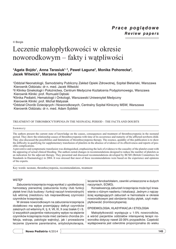 Prace poglądowe Review papers © Borgis Leczenie małopłytkowości w okresie noworodkowym – fakty i wątpliwości *Agata Bojdo1, Anna Tarasiuk1, 2, Paweł Łaguna3, Monika Pohorecka4, Jacek Witwicki1, Marzena Dębska2 Oddział Neonatologii, Samodzielny Publiczny Zakład Opieki Zdrowotnej, Szpital Bielański, Warszawa Kierownik Oddziału: dr n. med. Jacek Witwicki 2 II Klinika Ginekologii i Położnictwa, Centrum Medyczne Kształcenia Podyplomowego, Warszawa Kierownik Kliniki: prof. Romuald Dębski 3 Klinika Pediatrii, Hematologii i Onkologii, Warszawski Uniwersytet Medyczny Kierownik Kliniki: prof. Michał Matysiak 4 Oddział Chorób Dziecięcych i Noworodkowych, Centralny Szpital Kliniczny MSW, Warszawa Kierownik Oddziału: dr n. med. Adam Sybilski 1 Treatment of thrombocytopenia in the neonatal period – the facts and doubts Summary The authors present the current state of knowledge on the causes, consequences and treatment of thrombocytopenia in the neonatal period. They show the relationship causes of thrombocytopenia with time of its occurrence and maturity of the afflicted newborn child. They also discussed the possibilities and limitations of thrombocytopenia therapy. The essence, quiddity of this publication is to show the difficulty in qualifying for supplementary transfusion of platelets in the absence of evidence of its effectiveness and reports of possible complications. A preventive and symptomatic transfusion was distinguished, emphasizing the lack of evidence to the causality of the platelet count with the appearing of actual clinical bleeding. The authors noted changes in recommendations designed to reduce the number of platelets as an indication for the adjuvant therapy. They presented and discussed recommendations developed by BCSH (British Committees for Standards in Haematology) in 2004. It was stressed that most of these recommendations were based on the experience and opinions of the experts. Key words: neonate, thrombocytopenia, recommendations, treatment Wstęp Zaburzenia krzepnięcia mogą wynikać z upośledzonej hemostazy pierwotnej (zaburzenia liczby i/lub funkcji płytek krwi i/lub budowy i funkcji naczyń krwionośnych) lub wtórnej (niedoboru lub nieprawidłowej czynności czynników krzepnięcia). W okresie noworodkowym na zaburzenia krzepnięcia dodatkowo ma wpływ przemijający deficyt czynników zależnych od witaminy K, tj. II, VII, IX, X oraz białek C i S. U wszystkich pacjentów niekorzystny wpływ na stężenie czynników krzepnięcia może mieć zarówno choroba (infekcja, wstrząs, patologie wątroby), jak i prowadzone leczenie (żywienie parenteralne, antybiotykoterapia, Nowa Pediatria 4/2014 leczenie fenobarbitalem, cewniki umieszczone w dużych naczyniach, ECMO). Konsekwencją zaburzeń krzepnięcia może być krwawienie o różnym nasileniu i lokalizacji. Jednym z najczęściej występujących zaburzeń w hemostazie w okresie noworodkowym jest obniżenie liczby płytek, czyli małopłytkowość (trombocytopenia). Epidemiologia, klasyfikacja i etiologia Małopłytkowość występuje u 1-5% noworodków, a wśród pacjentów oddziałów intensywnej terapii noworodka dotyczy nawet 22-35% przypadków. Częstość występowania jest odwrotnie proporcjonalna do wieku 145 Agata Bojdo i wsp. ciążowego. Rozpoznaje się ją, gdy liczba płytek krwi jest mniejsza od 100 tys. w ul. W większości przypadków ma przebieg łagodny lub umiarkowany, jednak u 5-10% rozwija się ciężka postać małopłytkowości, gdy liczba płytek krwi jest mniejsza niż 50 tys. w ul. Klasyfikacja małopłytkowości według czasu jej wystąpienia wydaje się znacznie bardziej naturalna i pomocna dla ustalenia etiologii niż wcześniej proponowany podział, którego kryterium porządkującym była przyczyna małopłytkowości. W nowej klasyfikacji wyróżnia się małopłytkowość płodu, wczesną, występującą przed 72. godziną życia, i późną, stwierdzaną po 72. godzinie życia (1-4). Wczesna małopłytkowość najczęściej ma przebieg łagodny lub umiarkowany, jest samoograniczająca się i ustępuje zwykle w ciągu 10 dni. Najczęściej jest ona spowodowana czynnikami prenatalnymi i matczynymi, np. przewlekłą hipoksją wewnątrzmaciczną ograniczającą megakariopoezę (niewydolność łożyska, nadciśnienie indukowane ciążą, cukrzyca ciężarnych), niedotlenieniem okołoporodowym, infekcją wewnątrzmaciczną i okołoporodową. Do małopłytkowości mogą prowadzić infekcje zarówno wirusowe, np. cytomegalia, wirusy Coxsackie, HIV, jak i bakteryjne, m.in. bakteryjne zakażenia o wczesnym początku. Rzadziej występujące małopłytkowości wczesne to allo- i autoimmunologiczne, uwarunkowane genetycznie zespoły, np. Wiskotta-Aldricha, anemia Fanconiego, zespół TAR, aneuploidie (trisomia 13,18 czy 21 pary chromosomów) oraz kwasice metaboliczne w okresie dekompensacji, tj. propionowa czy metylomalonowa. Małopłytkowość u noworodków urodzonych o czasie rozpoznawana jest rzadziej niż u noworodków urodzonych przedwcześnie i najczęściej ma charakter immunologiczny (1, 3, 4) (ryc. 1). W małopłytkowości immunologicznej przeciwciała z krwiobiegu matki przechodzą przez barierę łożyskową i niszczą płytki krwi płodu oraz hamują ich produkcję w szpiku kostnym. Alloimmunologiczna małopłytkowość płodu (AIMP) jest spowodowana niezgodnością w zakresie swoistych antygenów płytkowych krwi (ang. Human Platelet Antigen – HPA) między ciężarną kobietą i jej dzieckiem. Konsekwencją różnicy antygenowej jest wytwarzanie przez matkę przeciwciał Ryc. 1. Algorytm diagnostyczny małopłytkowości u noworodków donoszonych (4). 146 w klasie IgG skierowanych przeciwko HPA, które płód odziedziczył po ojcu (5). Konflikt płytkowy może wystąpić już w pierwszej ciąży (5, 6). Swoiste antygeny płytkowe są zlokalizowane na glikoproteinach błony komórkowej krwinek płytkowych i około 16. tygodnia ciąży osiągają dojrzałoś