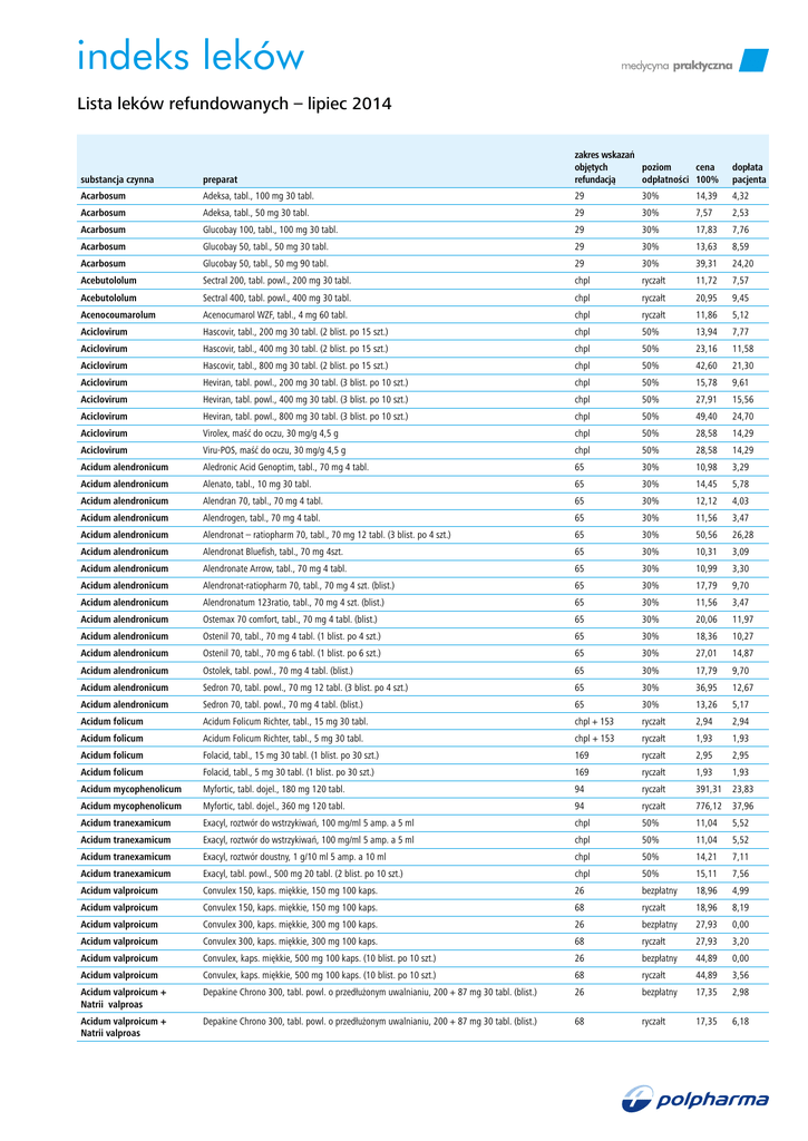 indeks leków Lista leków refundowanych – lipiec 2014 substancja czynna preparat zakres wskazań objętych poziom cena refundacją odpłatności 100% dopłata pacjenta Acarbosum Adeksa, tabl., 100 mg 30 tabl. 29 30% 14,39 4,32 Acarbosum Adeksa, tabl., 50 mg 30 tabl. 29 30% 7,57 2,53 7,76 Acarbosum Glucobay 100, tabl., 100 mg 30 tabl. 29 30% 17,83 Acarbosum Glucobay 50, tabl., 50 mg 30 tabl. 29 30% 13,63 8,59 Acarbosum Glucobay 50, tabl., 50 mg 90 tabl. 29 30% 39,31 24,20 Acebutololum Sectral 200, tabl. powl., 200 mg 30 tabl. chpl ryczałt 11,72 7,57 Acebutololum Sectral 400, tabl. powl., 400 mg 30 tabl. chpl ryczałt 20,95 9,45 Acenocoumarolum Acenocumarol WZF, tabl., 4 mg 60 tabl. chpl ryczałt 11,86 5,12 Aciclovirum Hascovir, tabl., 200 mg 30 tabl. (2 blist. po 15 szt.) chpl 50% 13,94 7,77 Aciclovirum Hascovir, tabl., 400 mg 30 tabl. (2 blist. po 15 szt.) chpl 50% 23,16 11,58 Aciclovirum Hascovir, tabl., 800 mg 30 tabl. (2 blist. po 15 szt.) chpl 50% 42,60 21,30 Aciclovirum Heviran, tabl. powl., 200 mg 30 tabl. (3 blist. po 10 szt.) chpl 50% 15,78 9,61 Aciclovirum Heviran, tabl. powl., 400 mg 30 tabl. (3 blist. po 10 szt.) chpl 50% 27,91 15,56 Aciclovirum Heviran, tabl. powl., 800 mg 30 tabl. (3 blist. po 10 szt.) chpl 50% 49,40 24,70 Aciclovirum Virolex, maść do oczu, 30 mg/g 4,5 g chpl 50% 28,58 14,29 Aciclovirum Viru‑POS, maść do oczu, 30 mg/g 4,5 g chpl 50% 28,58 14,29 Acidum alendronicum Aledronic Acid Genoptim, tabl., 70 mg 4 tabl. 65 30% 10,98 3,29 Acidum alendronicum Alenato, tabl., 10 mg 30 tabl. 65 30% 14,45 5,78 4,03 Acidum alendronicum Alendran 70, tabl., 70 mg 4 tabl. 65 30% 12,12 Acidum alendronicum Alendrogen, tabl., 70 mg 4 tabl. 65 30% 11,56 3,47 Acidum alendronicum Alendronat – ratiopharm 70, tabl., 70 mg 12 tabl. (3 blist. po 4 szt.) 65 30% 50,56 26,28 Acidum alendronicum Alendronat Bluefish, tabl., 70 mg 4szt. 65 30% 10,31 3,09 Acidum alendronicum Alendronate Arrow, tabl., 70 mg 4 tabl. 65 30% 10,99 3,30 Acidum alendronicum Alendronat‑ratiopharm 70, tabl., 70 mg 4 szt. (blist.) 65 30% 17,79 9,70 Acidum alendronicum Alendronatum 123ratio, tabl., 70 mg 4 szt. (blist.) 65 30% 11,56 3,47 Acidum alendronicum Ostemax 70 comfort, tabl., 70 mg 4 tabl. (blist.) 65 30% 20,06 11,97 Acidum alendronicum Ostenil 70, tabl., 70 mg 4 tabl. (1 blist. po 4 szt.) 65 30% 18,36 10,27 Acidum alendronicum Ostenil 70, tabl., 70 mg 6 tabl. (1 blist. po 6 szt.) 65 30% 27,01 14,87 Acidum alendronicum Ostolek, tabl. powl., 70 mg 4 tabl. (blist.) 65 30% 17,79 9,70 Acidum alendronicum Sedron 70, tabl. powl., 70 mg 12 tabl. (3 blist. po 4 szt.) 65 30% 36,95 12,67 Acidum alendronicum Sedron 70, tabl. powl., 70 mg 4 tabl. (blist.) 65 30% 13,26 5,17 Acidum folicum Acidum Folicum Richter, tabl., 15 mg 30 tabl. chpl + 153 ryczałt 2,94 2,94 Acidum folicum Acidum Folicum Richter, tabl., 5 mg 30 tabl. chpl + 153 ryczałt 1,93 1,93 Acidum folicum Folacid, tabl., 15 mg 30 tabl. (1 blist. po 30 szt.) 169 ryczałt 2,95 2,95 1,93 Acidum folicum Folacid, tabl., 5 mg 30 tabl. (1 blist. po 30 szt.) 169 ryczałt 1,93 Acidum mycophenolicum Myfortic, tabl. dojel., 180 mg 120 tabl. 94 ryczałt 391,31 23,83 Acidum mycophenolicum Myfortic, tabl. dojel., 360 mg 120 tabl. 94 ryczałt 776,12 37,96 Acidum tranexamicum Exacyl, roztwór do wstrzykiwań, 100 mg/ml 5 amp. a 5 ml chpl 50% 11,04 5,52 Acidum tranexamicum Exacyl, roztwór do wstrzykiwań, 100 mg/ml 5 amp. a 5 ml chpl 50% 11,04 5,52 Acidum tranexamicum Exacyl, roztwór doustny, 1 g/10 ml 5 amp. a 10 ml chpl 50% 14,21 7,11 Acidum tranexamicum Exacyl, tabl. powl., 500 mg 20 tabl. (2 blist. po 10 szt.) chpl 50% 15,11 7,56 Acidum valproicum Convulex 150, kaps. miękkie, 150 mg 100 kaps. 26 bezpłatny 18,96 4,99 Acidum valproicum Convulex 150, kaps. miękkie, 150 mg 100 kaps. 68 ryczałt 18,96 8,19 Acidum valproicum Convulex 300, kaps. miękkie, 300 mg 100 kaps. 26 bezpłatny 27,93 0,00 Acidum valproicum Convulex 300, kaps. miękkie, 300 mg 100 kaps. 68 ryczałt 27,93 3,20 Acidum valproicum Convulex, kaps. miękkie, 500 mg 100 kaps. (10 blist. po 10 szt.) 26 bezpłatny 44,89 0,00 Acidum valproicum Convulex, kaps. miękkie, 500 mg 100 kaps. (10 blist. po 10 szt.) 68 ryczałt 44,89 3,56 Acidum valproicum + Natrii valproas Depakine Chrono 300, tabl. powl. o przedłużonym uwalnianiu, 200 + 87 mg 30 tabl. (blist.) 26 bezpłatny 17,35 2,98 Acidum valproicum + Natrii valproas Depakine Chrono 300, tabl. powl. o przedłużonym uwalnianiu, 200 + 87 mg 30 tabl. (blist.) 68 ryczałt 17,35 6,18 Acidum valproicum + Natrii valproas Depakine Chrono 500, tabl. powl. o przedłużonym uwalnianiu, 333 + 145 mg 30 tabl. (3 blist. po 10 szt.) 26 bezpłatny 23,95 0,00 Acidum valproicum + Natrii valproas Depakine Chrono 500, tabl. powl. o przedłużonym uwalnianiu, 333 + 145 mg 30 tabl. (3 blist. po 10 szt.) 68 ryczałt 23,95 3,20 Acidum valproicum + Natrii valproas Depakine Chronosphere 100, granulat o przedłużonym uwalnianiu, 66,66 + 29,03 mg 30 sasz. po 303 mg 26 bezpłatny 6,76 1,97 Acidum valproicum + Natrii valproas Depakine Chronosphere 100, granulat o przedłużonym uwalnianiu, 66,66 + 29,03 mg 30 sasz. po 303 mg 68 ryczałt 6,76 5,17 Acidum valproicum + Natrii valproas Depakine Chronosphere 1000, granulat o przedłużonym uwalnianiu, 666,60 + 290,27 mg 30 sasz. po 3030 mg 26 bezpłatny 52,45 4,55 Acidum valproicum + Natrii valproas Depakine Chronosphere 1000, granulat o przedłużonym uwalnianiu, 666,60 + 290,27 mg 30 sasz. po 3030 mg 68 ryczałt 52,45 7,75 Acidum valproicum + Natrii valproas Depakine Chronosphere 250, granulat o przedłużonym uwalnianiu, 166,76 + 72,61 mg 30 sasz. po 758 mg 26 bezpłatny 16,50 4,52 Acidum valproicum + Natrii valproas Depakine Chronosphere 250, granulat o przedłużonym uwalnianiu, 166,76 + 72,61 mg 30 sasz. po 758 mg 68 ryczałt 16,50 7,72 Acidum valproicum + Natrii valproas Depakine Chronosphere 500, granulat o przedłużonym uwalnianiu, 333,30 + 145,14 mg 30 sasz. po 1515 mg 26 bezpłatny 27,41 3,46 Acidum valproicum + Natrii valp