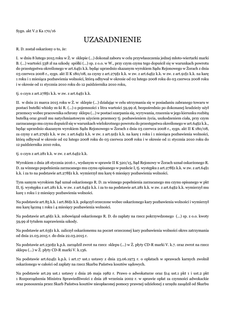 Apelacje od powyższego wyroku wywiedli oskarżony R. D. oraz jego obrońca.
