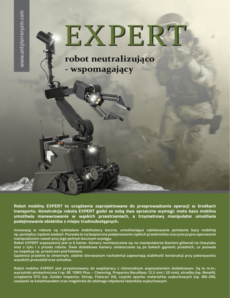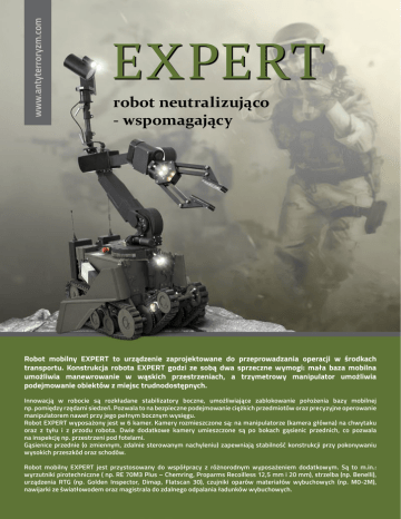 robot neutralizująco - wspomagający Robot mobilny EXPERT to urządzenie zaprojektowane do przeprowadzania operacji w środkach transportu. Konstrukcja robota EXPERT godzi ze sobą dwa sprzeczne wymogi: mała baza mobilna umożliwia manewrowanie w wąskich przestrzeniach, a trzymetrowy manipulator umożliwia podejmowanie obiektów z miejsc trudnodostępnych. Innowacją w robocie są rozkładane stabilizatory boczne, umożliwiające zablokowanie położenia bazy mobilnej np. pomiędzy rzędami siedzeń. Pozwala to na bezpieczne podejmowanie ciężkich przedmiotów oraz precyzyjne operowanie manipulatorem nawet przy jego pełnym bocznym wysięgu. Robot EXPERT wyposażony jest w 6 kamer. Kamery rozmieszczone są: na manipulatorze (kamera główna) na chwytaku oraz z tyłu i z przodu robota. Dwie dodatkowe kamery umieszczone są po bokach gąsienic przednich, co pozwala na inspekcję np. przestrzeni pod fotelami. Gąsienice przednie (o zmiennym, zdalnie sterowanym nachyleniu) zapewniają stabilność konstrukcji przy pokonywaniu wysokich przeszkód oraz schodów. Robot mobilny EXPERT jest przystosowany do współpracy z różnorodnym wyposażeniem dodatkowym. Są to m.in.: wyrzutniki pirotechniczne ( np. RE 70M3 Plus – Chemring, Proparms Recoilless 12,5 mm i 20 mm), strzelba (np. Benelli), urządzenia RTG (np. Golden Inspector, Dimap, Flatscan 30), czujniki oparów materiałów wybuchowych (np. M0-2M), nawijarki ze światłowodem oraz magistrala do zdalnego odpalania ładunków wybuchowych. Dane techniczne EXPERT robot neutralizująco - wspomagający Złącza: Robot Mobilny EXPERT Wymiary (długość x szerokość x wysokość): W pozycji złożonej: szerokość robota bez stabilizatorów bocznych: (demontowanych ręcznie) Masa (bez wyposażenia dodatkowego) robota wraz z manipulatorem, kamerą główną i akumulatorem: Zasięg transmisji radiowej: Czas operacyjny (zależny od rodzaju misji): Prędkość (dwa zakresy): tryb operacyjny: tryb normalny: Stopień ochrony: Akumulator: Pojemność akumulatora: Orientacyjny czas ładowania akumulatorów: System napędu: gąsienicowy z przednimi uchylnymi gąsienicami zakres ruchu przednich uchylnych gąsienic: Akcesoriów, sterująco/zasilające, diagnostyczne 88x47x78 cm 43 cm 197 kg do 800 m ok. 4 h do 0,5 km/h do 2 km/h IP 65 24 V (2 x 12 V) 45 Ah 5h +90°/-30° Mobilność: Pokonywanie przeszkód pionowych: Pokonywanie schodów: Zdolność pokonywania pochyłości: przodem tyłem Dopuszczalny przechył boczny: Prześwit: do 14 cm do 30° do 25° do 35° do 29° 7 cm Manipulator: Maksymalny udźwig w pełni złożonego z przodu: 15 kg w pełni rozłożonego z przodu: 8 kg Maksymalny zasięg w pionie: licząc od podłoża: 2,9 m w poziomie: licząc od osi obrotu: 2,3 m Liczba stopni swobody (zdalnie sterowanych): 6 + zacisk szczęk chwytaka Wysuw górnego ramienia manipulatora: 58 cm Rozwarcie szczęk chwytaka: 35 cm Kamery: 6 szt. Główna: ruchoma kamera PTZ, kolorowa, 22 x zoom optyczny, z oświetlaczami LED IR lub LED światła białego, o zmiennej ogniskowej Zakres ruchu kamery: w osi pionowej 350° w poziomej 150° Z głowicą kamery jest zintegrowany mikrofon Chwytakowa: kolorowa , z oświetlaczami LED IR lub LED światła białego, z wbudowanym podgrzewaczem Przednia jezdna: kolorowa, z oświetlaczami LED IR lub LED światła białego, z wbudowanym podgrzewaczem Tylna jezdna: kolorowa, z oświetlaczami LED IR lub LED światła białego, z wbudowanym podgrzewaczem Dwie kamery umieszczone na bokach przednich uchylnych gąsienic, kolorowe, szerokokątne, z oświetlaczami LED IR lub LED światła białego, z wbudowanymi podgrzewaczami Stanowisko operatorskie Wymiary (długość x szerokość x wysokość): podczas pracy: po złożeniu: Masa stanowiska operatorskiego: Operacyjny czas pracy: Akumulator: Monitor LCD: 52x63x58 cm 52x43x22 cm 24 kg ok. 3 h 24 V (2 x 12 V) 12 Ah kolorowy 15” Złącza: Audio/Video We/Wy, anten zewnętrznych, sygnałowe, zasilające Wyposażenie standardowe Zewnętrzna ładowarka akumulatora: - bazy mobilnej - stanowiska operatorskiego rozkładany stelaż z funkcją podstawy pod stanowisko operatorskie Kabel zasilający 5 m, 230 V Kabel sterujący 5 m Wyposażenie opcjonalne Uchwyt do bezodrzutowego wyrzutnika pirotechnicznego z kamerą i wskaźnikami laserowymi (RE 70M3 Plus – Chemring, Proparms Recoilless 12,5 mm i 20 mm *) Uchwyt do strzelby z kamerą i celownikiem kolimatorowym (Benelli M4 Super 90 *) Uchwyty do urządzeń RTG (Golden Inspector, Dimap, Flatscan 30 *) Uchwyt do czujnika oparów materiałów wybuchowych (M0-2M *) Uchwyt do czujnika skażeń chemicznych (AP2C *) Wymienne szczęki (przedłużane, kształtowe) Przewód sterowniczy 100 m (maksymalnie do 150 m) Magistrala do zdalnego odpalania ładunków wybuchowych Zestaw anten zewnętrznych Cyfrowy rejestrator audio/video Wybijak do szyb Pilot – mały panel sterowniczy *inne na zapytanie Deklarujemy gotowość modyfikacji robota oraz wyposażenia opcjonalnego zgodnie z potrzebami użytkownika. W związku ze strategią ciągłego udoskonalania produktów, PIAP zastrzega sobie prawo do zmiany specyfikacji, wyglądu oraz konstrukcji produktów opisanych w niniejszej ulotce bez wcześniejszego powiadomienia. Przemysłowy Instytut Automatyki i Pomiarów PIAP Dział Sprzedaży i Marketingu Produktów Specjalnych Aleje Jerozolimskie 202, 02-486 Warszawa Tel. (22) 874 03 26 Fax. (22) 874 03 40 e-mail: [email protected]
