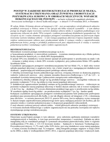 POSTĘP W ZAKRESIE RESTRUKTURYZACJI PRODUKCJI MLEKA, SYSTEMACH UTRZYMANIA ORAZ ŻYWIENIA I ROBOTYZACJI POZYSKIWANIA SUROWCA W OBORACH MLECZNYCH. WSPARCIE DOKONUJĄCEGO SIĘ POSTĘPU – na bazie wybranych zagadnień szkolenia: Nowoczesne technologie w chowie bydła mlecznego – w dniach 17-19 września 2013, w Poznaniu W całym, blisko 10-letnim okresie od integracji z UE – jest on największy wśród głównych sektorów produkcji zwierzęcej w Polsce; mimo iż nie sprzyja mu kilka ważnych czynników – w tym słabszy postęp na drugim etapie tworzenia wartości dodanej sektora mleka (z wyjątkiem podlaskiego) oraz ograniczony (obecnie do około 78%) związek z rynkiem prowadzonej działalności gospodarczej. Na szczęście są też i ważne elementy sprzyjające postępowi restrukturyzacyjnemu na pierwszym etapie tworzenia wartości dodanej sektora – w tym rosnąca populacja aktywna (i lepsza znajomość stada), większe zainteresowanie sektora pasz producentami mleka (i rosnąca wiedza o zapotrzebowaniu pokarmowym krów), postęp w produkcji podstawowych pasz objętościowych (i wiedzy o wartości pokarmowej tychże) i stymulujący wpływ rynków zagranicznych. RESTRUKTURYZACJA Mierzalnym wyrazem postępu restrukturyzacyjnego są m.in.: a/ koncentracja produkcji, w niezwykłym rozmiarze – wyrażona zmniejszeniem się o blisko połowę liczby dostawców hurtowych, a o około 80% bezpośrednich, b/ ponad 10%-owy dodatkowy wzrost dostaw (ponad ich podwojenie) w przeliczeniu na stado i rok – związane z jednej strony z około 20% wzrostu wydajności, przy jednocześnie blisko 10% spadku liczebności krów. Czynnikiem sprzyjającym postępowi restrukturyzacyjnemu był też bliski 1%, w skali roku wzrost udziału populacji aktywnej w pogłowiu krów; ten z kolei wiązał się z następującymi dodatkowymi skutkami – poprawiającymi konkurencyjność polskiego sektora mleka: 1/ obniżką żywieniowego kosztu jednostkowego surowca; związaną również ze skuteczną poprawą walorów rynkowych surowca – przy zmianie stosunku tłuszczowo-białkowego z 1,27 do 1,23 – w warunkach żywienia intensywnego i jednocześnie energetycznie zadawalającego, 2/ dodatkową obniżką nakładu energii na kg produkowanego surowca – szczególnie widoczne na poziomie wydajności 7-8 tys. kg mleka (a więc naszej populacji aktywnej), 3/ dodatkowym ograniczeniem produkcji metanu na kg produkowanego surowca – widocznym na poziomie wydajności naszej populacji aktywnej w bardzo dużym zakresie; tak iż wzrost wydajności z 6 do 8 tys. kg – skutkuje 21%-owym obniżeniem produkcji tego gazu w przeliczeniu na kg mleka. W rezultacie ogólny koszt kg mleka – po przekroczeniu wydajności 7 tys. kg – bardzo spada. Kolejnym czynnikiem sprzyjającym postępowi restrukturyzacyjnemu było praktycznie podwojenie produkcji pasz przemysłowych dla bydła, w nie tak długim okresie od integracji z UE; z dominacją pasz dla krów – w sezonie paszowym 2012/13, prawie 84%-ową. Jest to najlepszy wyraz rosnącego w dużym tempie zapotrzebowania pokarmowego krów (przy malejącej przecież ich liczbie), jak też zarazem wiedzy o wartości pokarmowej pasz w dyspozycji gospodarstw mleczarskich. Z racji obecnie czołowej pozycji sektora mleka – wśród głównych sektorów produkcji zwierzęcej – w tworzeniu dochodu bilansowego z rynków zagranicznych nie ma potrzeby rozwijania ich wpływu stymulującego postęp restrukturyzacyjny. SYSTEMY UTRZYMANIA Omawiane są pod kątem postępu w tym zakresie – przy założeniu spełniania minimum warunków zoohigienicznych w budynku, w tym jego powierzchni, temperatury i wentylacji. Zakłada się także marginalną rolę (w warunkach postępu w systemach utrzymania) pastwiskowania, które w regionie wielkopolskim (776 obór, z 113-114 krowami średnio – badanych w Instytucie TechnologicznoPrzyrodniczym) dotyczy 11,7% stad i tylko 9,8% krów; jest więc dodatkowo coraz mniej popularne – w miarę wzrostu liczebności stad. To wstępem – dalej fotografie postępu: najpierw w kraju (2010 na tle 2002), a dalej w wielkopolskim (2010 i 2012, z ujęciem populacji aktywnej i większych stad). W okresie poprzedzającym integrację z UE (105-106 tys. obór badanych w skali kraju) dominował uwięziowy system utrzymania (98%) – przy zaledwie półtora procenta wolnostanowiskowego. 80% nieomal – z badanych obór stosowało płytką ściółkę. Po 8 latach (pełniejsze dane z prawie 728 tys. obór) odnotowano już prawie 11% obór wolnostanowiskowych – głównie w większych obiektach produkcyjnych (ponad 15% krów w tym systemie utrzymania); z nich tylko 10% miało szczelinowe podłogi. Wielkopolskie (2010; ww. badanie) miało mniej – bo poniżej 13% krów utrzymywanych w oborach wolnostanowiskowych – przy czym bezściołowo utrzymywano marginalną ilość, około 2 tys. krów. W tymże samym regionie (ww. badanie 776 obór) bezściołowo utrzymywano większą ilość 5-6% krów, ale też bardzo niewielką. Jednak charakterystyczna jest tutaj dominacja wolnowybiegowego utrzymania (56,3% stad i aż 63,4% krów). W tym samym kierunku ewoluowały obory pod kontrolą użytkowości w wielkopolskim (średnio o 14 krów liczebniejsze od ww. w badaniu) – choć bardziej zdecydowanie: niemal 70% stad i ponad ¾ krów utrzymywanych wolnowybiegowo. Bezściołowo utrzymywano w tych oborach nieco więcej krów, ale nie była to właściwie zmiana jakościowa. Reasumując, postępowi restrukturyzacyjnemu towarzyszy ewolucja obór ku systemowi utrzymania wolnostanowiskowego – dominującego na obiektach z produkcją rynkową ponad pół miliona, a z całą pewnością – powyżej miliona kg dostaw rynkowych surowca. To zarazem te obory, w których robotyzacja pozyskiwania surowca i automatyzacja żywienia mają największą przyszłość (poniżej). AUTOMATYZACJA ŻYWIENIA Postępuje w związku z coraz lepszą organizacją żywienia – związaną z rosnącą wydajności