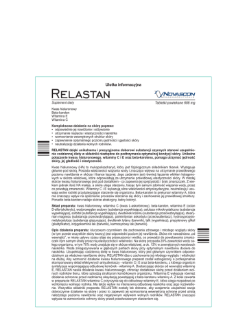 Ulotka informacyjna Suplement diety Tabletki powlekane 688 mg Kwas hialuronowy Beta-karoten Witamina E Witamina C Kompleksowe działanie na skórę poprzez: ••odpowiednie jej nawilżanie i odżywianie ••utrzymanie napięcia i elastyczności naskórka ••wzmocnienie wewnętrznych struktur skóry ••zapewnienie optymalnego poziomu jędrności i gęstości skóry ••neutralizację działania wolnych rodników. RELASTAN dzięki unikalnemu i precyzyjnemu doborowi substancji czynnych stanowi uzupełnienie codziennej diety w składniki niezbędne do podtrzymania optymalnej kondycji skóry. Unikalne połączenie kwasu hialuronowego, witaminy C i E oraz beta-karotenu, pomaga utrzymać jędrność skóry, jej gładkość i elastyczność. Kwas hialuronowy (HA) to mukopolisacharyd, który jest fizjologicznym składnikiem tkanek. Występuje głównie pod skórą. Posiada właściwości wiązania wody i znacząco wpływa na utrzymanie prawidłowego poziomu nawilżenia w skórze i tkance łącznej. Jego zadaniem jest również łączenie włókien kolagenowych w skórze właściwej, które odpowiadają za utrzymanie prawidłowej elastyczności skóry. W młodej skórze kwasu hialuronowego jest pod dostatkiem - co zapewnia jej sprężystość i brak zmarszczek. Z wiekiem jednak ilość HA maleje, a skóra ulega starzeniu, tracąc tym samym zdolność wiązania wody, przez co powstają zmarszczki. Witaminy C i E wykazują silne właściwości antyoksydacyjne, neutralizują i usuwają wolne rodniki przyśpieszające starzenie się organizmu. Beta-karoten to prekursor witaminy A, która ma znaczący wpływ na opóźnianie procesów starzenia się skóry i zachowanie jej prawidłowej struktury. Ponadto beta-karoten nadaje skórze atrakcyjny, ładny koloryt. Skład preparatu: kwas hialuronowy, witamina C (kwas L-askorbinowy), beta-karoten, witamina E (octan D-alfa-tokoferylu), wodorowęglan sodowy (substancja wypełniająca), celuloza mikrokrystaliczna (substancja wypełniająca), sorbitol (substancja wypełniająca), dwutlenek krzemu (substancja przeciwzbrylająca), stearynian magnezu (substancja przeciwzbrylająca), palminitynian askorbylu (przeciwutleniacz), hydroxypropylometyloceluloza (substancja glazurująca), dwutlenek tytanu (barwnik), talk (wypełniacz), propylenowy glikol (plastyfikator), indygokarmina lak (barwnik), karmosynowy lak (barwnik). Opis działania preparatu: kluczowym czynnikiem dla zachowania zdrowego i młodego wyglądu skóry (w tym przede wszystkim skóry twarzy) jest odpowiedni poziom jej nawilżenia. Skóra nie nawadniana „od wewnątrz”, w miarę upływu czasu staje się przesuszona i wiotka, co prowadzi do powstawania zmarszczek i tym samym utraty przez nią elastyczności i witalności. Na skórę przypada 20% zawartości wody całego organizmu, w tym 70% wody znajduje się w skórze właściwej, a ok. 13% w zewnętrznych warstwach naskórka. Woda zmagazynowana w głębszych partiach skóry przy optymalnym nawilżeniu dociera do naskórka. Uzupełniając codzienną dietę w kwas hialuronowy, który jest głównym czynnikiem odpowiedzialnym za właściwe nawilżenie skóry, RELASTAN dba o zachowanie jej młodego wyglądu i witalności na dłużej. Aby wzmocnić działanie kwasu hialuronowego preparat został wzbogacony o profesjonalnie skomponowany skład efektywnych antyutleniaczy - witamin C i E oraz beta-karotenu, z którego organizm syntetyzuje wspomagającą odbudowę komórek - witaminę A. Dostarczając skórze od wewnątrz witaminę E, RELASTAN nasila działanie kwasu hialuronowego, chroniąc dodatkowo skórę przed działaniem wolnych rodników tlenu, które szkodzą strukturom komórkowym organizmu. Witamina E wykazuje również działanie ochronne przed nadmierną oksydacją powstającej z beta-karotenu witaminy A. Z kolei zawarta w preparacie RELASTAN witamina C przyczynia się do odbudowy witaminy E, która ulega rozpadowi po wchłonięciu wolnego rodnika. Ma także wpływ na intensywną odbudowę naskórka oraz jego rozświetlenie. Wszystkie składniki preparatu RELASTAN zostały tak dobrane, aby wzajemnie uzupełniać swoje dobroczynne działanie na skórę i przez to zapewnić jej wzmocnioną wewnętrzną ochronę przed utratą należytego poziomu nawilżenia oraz negatywnym wpływem wolnych rodników. RELASTAN znacząco wpływa na wzmocnienie ochrony skóry przed przedwczesnym starzeniem się. RELASTAN polecany jest osobom: ••u których następuje naturalne obniżenie poziomu nawilżenia skóry ••z tzw. suchą skórą ••narażonym na nadmierne wysuszenie skóry w związku z długim przebywaniem na słońcu, w pomieszczeniach klimatyzowanych lub korzystającym z basenów z wodą chlorowaną, także osobom często korzystającym z solarium ••dojrzałym, u których następuje zmniejszenie elastyczności skóry Opis działania kwasu hialuronowego: jest naturalnym składnikiem występującym we wszystkich organizmach żywych i najsilniejszą substancją nawilżającą, ponieważ potrafi związać od 1000 do 4000 tysięcy razy więcej wody niż wynosi jego masa, tworząc z nią gęsty śluz lub żel. HA jest zaliczany do grupy polisacharydów, należy do glukozaminoglikanów (GAG) zwanych mukopolisacharydami. Jego największe ilości (ok. 50%) znajdują się w skórze, z tym że jego zawartość maleje wraz z wiekiem. W wyniku tego skóra staje się pozbawiona odpowiedniego nawilżenia, przez co łatwiej wysusza się i robi podatna na zmarszczki. To właśnie kwas hialuronowy dba o odpowiednie nawilżenie tkanek, łączy włókna elastynowe i kolagenowe w skórze właściwej tworząc proteoglikan, odpowiadający za elastyczność oraz odpowiednie napięcie skóry. Opis działania beta-karotenu: jest prowitaminą witaminy A, czyli substancją, z której organizm może syntetyzować witaminę A. Należy do antyutleniaczy i z racji tej właściwości wspólnie z witaminą E i C opóźnia procesy starzenia wzmacniając barierę antyoks