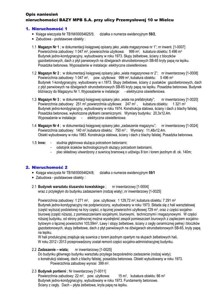 Opis naniesień nieruchomości BAZY MPB S.A. przy ulicy Przemysłowej 10 w Mielcu 1. Nieruchomość 1 • Księga wieczysta Nr TB1M/00054625/5; • Zabudowa - podstawowe obiekty : działka o numerze ewidencyjnym 59/2, 1.1 Magazyn Nr 1 ; w dokumentacji księgowej opisany jako „wiata magazynowa nr 1”; nr inwent. [1-0007] Powierzchnia zabudowy: 1 047 m2, powierzchnia użytkowa: 999 m2, kubatura obiektu: 5 496 m3 Budynek jedno-kondygnacyjny, wybudowany w roku 1973. Słupy żelbetowe, ściany z bloczków gazobetonowych, dach z płyt panwiowych na dźwigarach strunobetonowych SB-65 kryty papą na lepiku. Posadzka betonowa. Wyposażenie w instalacje: elektryczna oświetleniowa. 1.2 Magazyn Nr 2 ; w dokumentacji księgowej opisany jako „wiata magazynowa nr 2”; nr inwentarzowy [1-0008] Powierzchnia zabudowy: 1 047 m2, pow. użytkowa: 999 m2, kubatura obiektu: 5 496 m3 Budynek 1-kondygnacyjny, wybudowany w r.1973. Słupy żelbetowe, ściany z pustaków gazobetonowych, dach z płyt panwiowych na dźwigarach strunobetonowych SB-65 kryty papą na lepiku. Posadzka betonowa. Budynek bliźniaczy do Magazynu Nr 1. Wyposażenie w instalacje: - elektryczna oświetleniowa. 1.3 Magazyn Nr 3 ; w dokumentacji księgowej opisany jako „wiata na prefabrykaty”; nr inwentarzowy [1-0020] Powierzchnia zabudowy: 251 m2, powierzchnia użytkowa: 247 m2 , kubatura obiektu: 1 321 m3 Budynek jedno-kondygnacyjny, wybudowany w roku 1974. Konstrukcja stalowa, ściany i dach z blachy falistej. Posadzka betonowa, wykończona płytkami ceramicznymi. Wymiary budynku: 20,3x12,4m. Wyposażenie w instalacje: - elektryczna oświetleniowa. 1.4 Magazyn Nr 4 ; w dokumentacji księgowej opisany jako „zadaszenie magazynu”; nr inwentarzowy [1-0024] Powierzchnia zabudowy: 140 m2, kubatura obiektu: 750 m3 ; Wymiary: 11,48x12,4m. Obiekt wybudowany w roku 1983. Konstrukcja stalowa, ściany i dach z blachy falistej. Posadzka betonowa. 1.5 Inne: - studnia głębinowa służąca potrzebom betoniarni; odstojnik ścieków technologicznych służący potrzebom betoniarni, plac składowy utwardzony z suwnicą bramową o udźwigu 8 ton i torem jezdnym dł. ok. 140m; 2. Nieruchomość 2 • Księga wieczysta Nr TB1M/00054624/8; • Zabudowa - podstawowe obiekty : działka o numerze ewidencyjnym 59/1 2.1 Budynek warsztatu ślusarsko kowalskiego ; nr inwentarzowy [1-0004] wraz z przyległym do budynku zadaszeniem (rodzaj wiaty) ;nr inwentarzowy [1-0025] Powierzchnia zabudowy: 1 271 m2, pow. użytkowa: 1 129,72 m2, kubatura obiektu: 7 291 m3 Budynek jedno-kondygnacyjny nie podpiwniczony, wybudowany w roku 1973. Składa się z hali warsztatowej (część wyższa) podzielonej na trzy części, o łącznej powierzchni użytkowej 729 m2, oraz z części socjalnobiurowej (część niższa), z pomieszczeniami socjalnymi, biurowymi, technicznymi i magazynowymi. W części niższej budynku, od strony północnej można wyodrębnić zespół pomieszczeń biurowych z zapleczem socjalnobytowym o łącznej powierzchni 103,59m2, Ławy i stopy żelbetowe, ściany z cegły ceramicznej pełnej i bloczków gazobetonowych, słupy żelbetowe, dach z płyt panwiowych na dźwigarach strunobetonowych SB-65, kryty papą na lepiku. W hali produkcyjnej znajduje się suwnica z torem jezdnym opartym na słupach żelbetowych hali, W roku 2012 i 2013 przeprowadzony został remont części socjalno-administracyjnej budynku. 2.2 Zadaszenie – wiata; nr inwentarzowy [1-0025] Do budynku głównego budynku warsztatu przylega bezpośrednio zadaszenie (rodzaj wiaty); o konstrukcji stalowej, dach z blachy falistej, posadzka betonowa. Obiekt wybudowany w roku 1973. Powierzchnia zabudowy wynosi 399 m2. 2.3 Budynek portierni ; Nr inwentarzowy [1-0011] Powierzchnia zabudowy: 22 m2, pow. użytkowa: 15 m2, kubatura obiektu: 66 m3 Budynek jedno-kondygnacyjny, wybudowany w roku 1973. Fundamenty betonowe. Ściany z cegły. Dach – płyta żelbetowa, kryta papą na lepiku. 3. Nieruchomość 3 • Księga wieczysta Nr TB1M/00054626/2; • Zabudowa - podstawowe obiekty : działka o numerze ewidencyjnym 59/3, 3.1 Węzeł betoniarski (typ stacjonarny); nr inwentarzowy [5-0423] Obiekt stacjonarny typu STETTER B-303 wybudowany w roku 1988 wraz z urządzeniami technologicznymi. 3.2 Budynek - cieplak nr inwentarzowy [1-0439]; wymiary bud. 4,60x12,00m; Pz = 55,20 m2 ; Pu = 47,5m2; kubatura 165m3. 3.3 Wiata stalowa magazynowa typu ZBM-4 ; nr inwentarzowy [1-0570] Wymiary: 9,0x27,0m; powierzchnia użytkowa: 243 m2, kubatura obiektu: 972 m3 Obiekt wybudowany w roku 2000. Konstrukcja stalowa na stopach żelbetowych, dach z blachy falistej ocynkowanej bez ścian osłonowych. Posadzka betonowa. 4. Nieruchomość 4 • Księga wieczysta Nr 54 628; działka o numerze ewidencyjnym 59/5 • Zabudowa / obiekty: 1) Budynek Warsztatu Naprawczego Sprzętu Nr inwentarzowy [1-0022] Powierzchnia zabudowy: 935 m2, pow. użytkowa: 848,64 m2, kubatura obiektu: 5 677 m3 Budynek 1-kondygnacyjny nie podpiwniczony, wybudowany w roku 1973. Składa się z hali warsztatowej (część wyższa) o powierzchni 519m2 oraz z części socjalno-biurowej (część niższa), z pomieszczeniami socjalnymi, biurowymi oraz gospodarczymi i magazynowymi. Ławy i stopy żelbetowe, ściany z cegły ceramicznej pełnej i bloczków gazobetonowych, słupy żelbetowe, dach z płyt panwiowych na dźwigarach strunobetonowych SB-65, kryty papą na lepiku. W hali zamontowana jest suwnica z torem jezdnym opartym na słupach żelbetowych hali. 2) Magazyn Sprzętu (d. wiata na sprzęt) Nr inwentarzowy [1-0019] Powierzchnia zabudowy: 513 m2, pow. użytkowa: 506,4 m2 , kubatura obiektu: 2 026 m3 Obiekt wybudowany w roku 1974. Fundamenty żelbetowe wylewane. Konstrukcja stalowa słupy i wiązary stalowe kratowe. Ściany i dach z blachy falistej ocynkowanej nieocieplone, na ruszcie z kształtowników. 3) Inne ; stacja trafo słupowa 5. Nieruchomość 5 • Księga wieczysta Nr TB1M/00054629/3; • Zabudowa / obiekty: działka o numerze ewidencyjnym 59